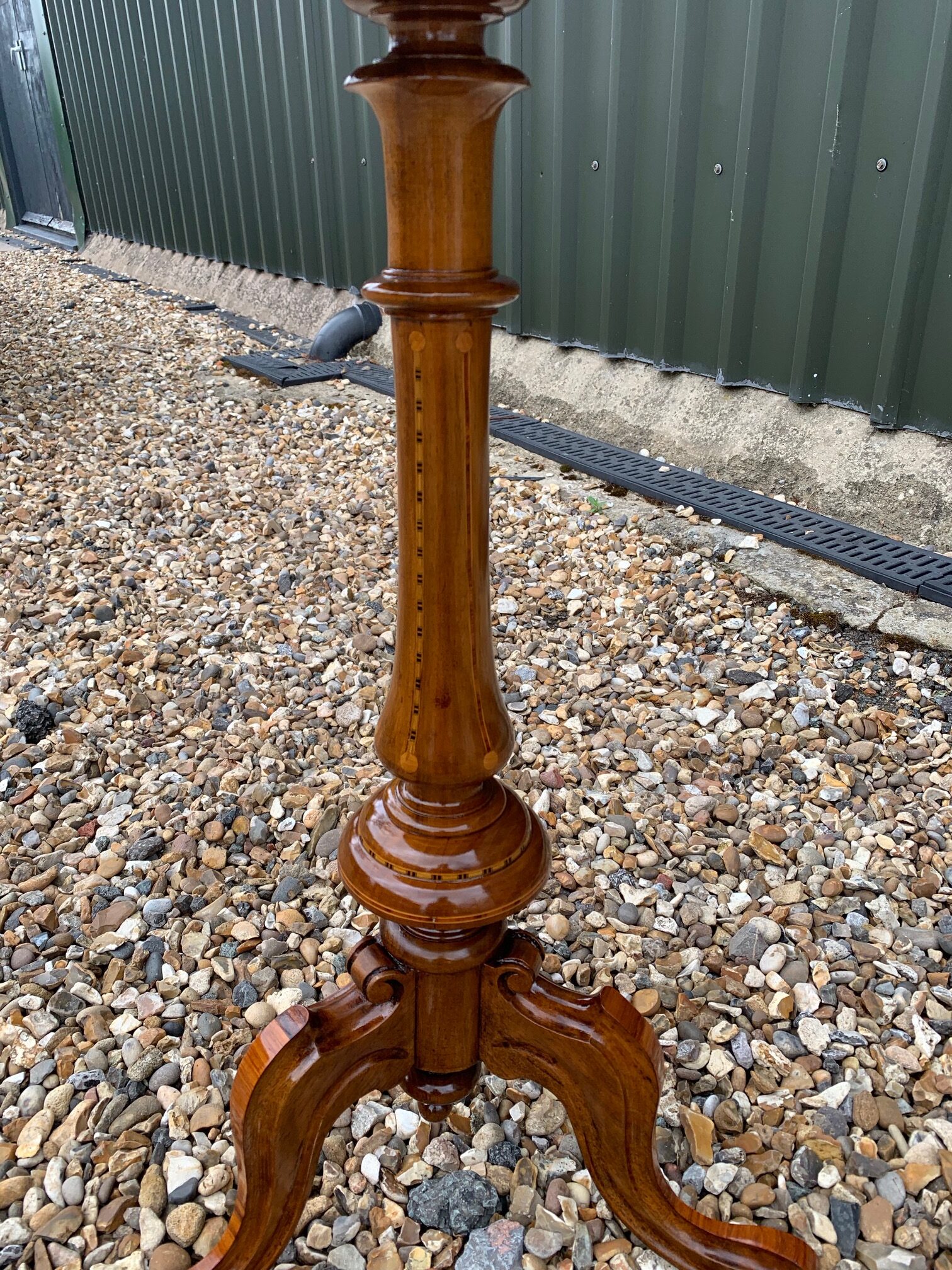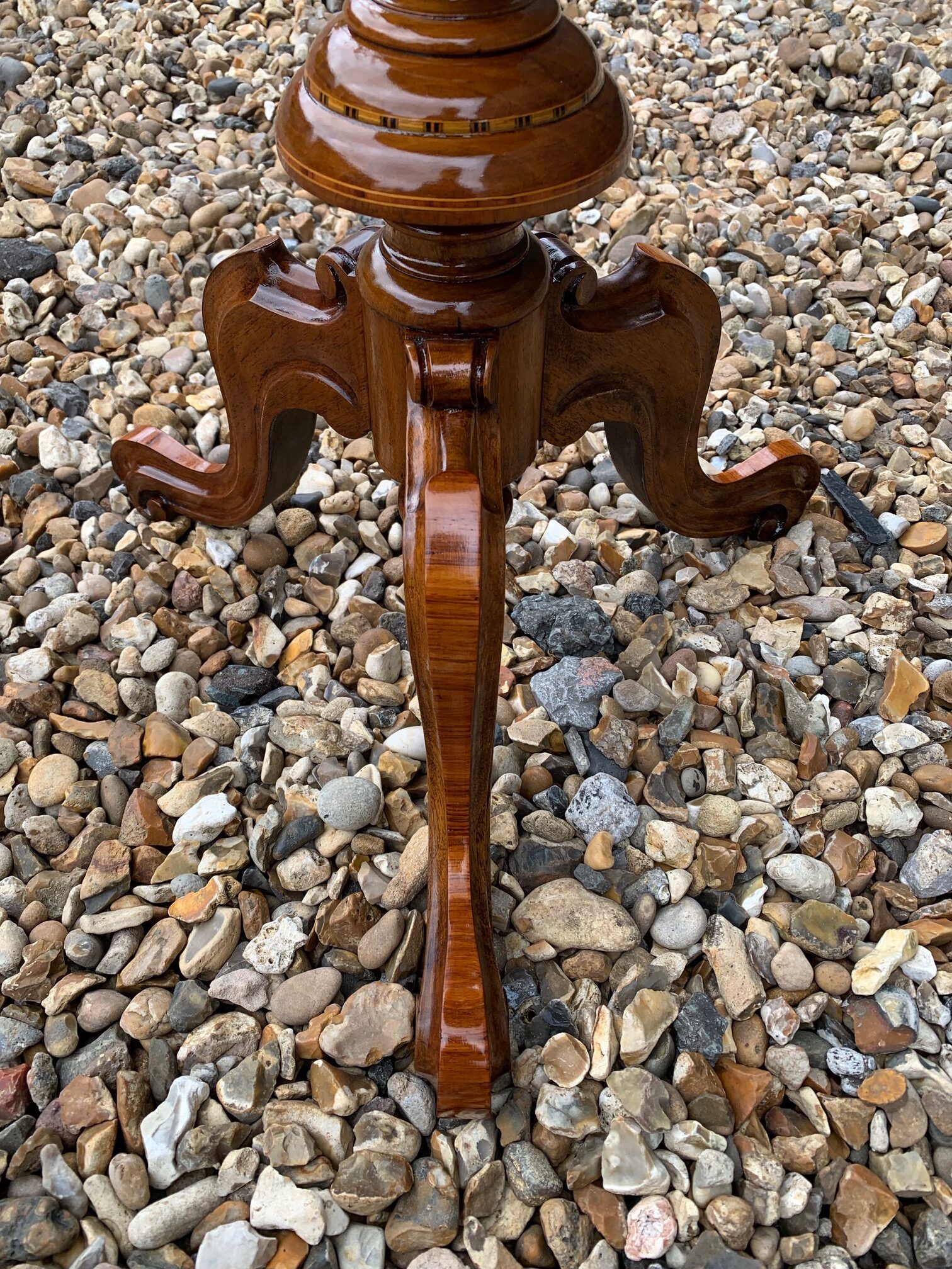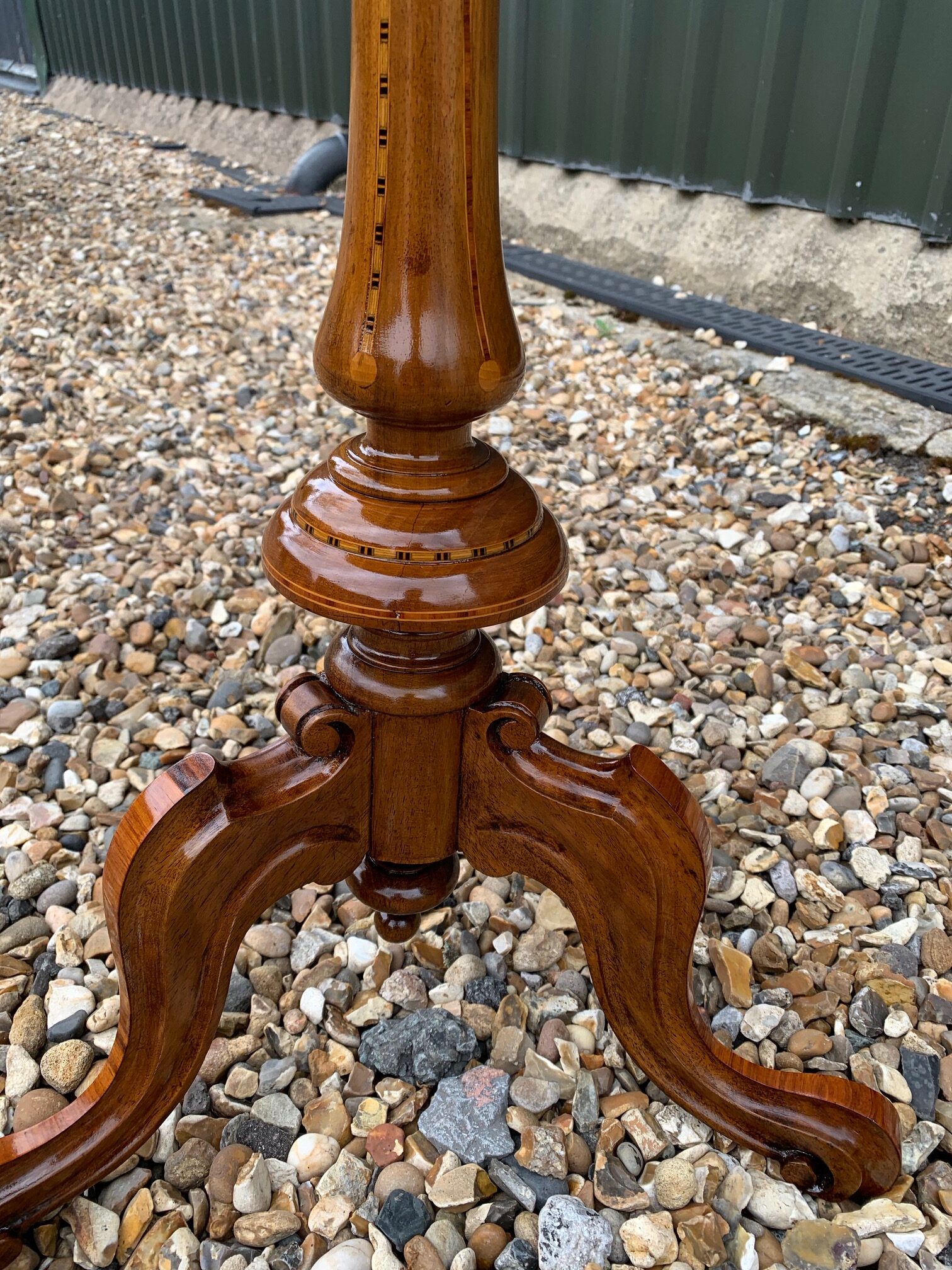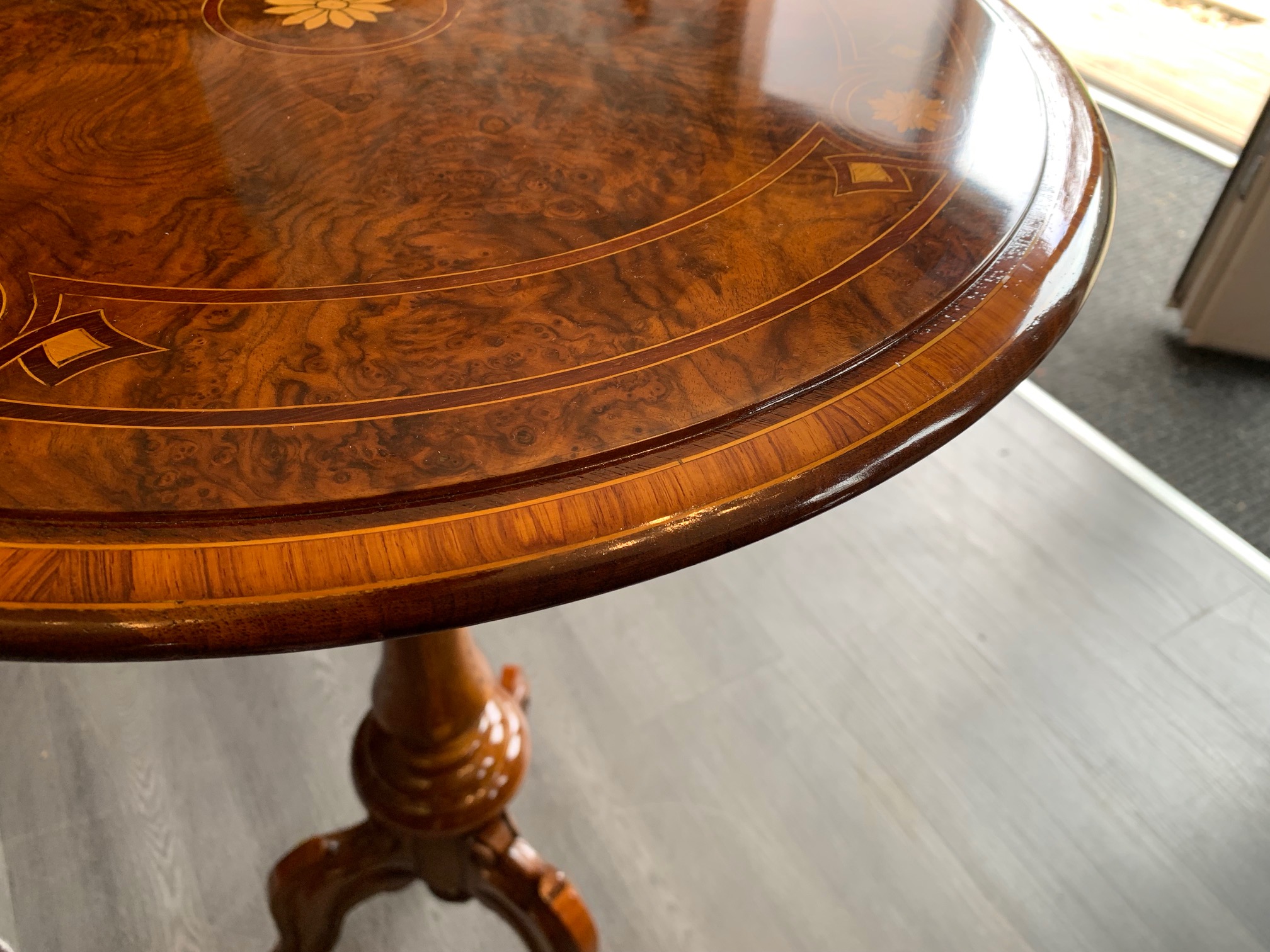 CompareA superb quality Victorian Period burr walnut and marquetry inlaid antique wine table. The circular top in striking burr walnut veneers with a purple heart and marquetry inlaid border and also banded in tulipwood to the moulded edge. Raised on a turned walnut column with chequer band and Purple Heart inlaid detail, with three French Cabriole leg supports with tulipwood banding. English circa 1870-1880, in superb condition