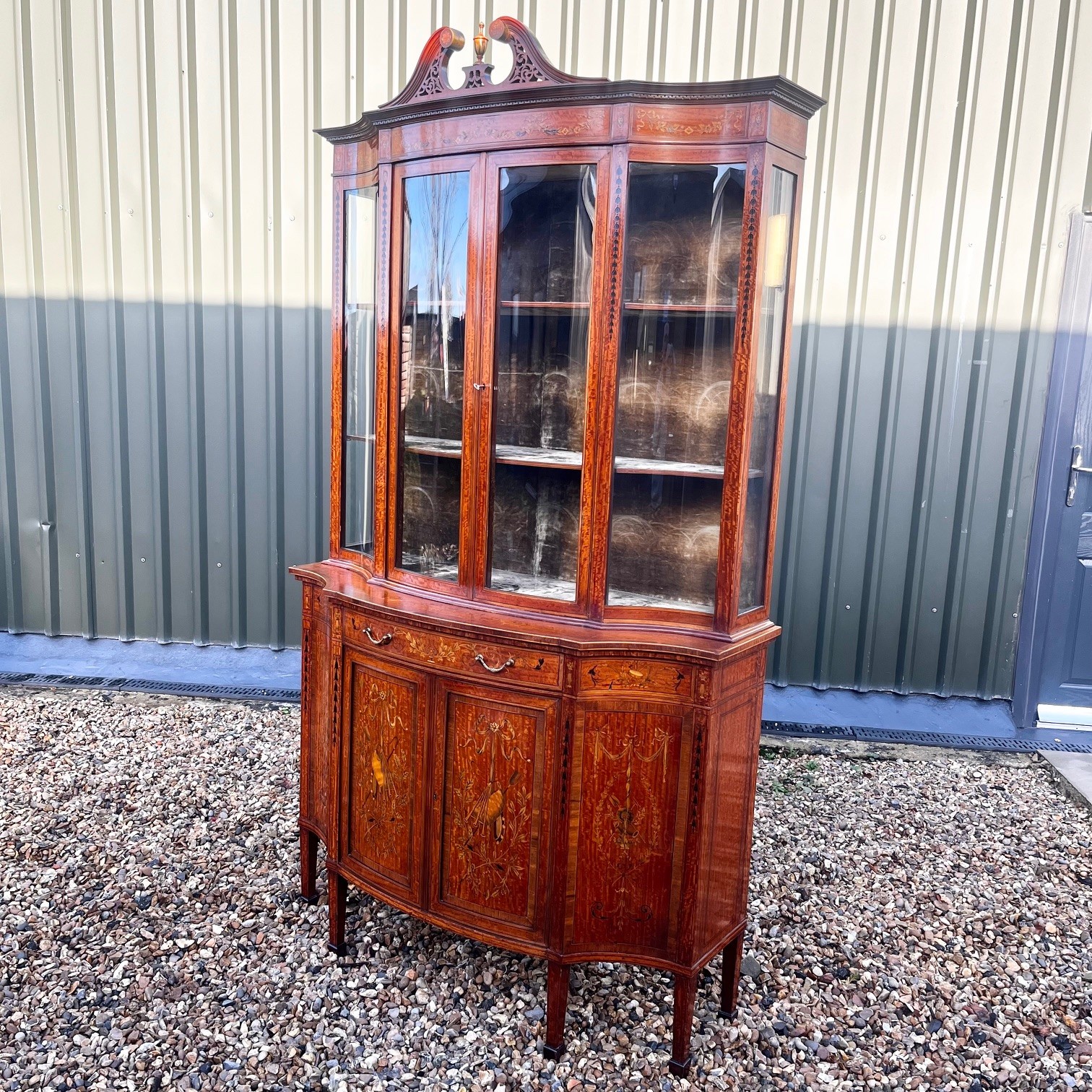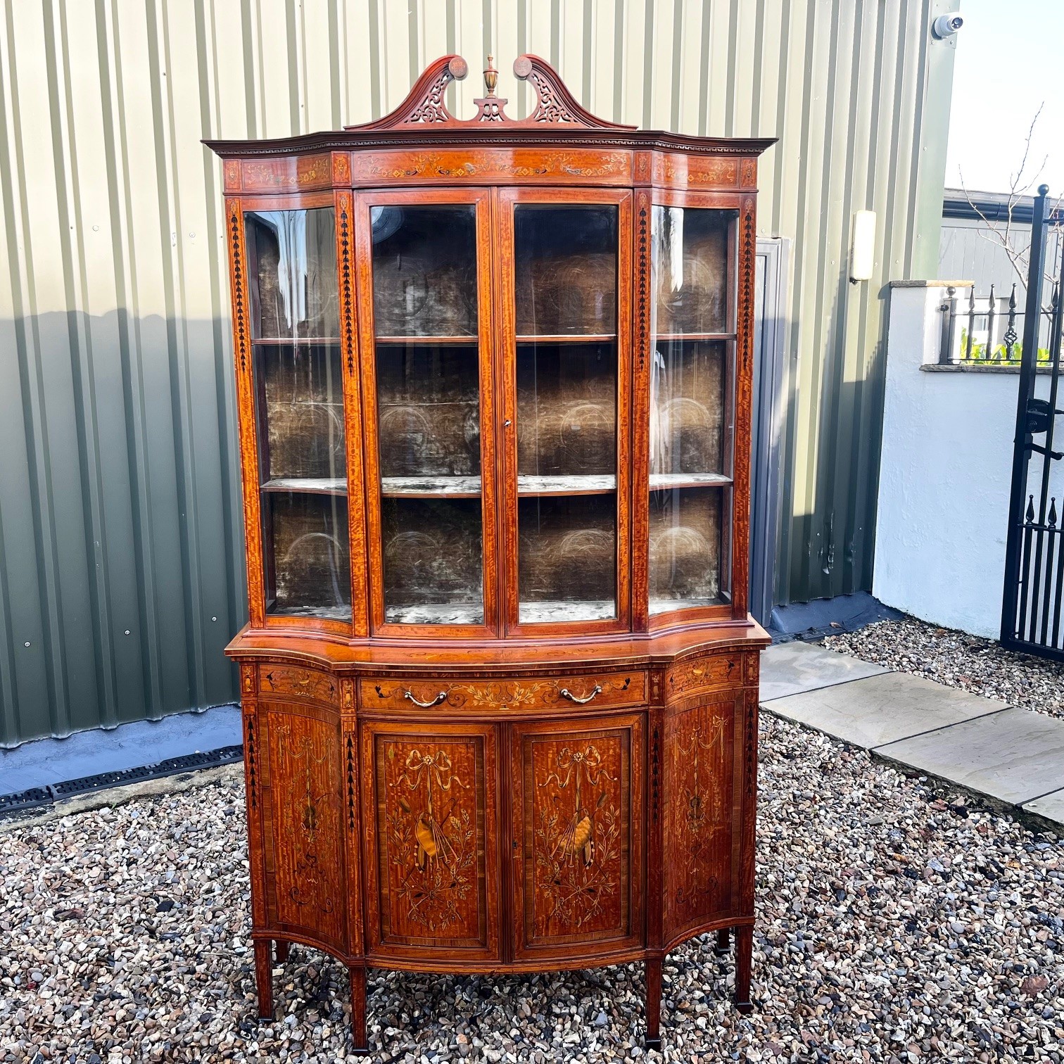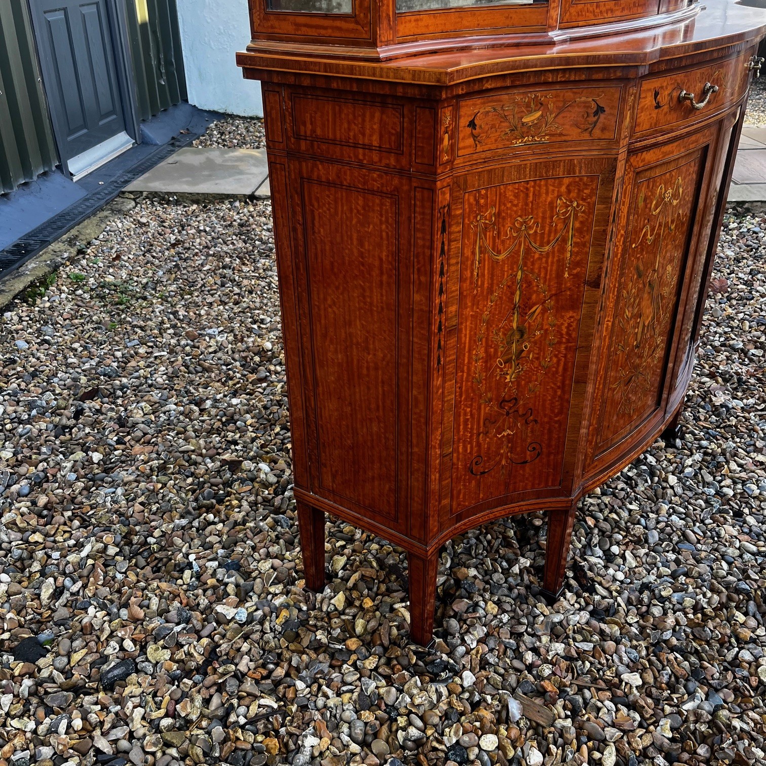 A Superior Quality Edwards & Roberts Of London 19th Century Satinwood Inlaid Serpentine Cabinet. The upper section with a broken neck pediment with a central painted urn, above a floral pen work and marquetry inlaid frieze. Having serpentine ends and central glazed doors, opening to reveal a velvet lined interior. The lower section again of serpentine outline having a central frieze drawer stamped Edwards & Roberts above four beautiful marquetry and pen work inlaid panels with ribbons and swag inlay, above central marquetry panels depicting the Arts. Raised on square tapering supports with spade feet. English circa 1890-1900. In superb original condition, cleaned and waxed.