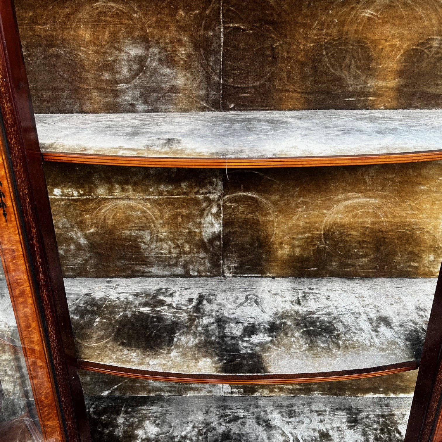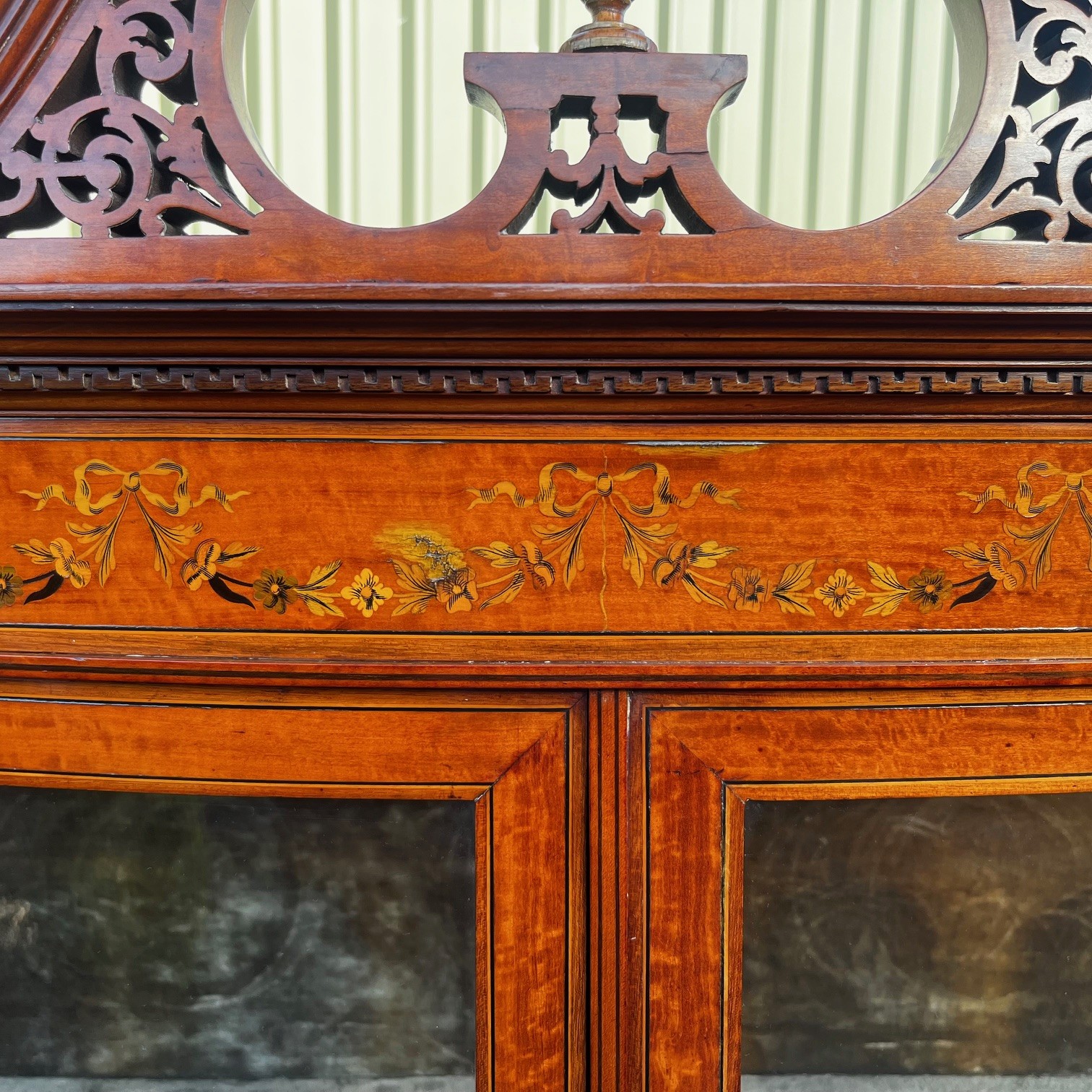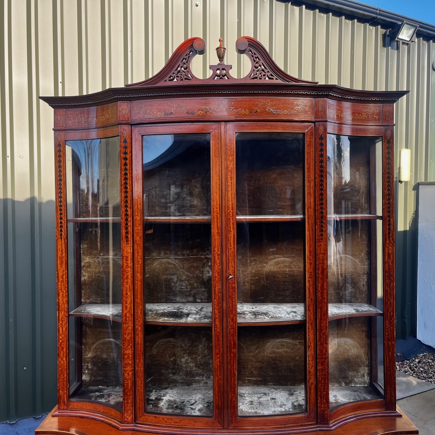 A Superior Quality Edwards & Roberts Of London 19th Century Satinwood Inlaid Serpentine Cabinet. The upper section with a broken neck pediment with a central painted urn, above a floral pen work and marquetry inlaid frieze. Having serpentine ends and central glazed doors, opening to reveal a velvet lined interior. The lower section again of serpentine outline having a central frieze drawer stamped Edwards & Roberts above four beautiful marquetry and pen work inlaid panels with ribbons and swag inlay, above central marquetry panels depicting the Arts. Raised on square tapering supports with spade feet. English circa 1890-1900. In superb original condition, cleaned and waxed.