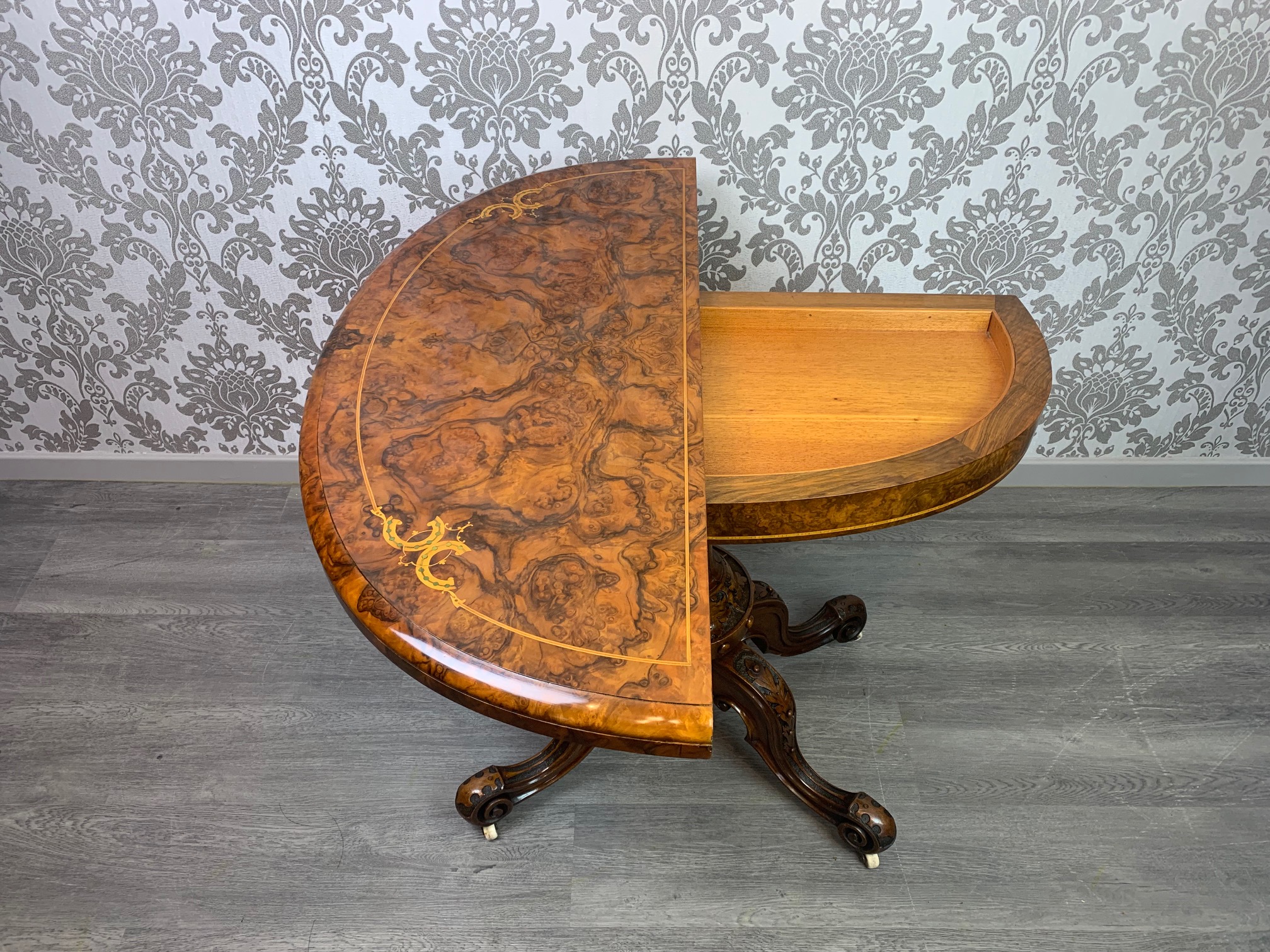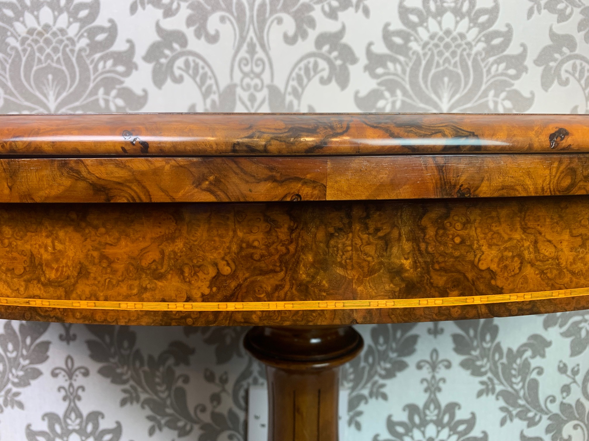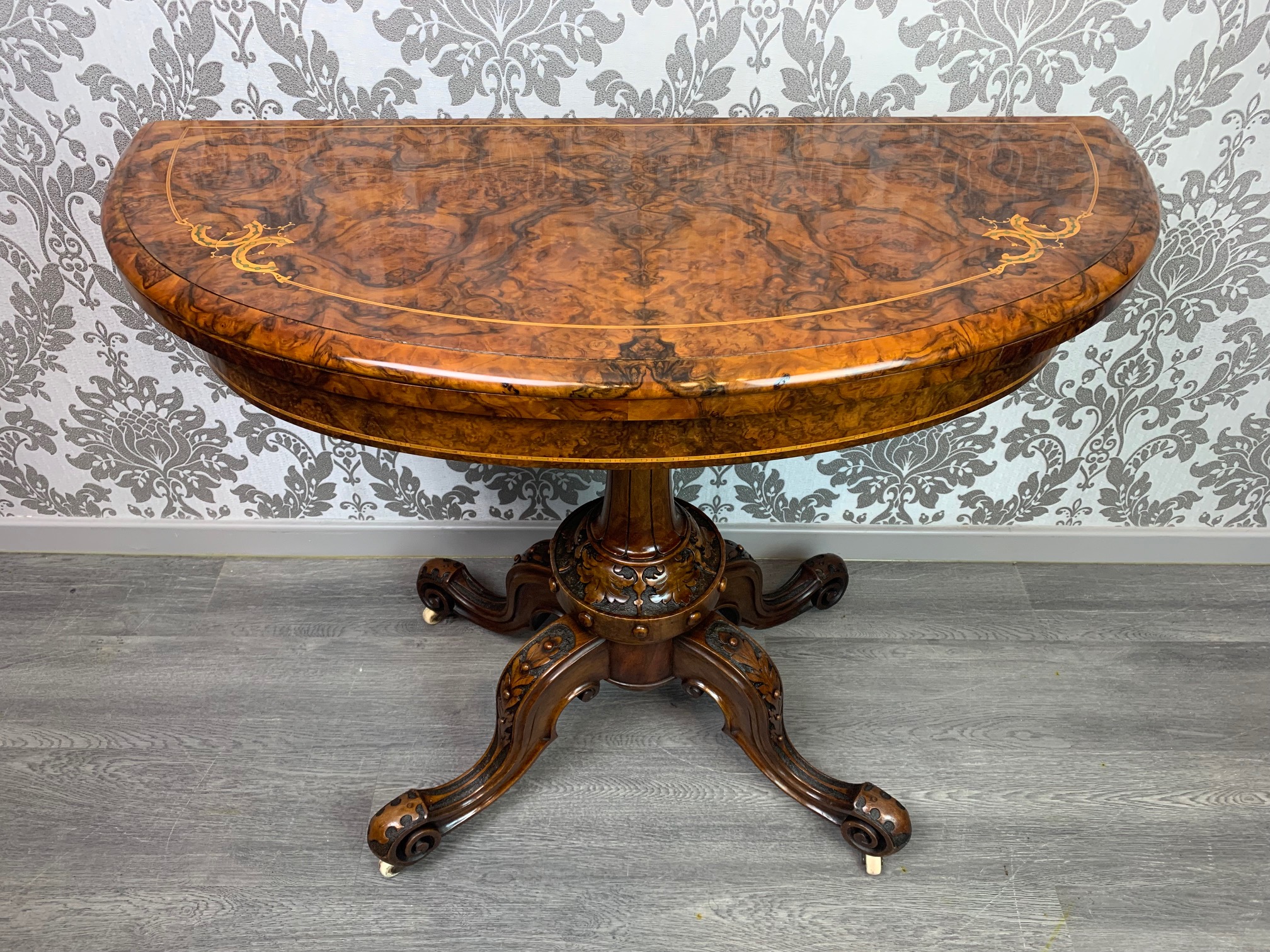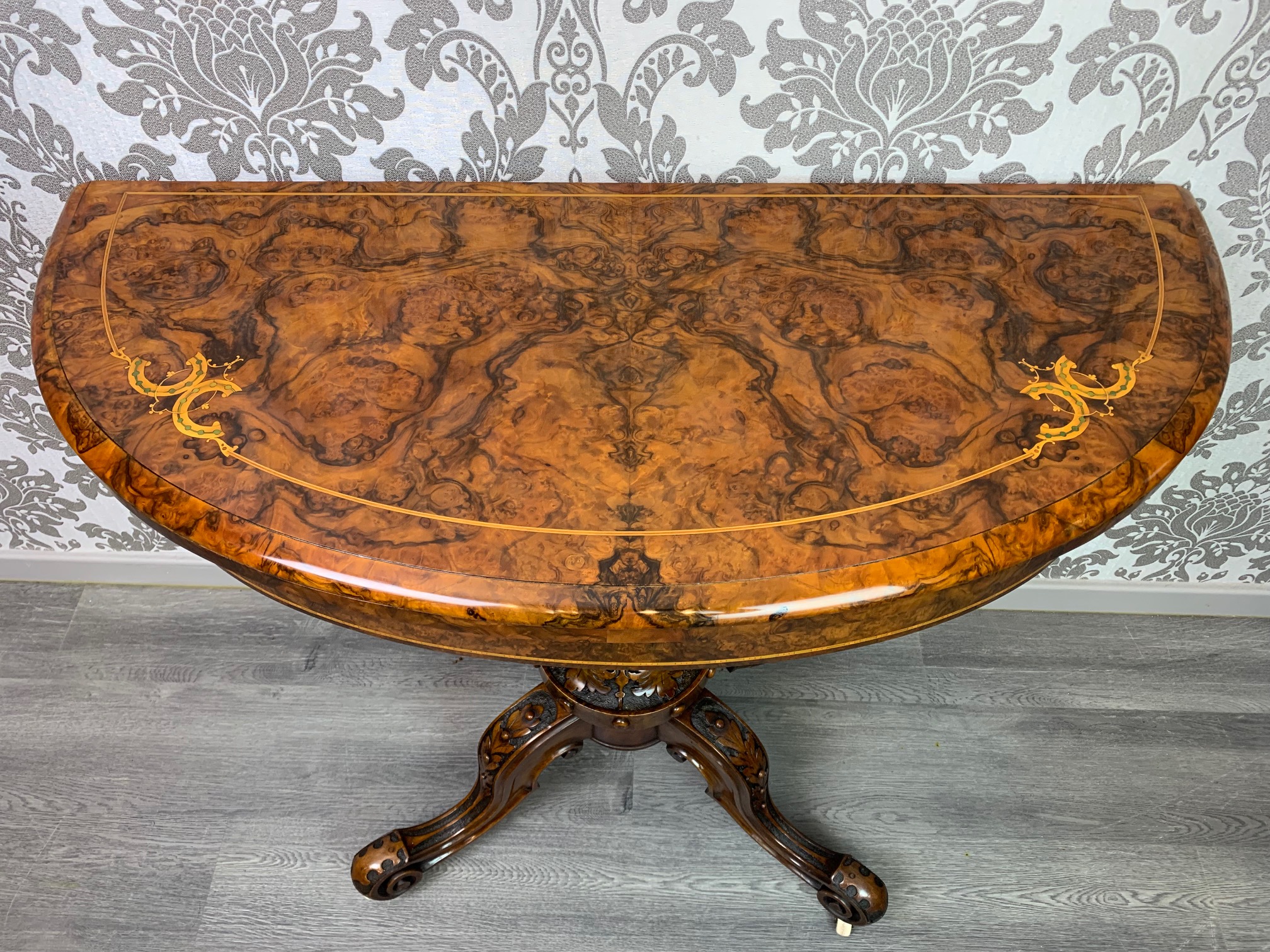 CompareA superior quality Victorian Period burr walnut games table. The Demi lune top veneered in the finest burr walnut and having boxwood and sycamore inlaid detail. The top swivels and opens to reveal a storage area for cards and counters etc and a baize lined playing surface. Raised on a fluted turned column with fine acanthus leaf carved detail, burr walnut collar with studs and standing on four finely carved cabriole supports with brass and porcelain castors. English circa 1860-1870 in stunning condition