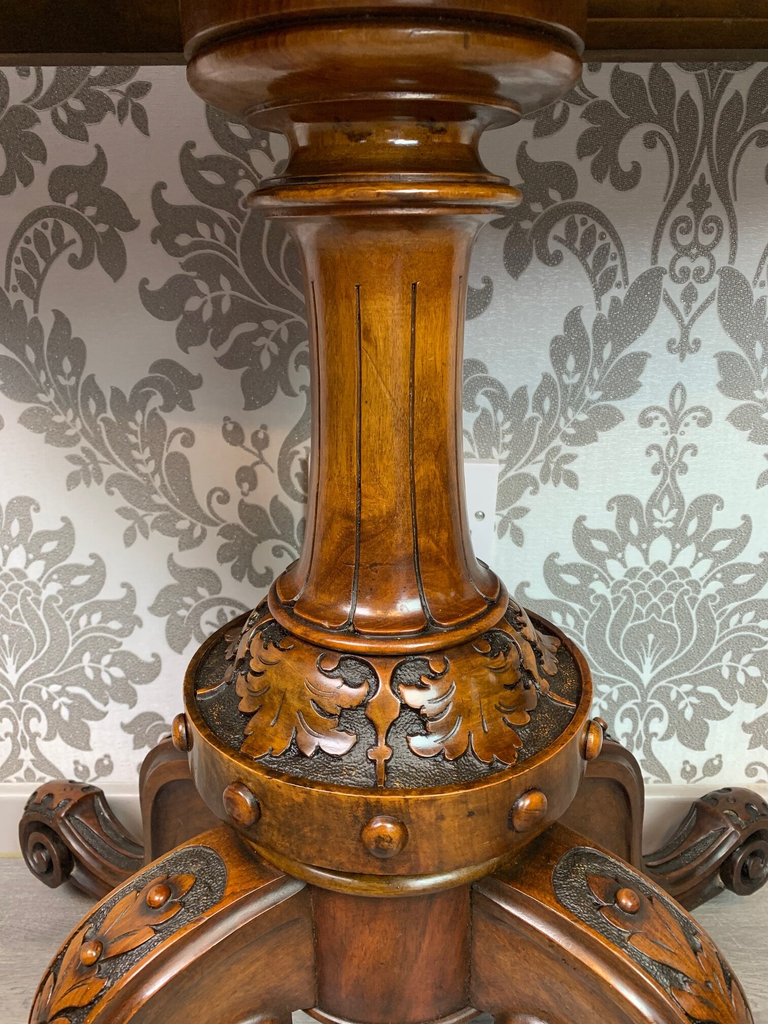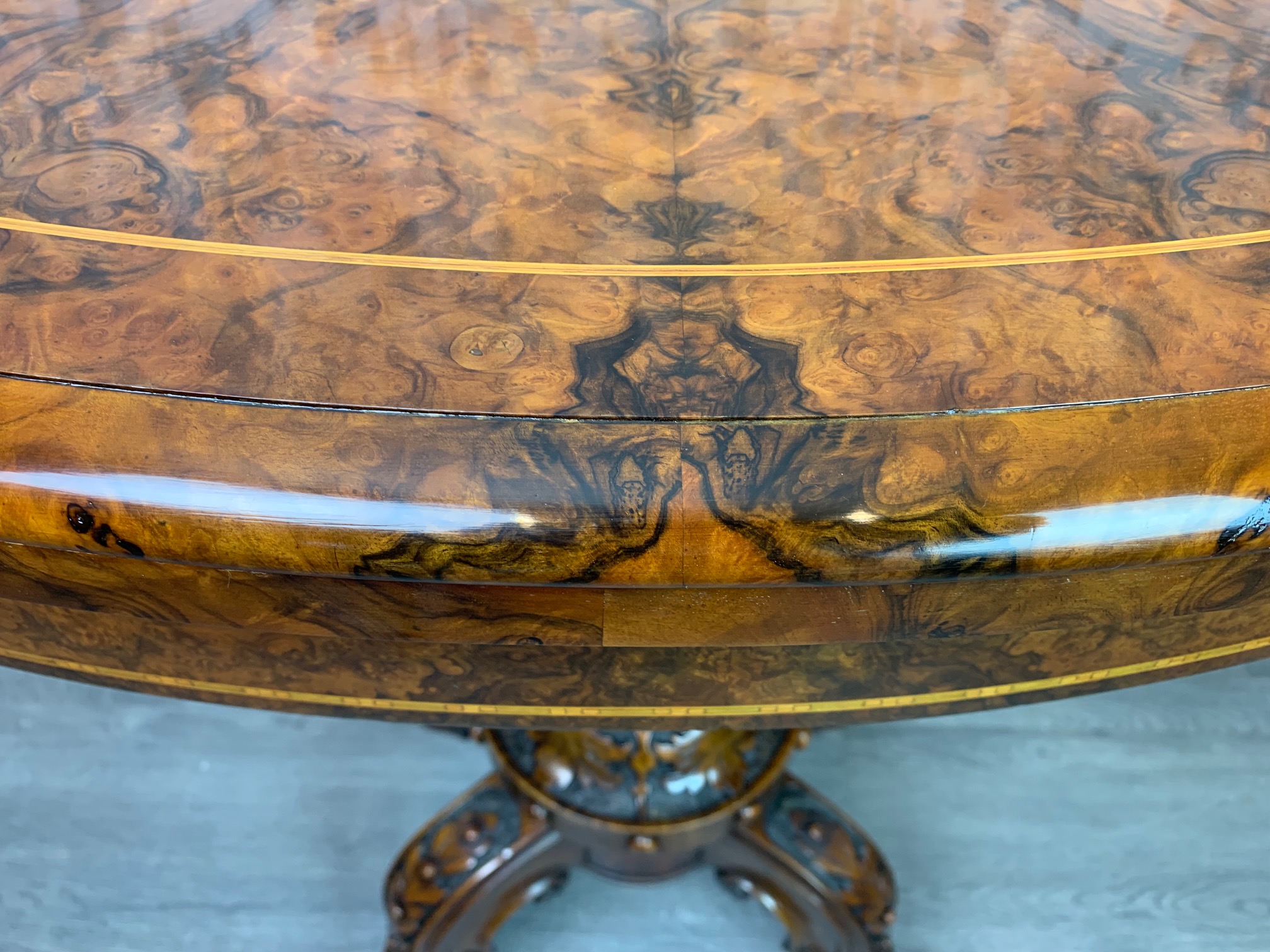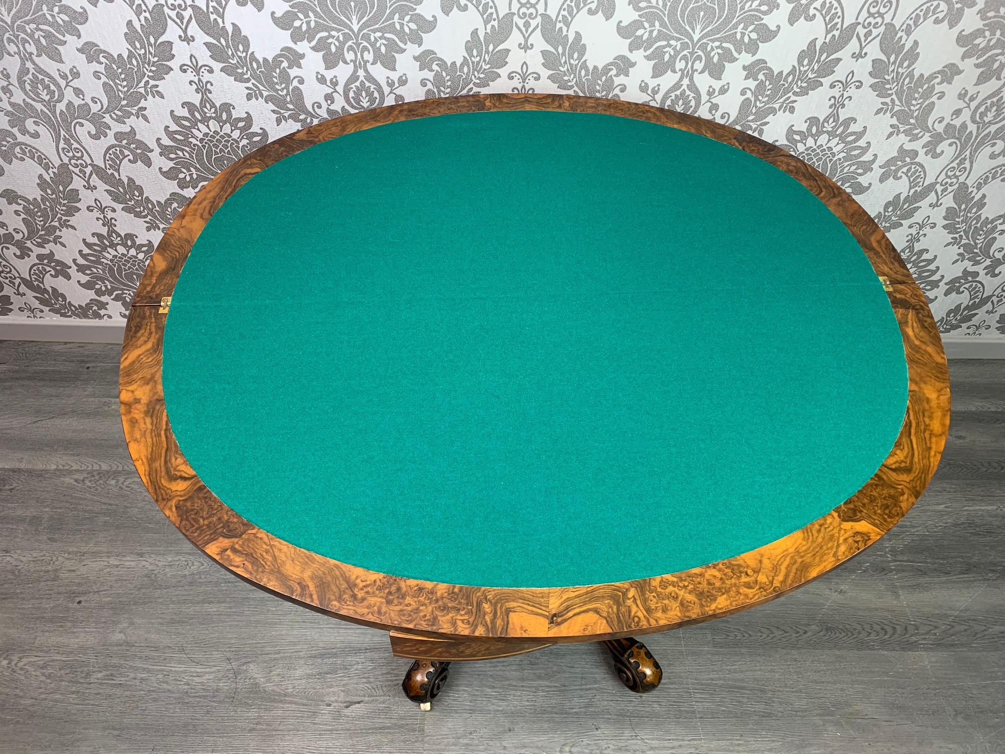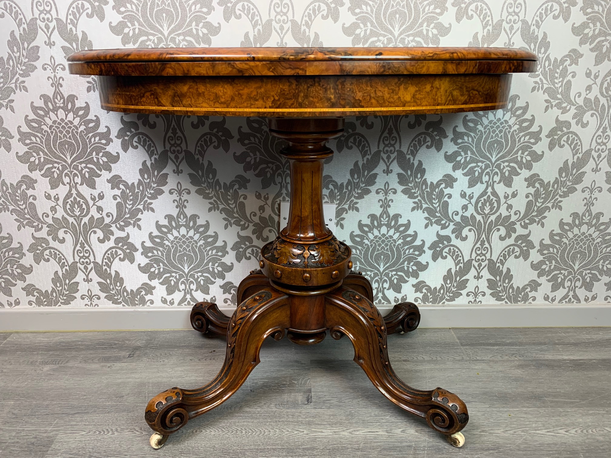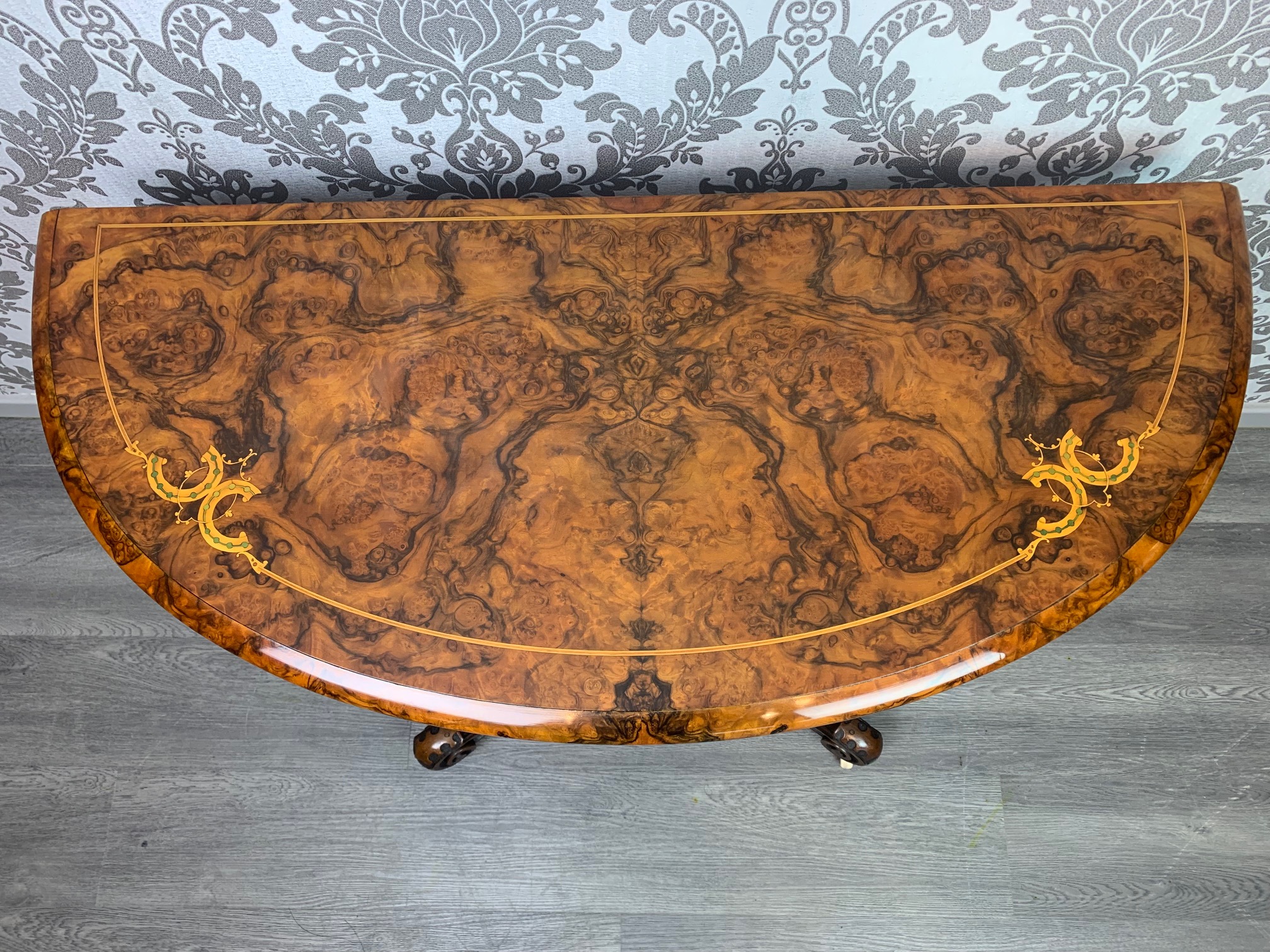 CompareA superior quality Victorian Period burr walnut games table. The Demi lune top veneered in the finest burr walnut and having boxwood and sycamore inlaid detail. The top swivels and opens to reveal a storage area for cards and counters etc and a baize lined playing surface. Raised on a fluted turned column with fine acanthus leaf carved detail, burr walnut collar with studs and standing on four finely carved cabriole supports with brass and porcelain castors. English circa 1860-1870 in stunning condition
