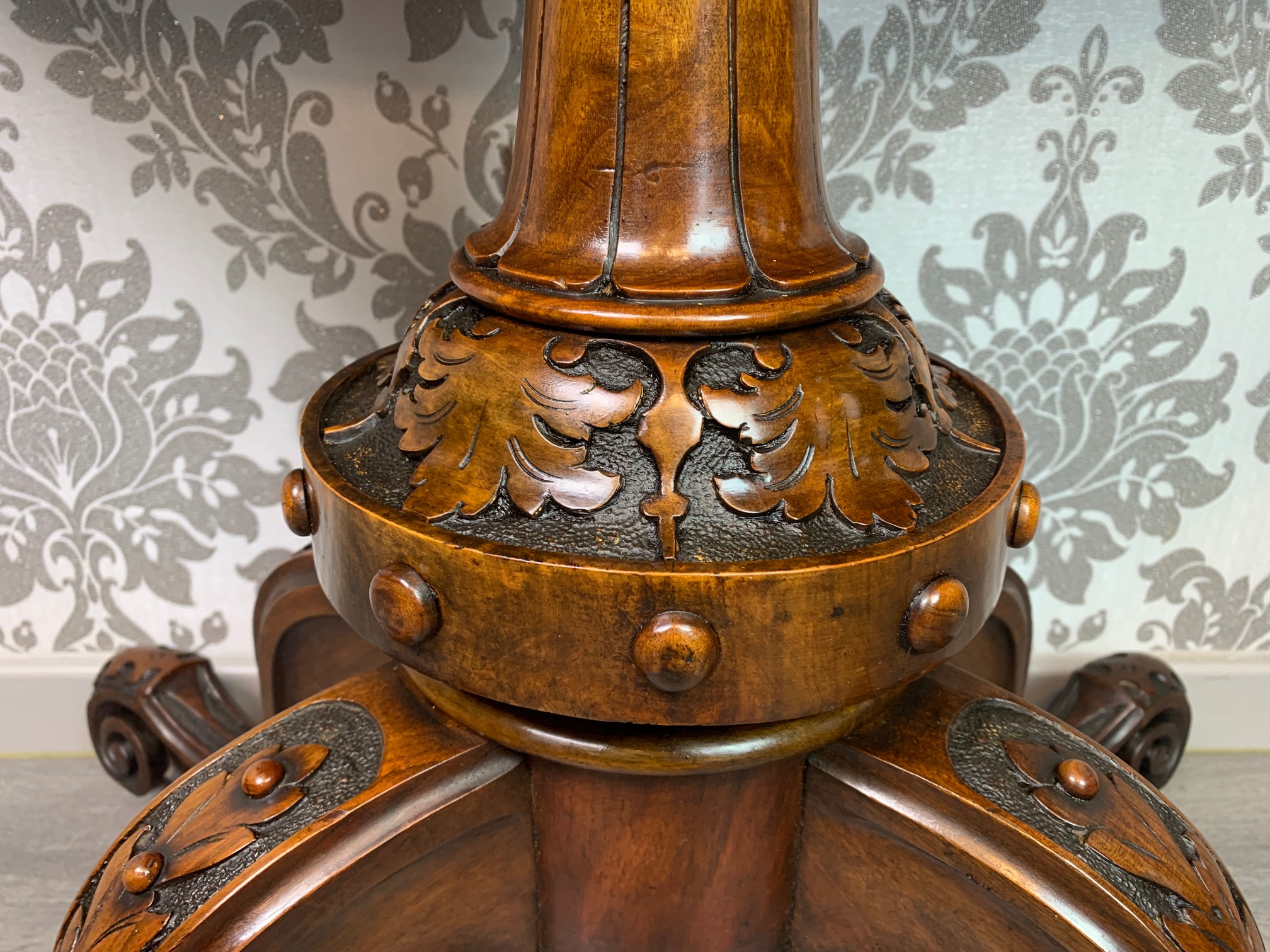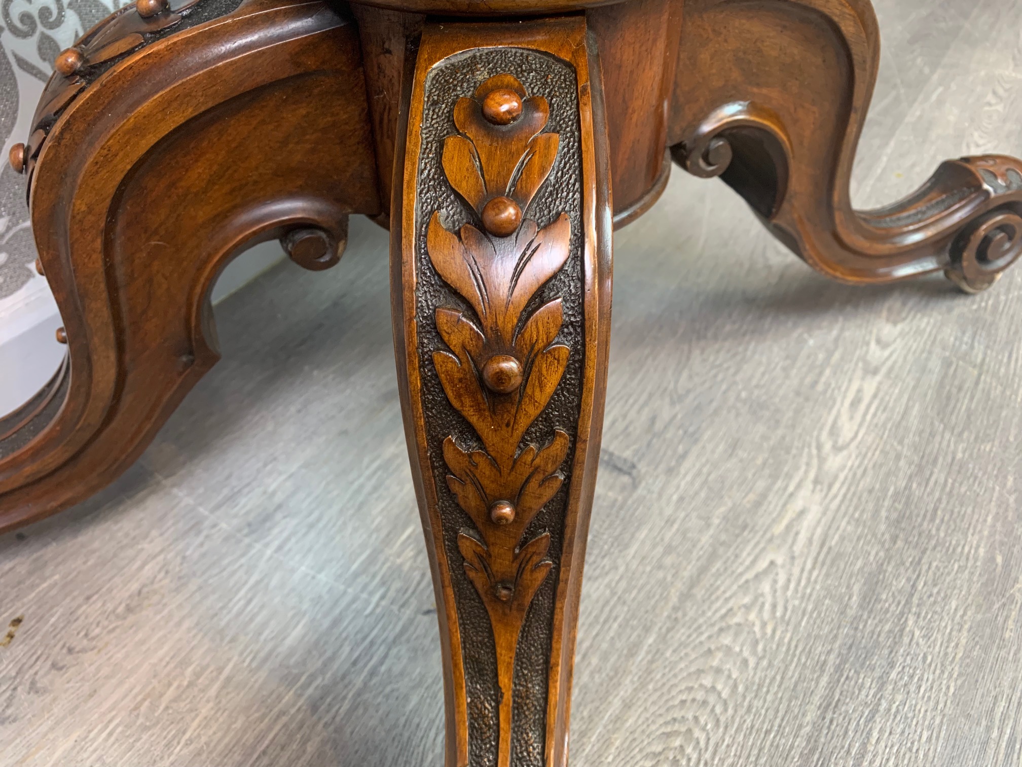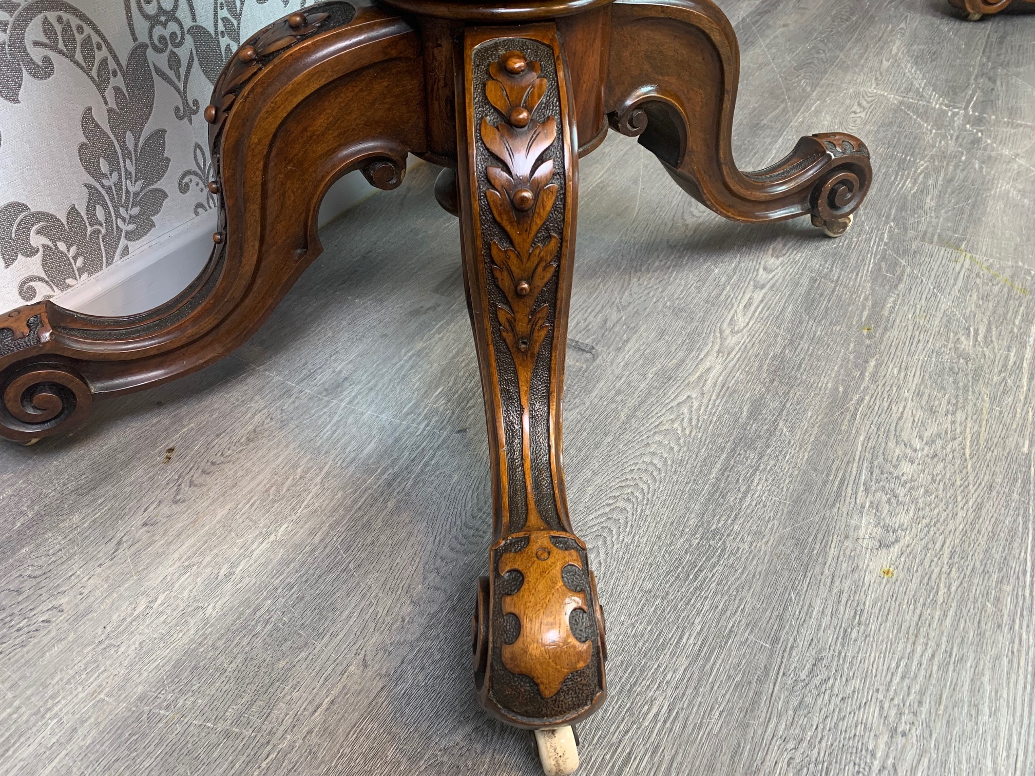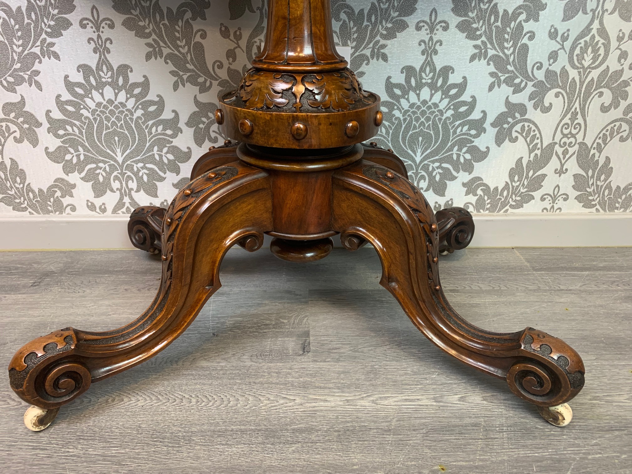 CompareA superior quality Victorian Period burr walnut games table. The Demi lune top veneered in the finest burr walnut and having boxwood and sycamore inlaid detail. The top swivels and opens to reveal a storage area for cards and counters etc and a baize lined playing surface. Raised on a fluted turned column with fine acanthus leaf carved detail, burr walnut collar with studs and standing on four finely carved cabriole supports with brass and porcelain castors. English circa 1860-1870 in stunning condition