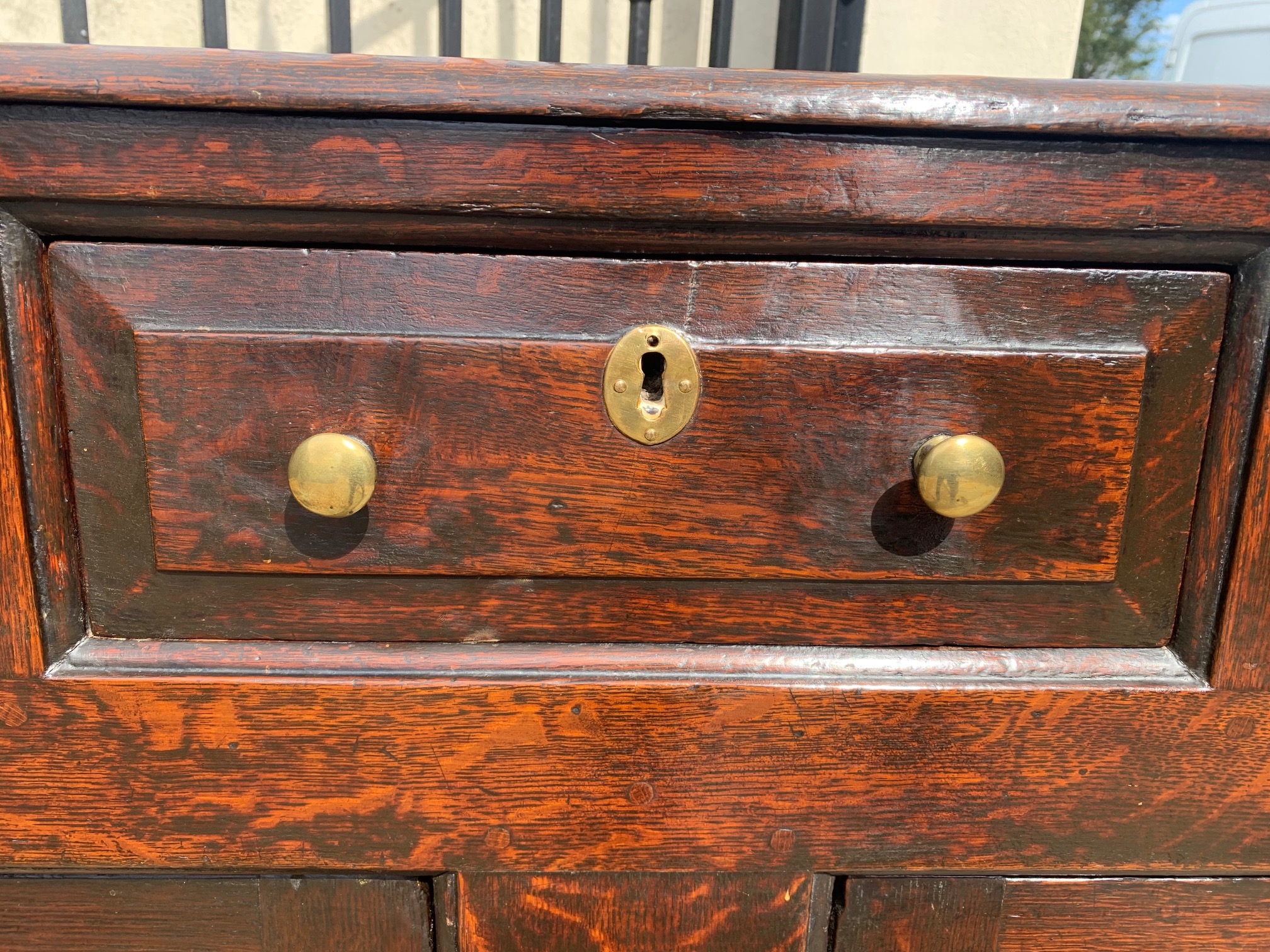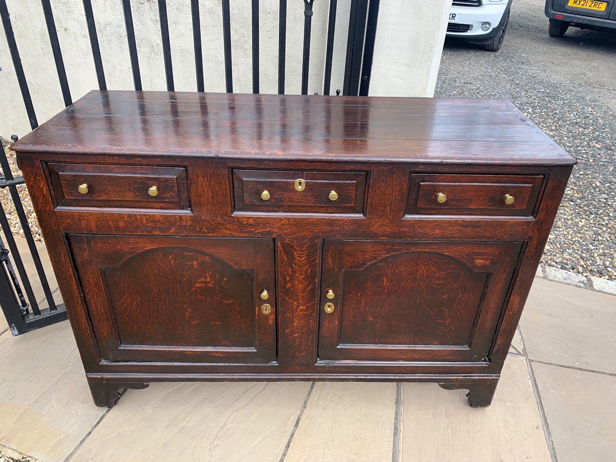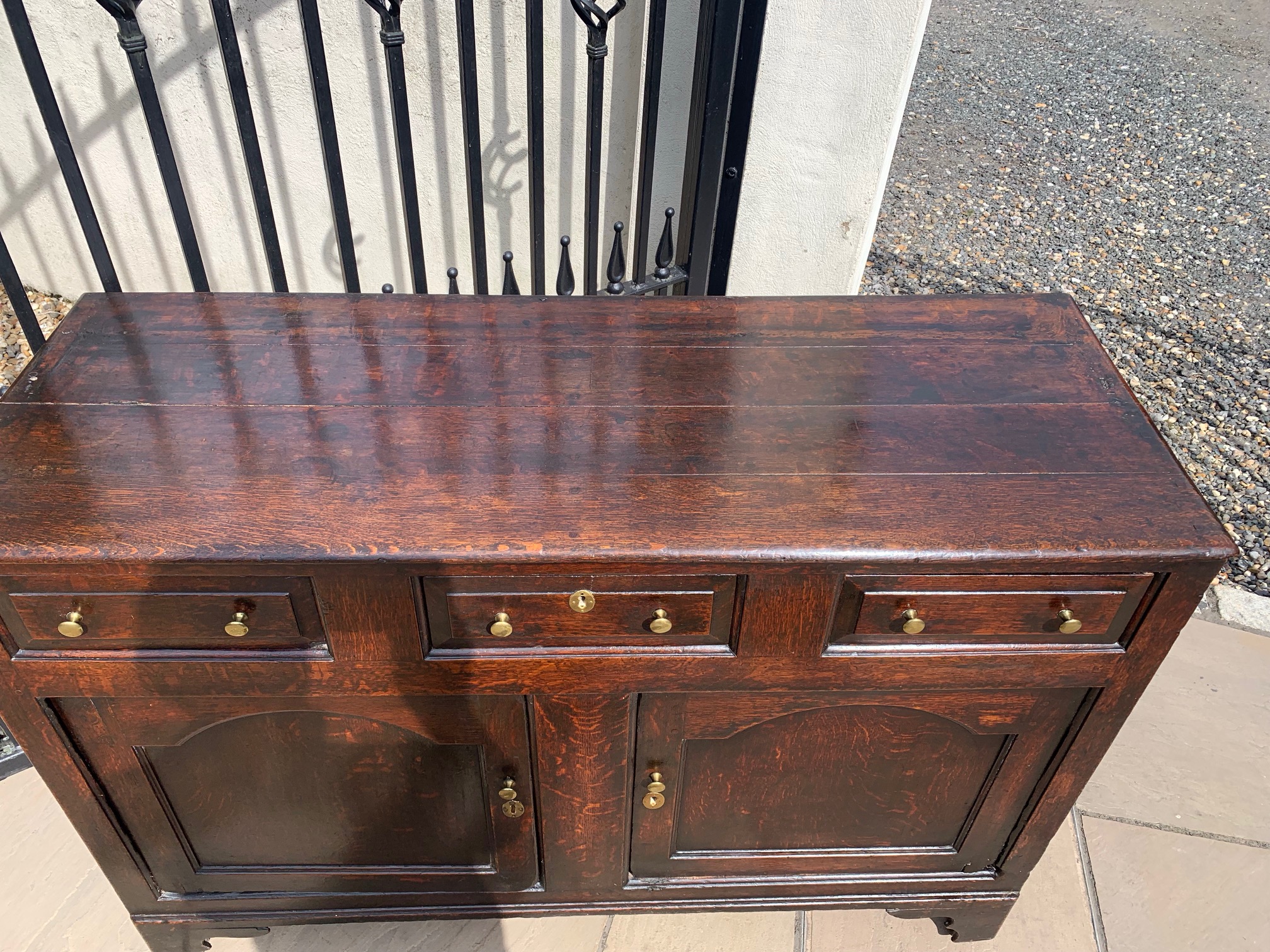 CompareA sweet Mid 18th Century oak dresser base having a three plank top above three rectangular drawers with the original brass drawer pulls and having chamfered fronts above two arched panelled doors again with the original handles and escutcheons. Having panelled ends and raised on square bracket feet. English/Welsh circa 1760, a superb colour and patination throughout