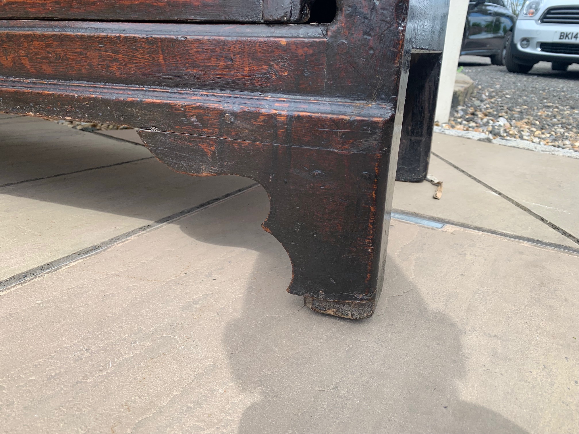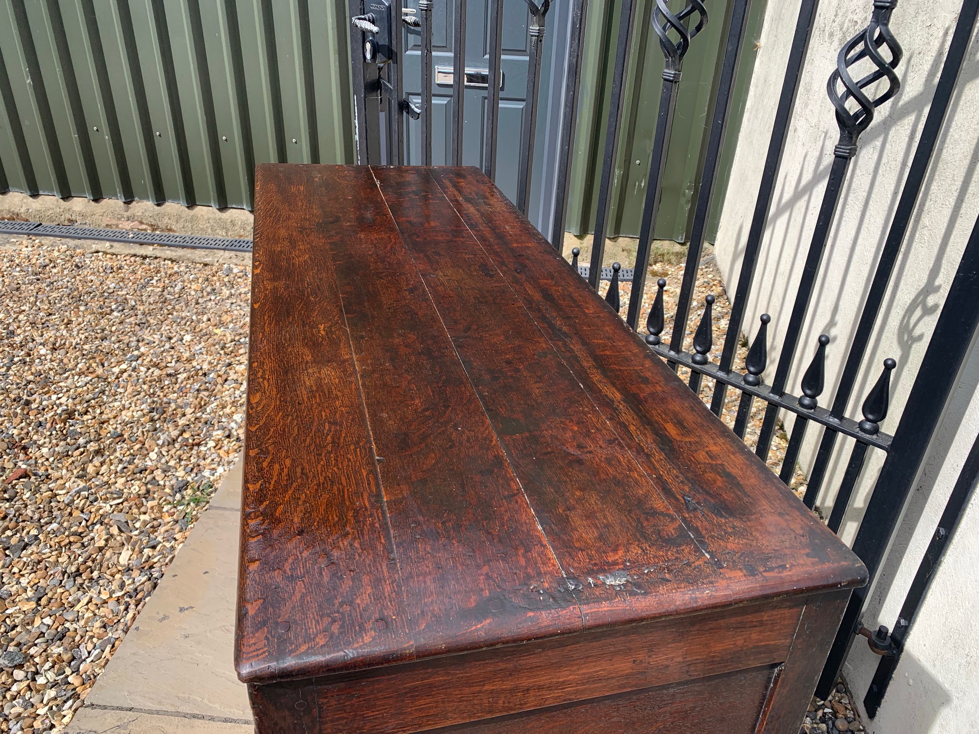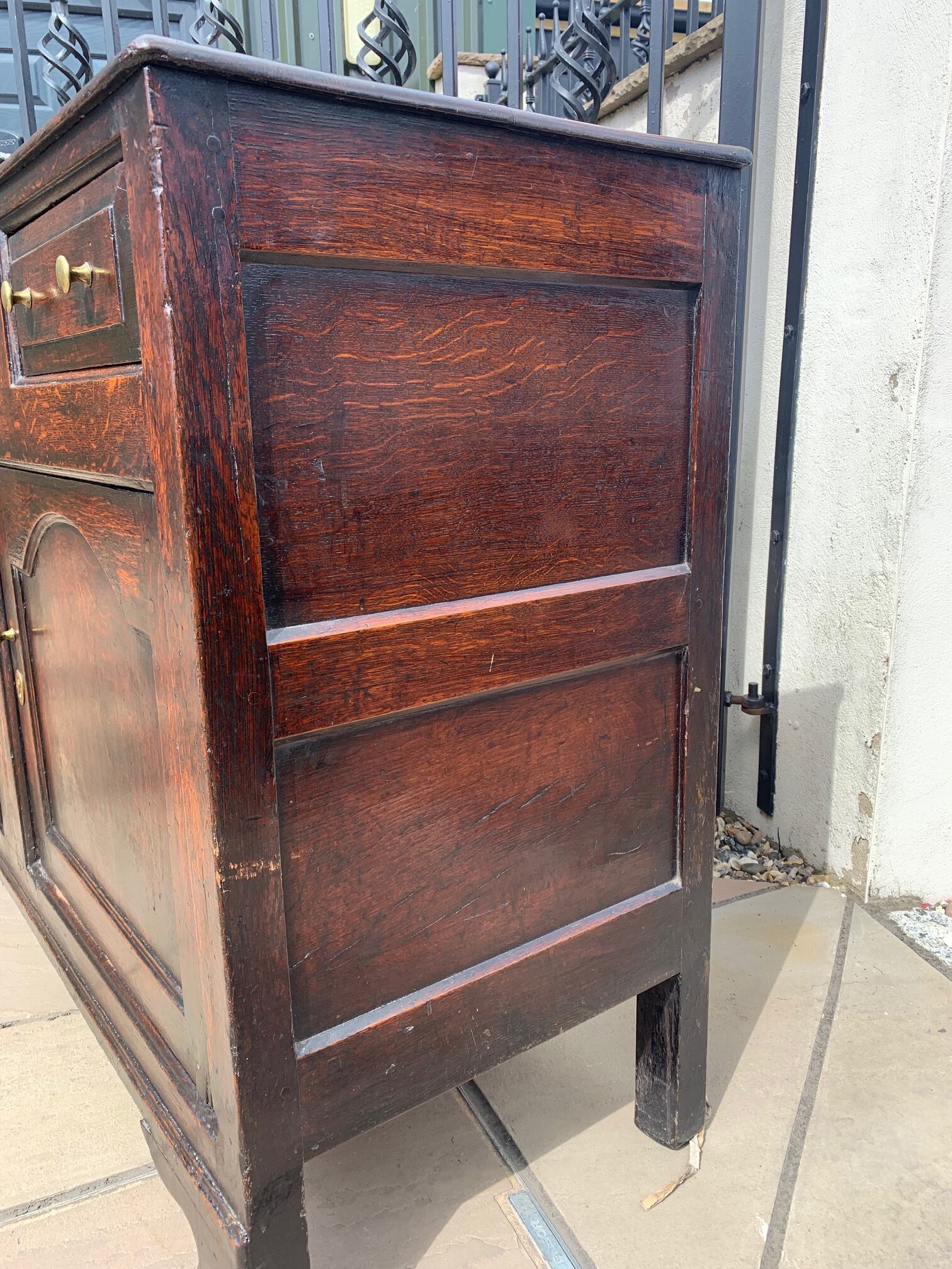 CompareA sweet Mid 18th Century oak dresser base having a three plank top above three rectangular drawers with the original brass drawer pulls and having chamfered fronts above two arched panelled doors again with the original handles and escutcheons. Having panelled ends and raised on square bracket feet. English/Welsh circa 1760, a superb colour and patination throughout