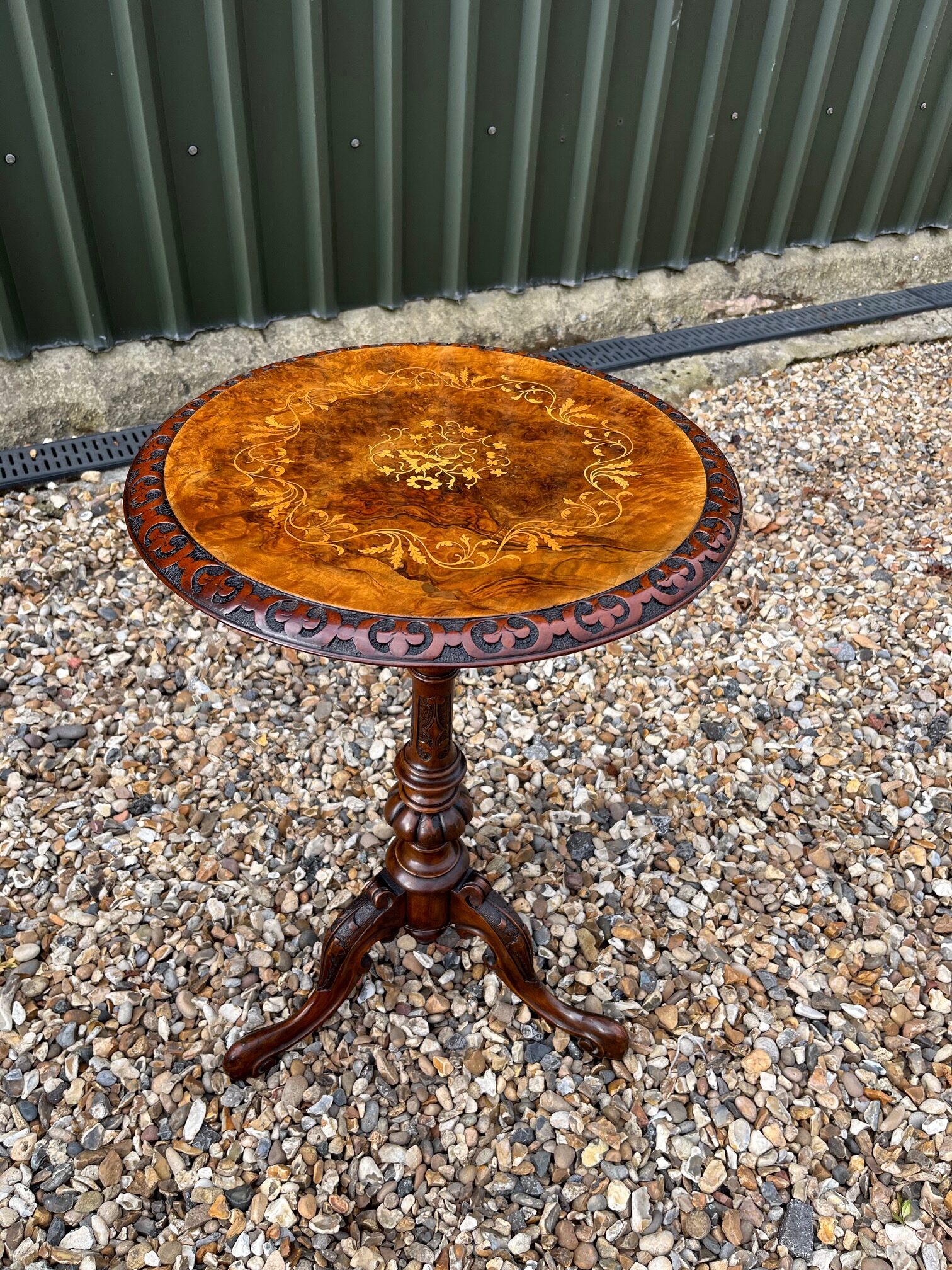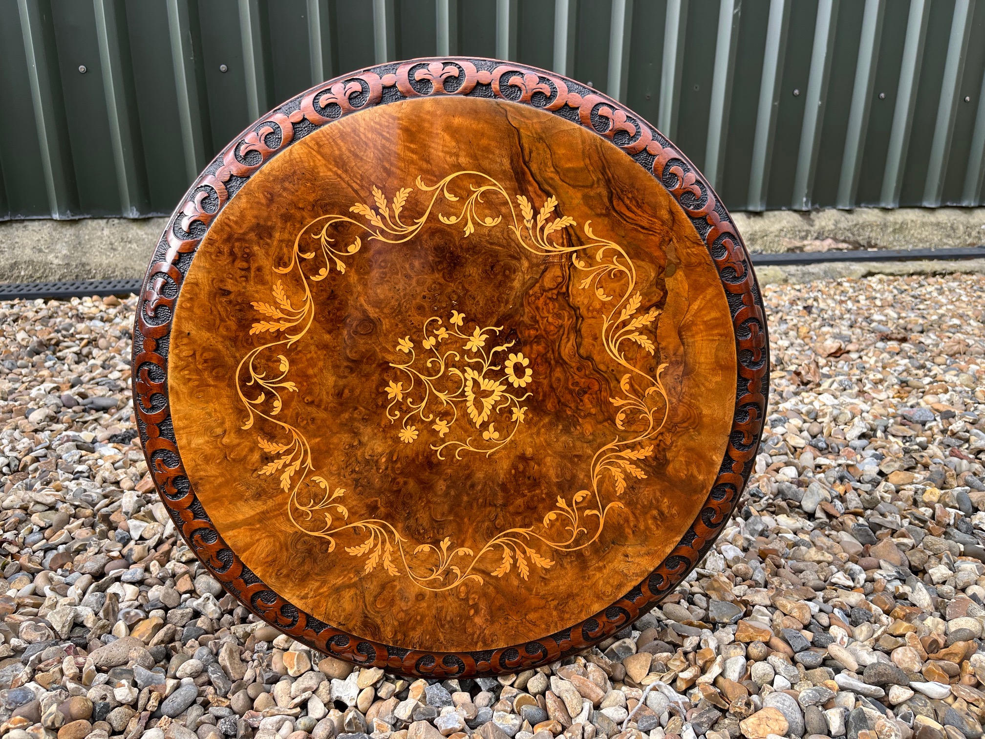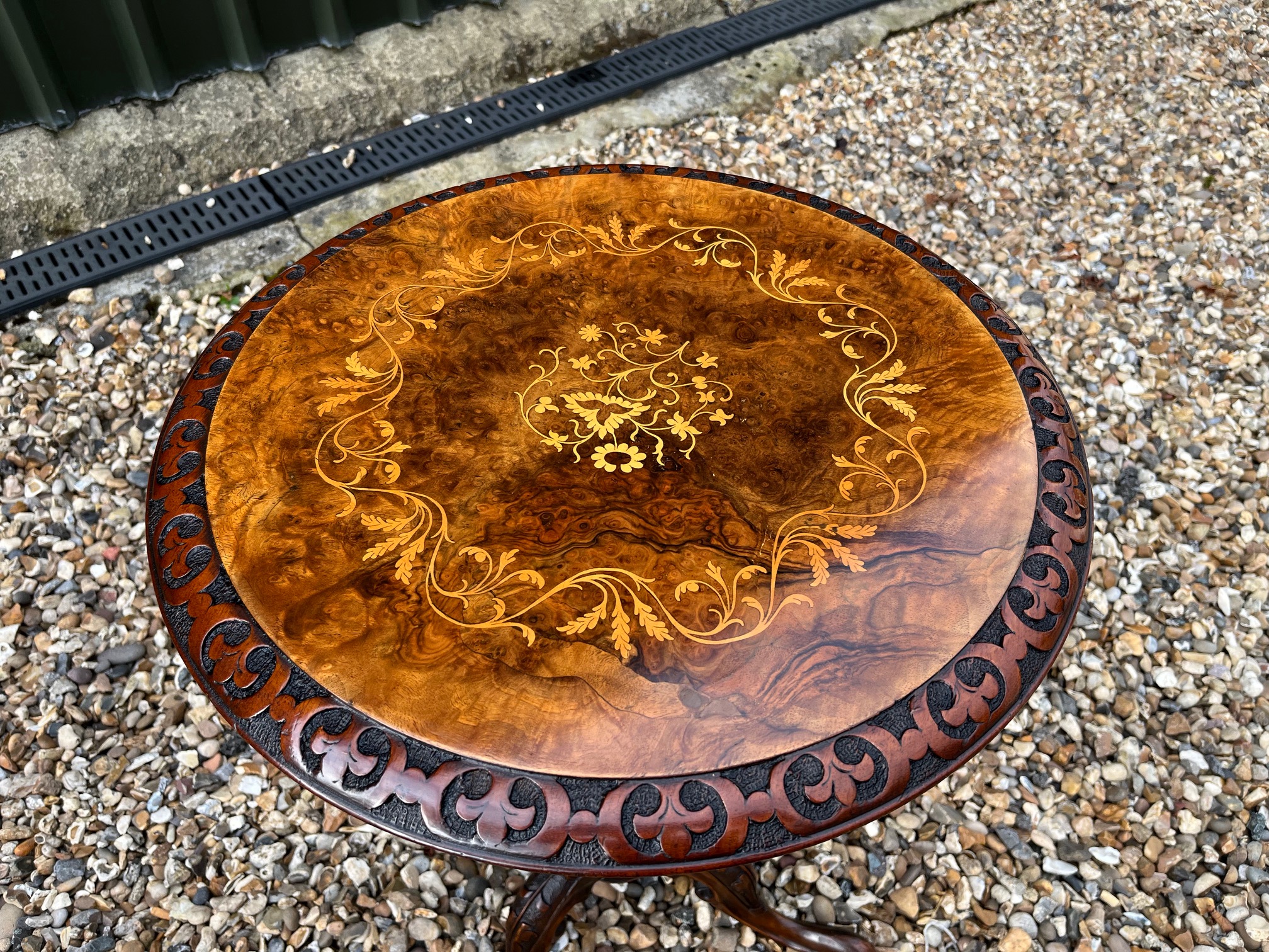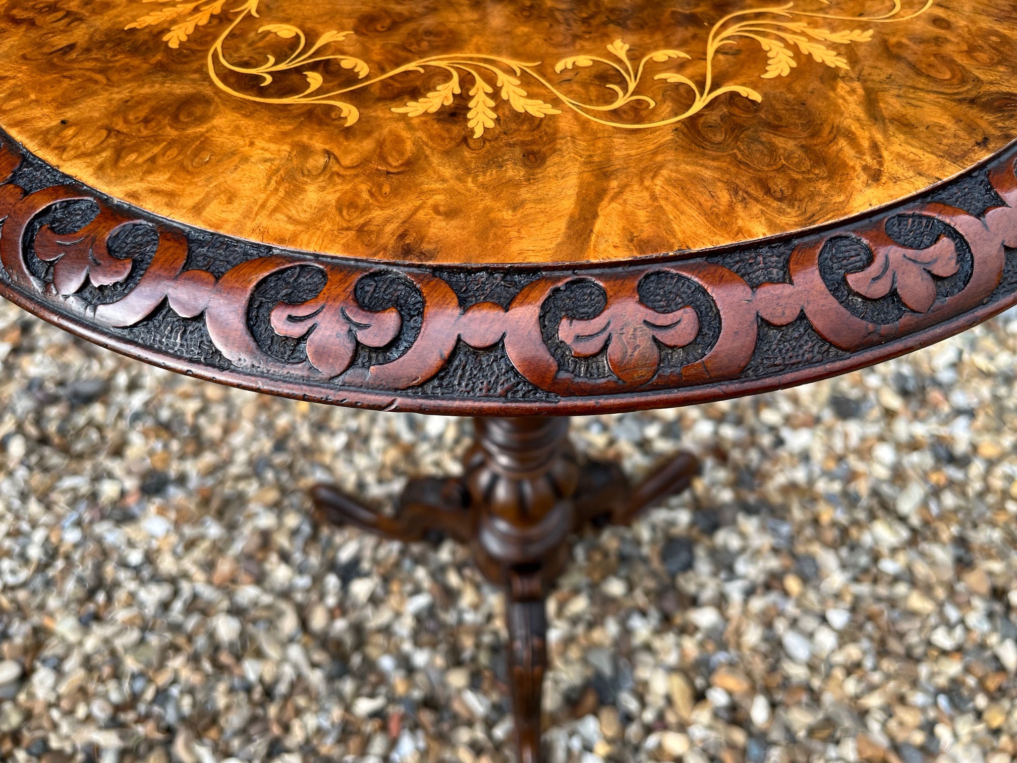 CompareA Victorian Period burr walnut and walnut wine table. The circular top veneered in beautifully figured burr walnut with foliate marquetry detail and a finely carved floral border. Raised on a turned and carved walnut column with swept cabriole supports. English circa 1870-1880