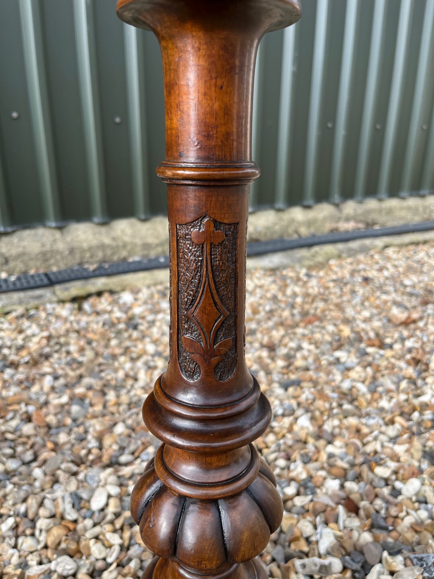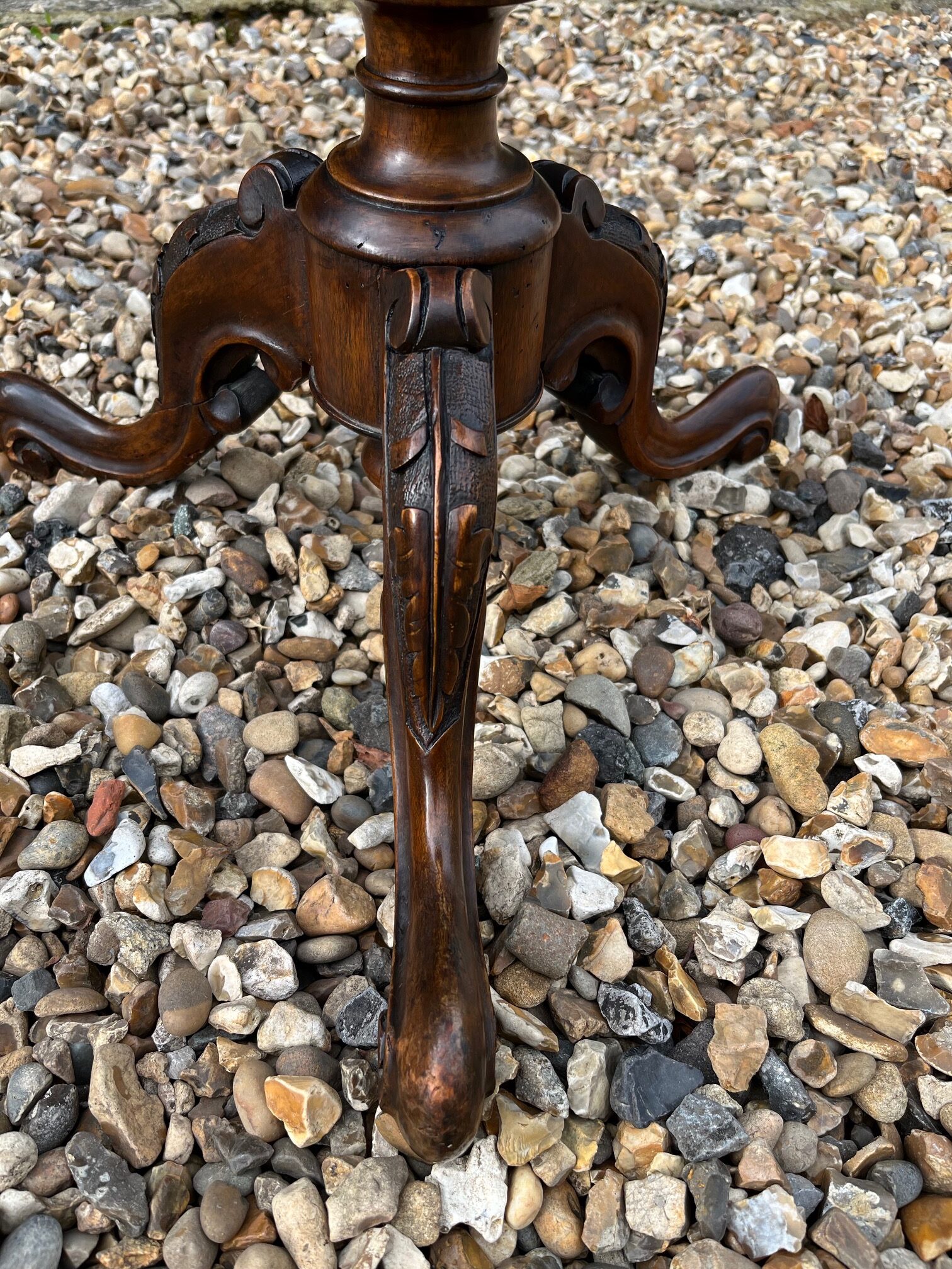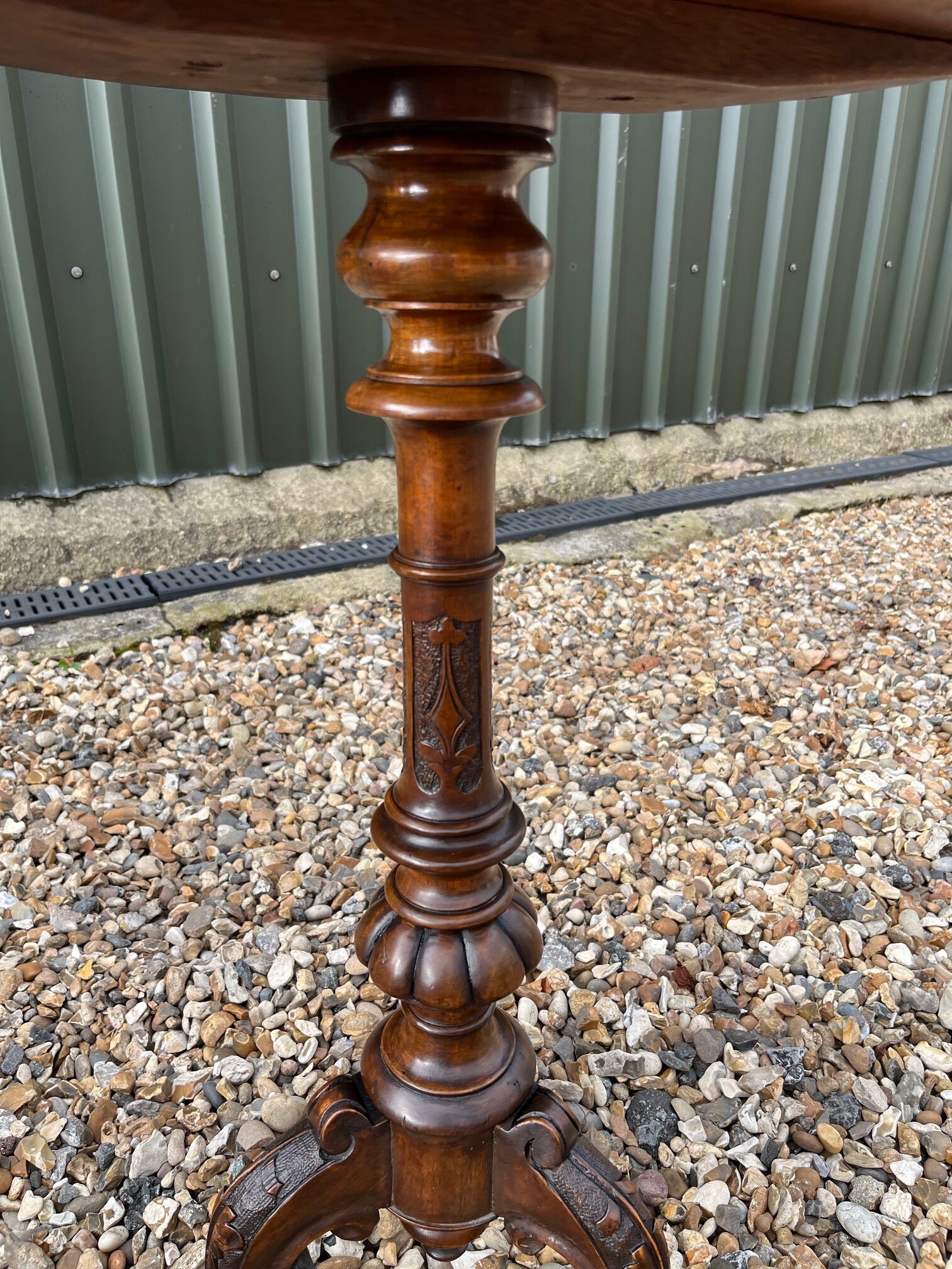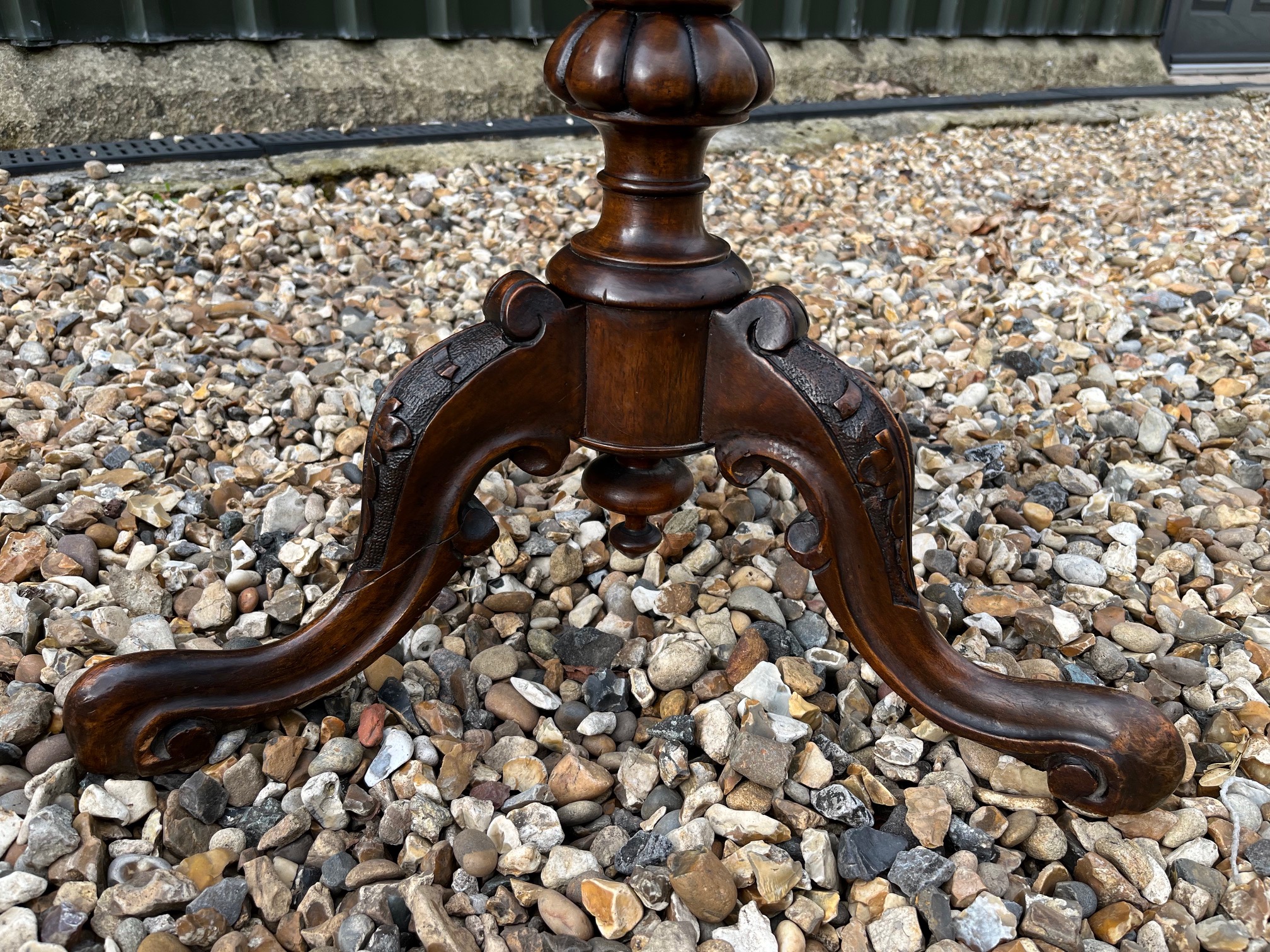 CompareA Victorian Period burr walnut and walnut wine table. The circular top veneered in beautifully figured burr walnut with foliate marquetry detail and a finely carved floral border. Raised on a turned and carved walnut column with swept cabriole supports. English circa 1870-1880