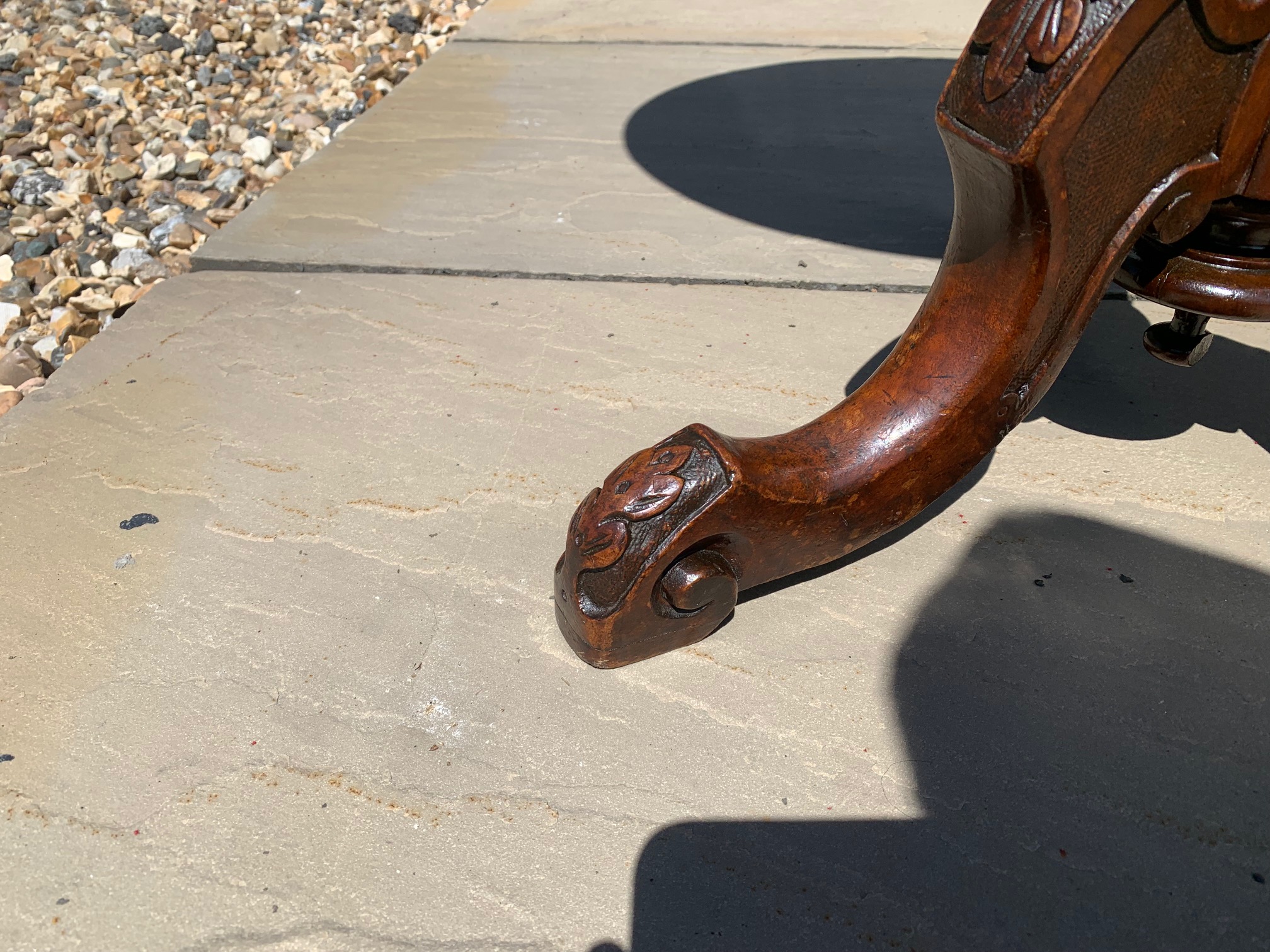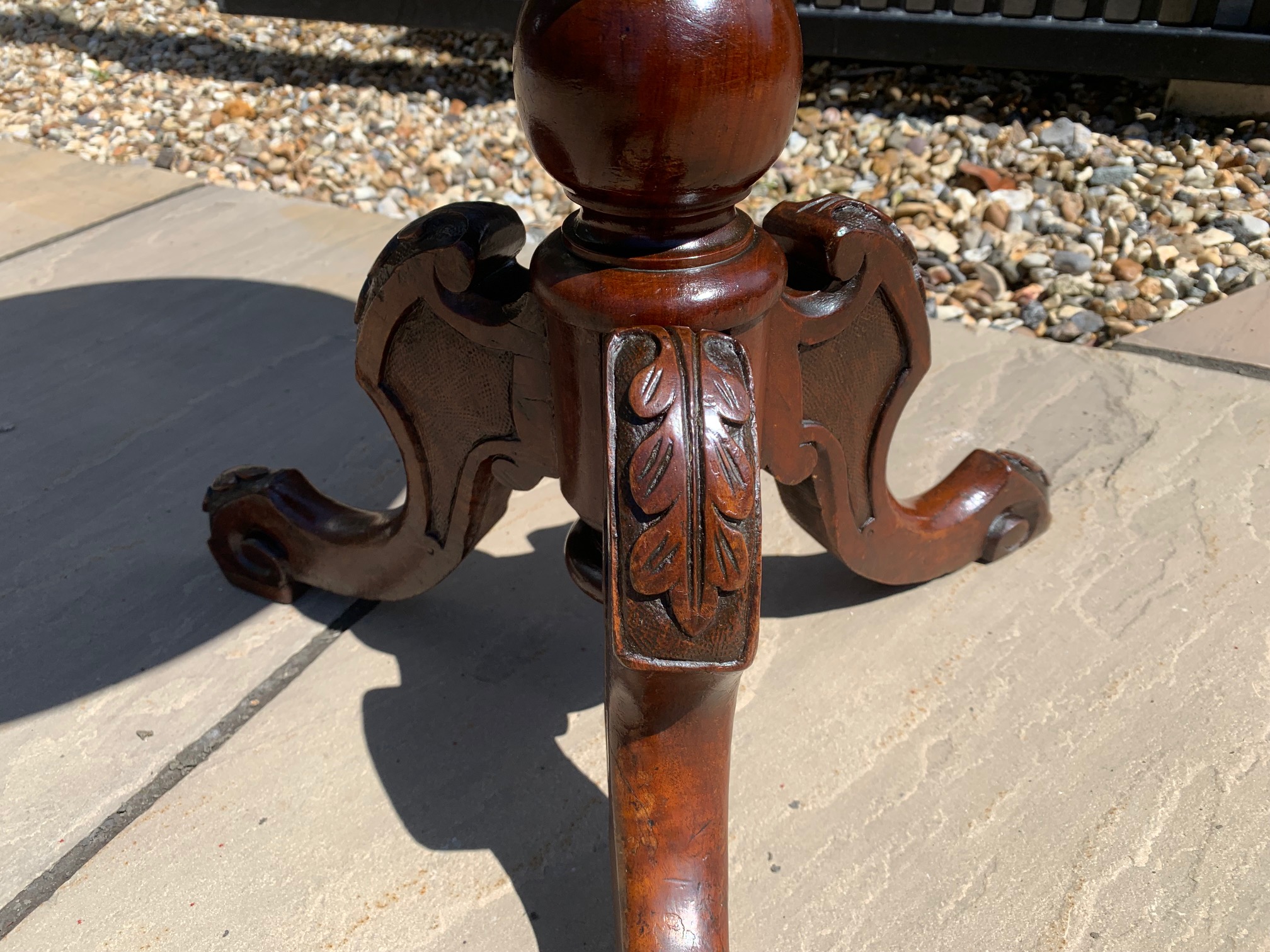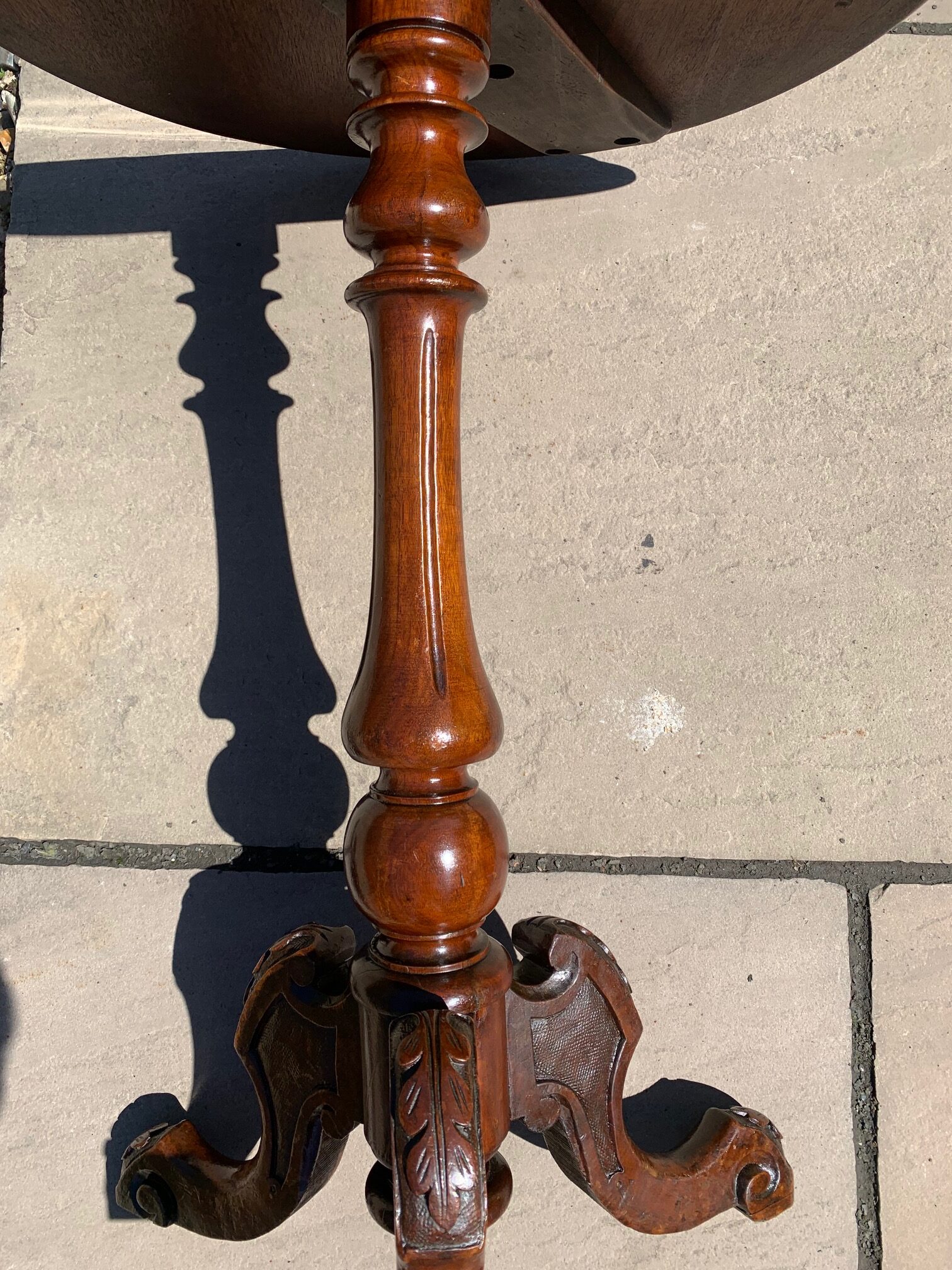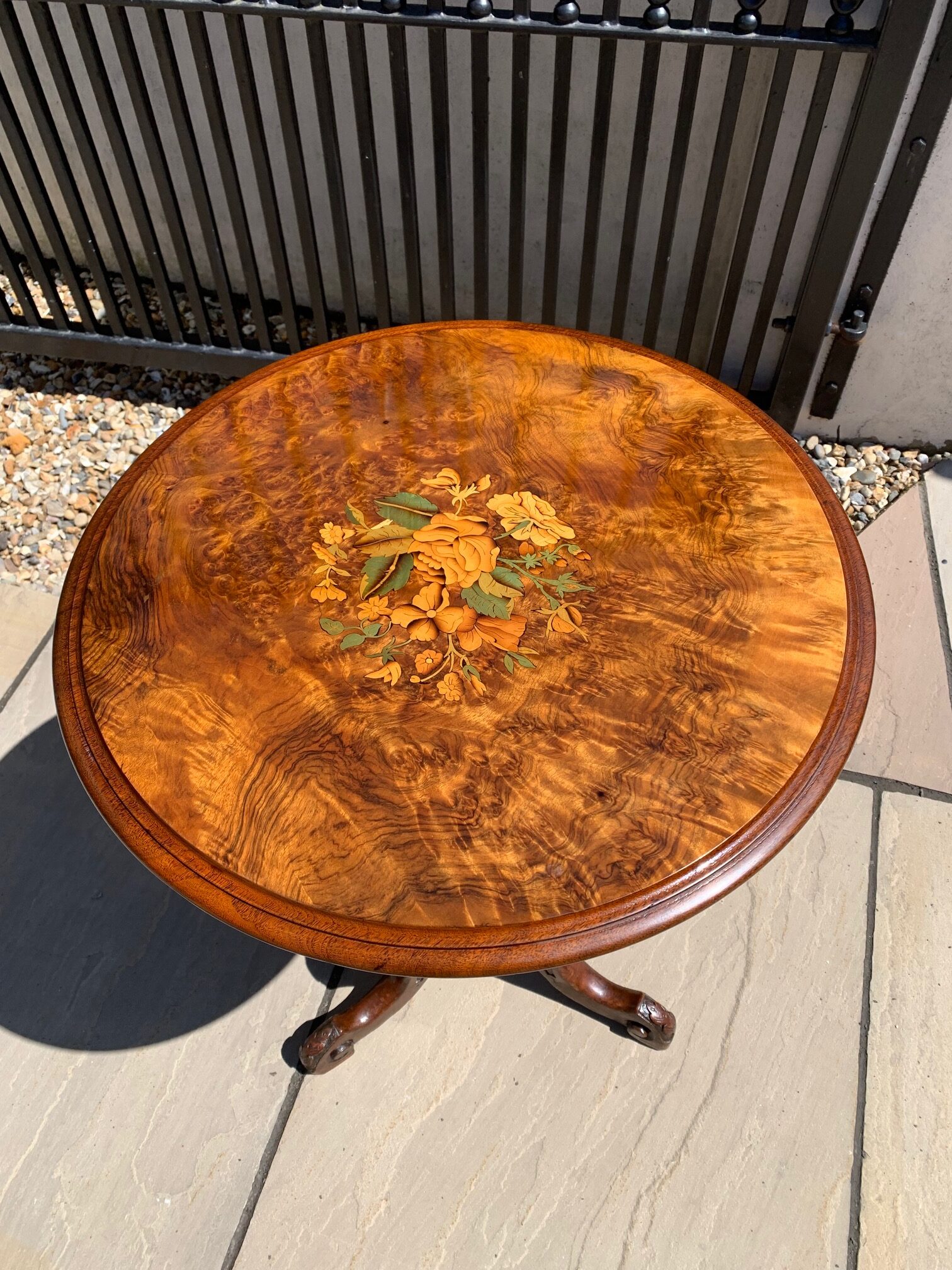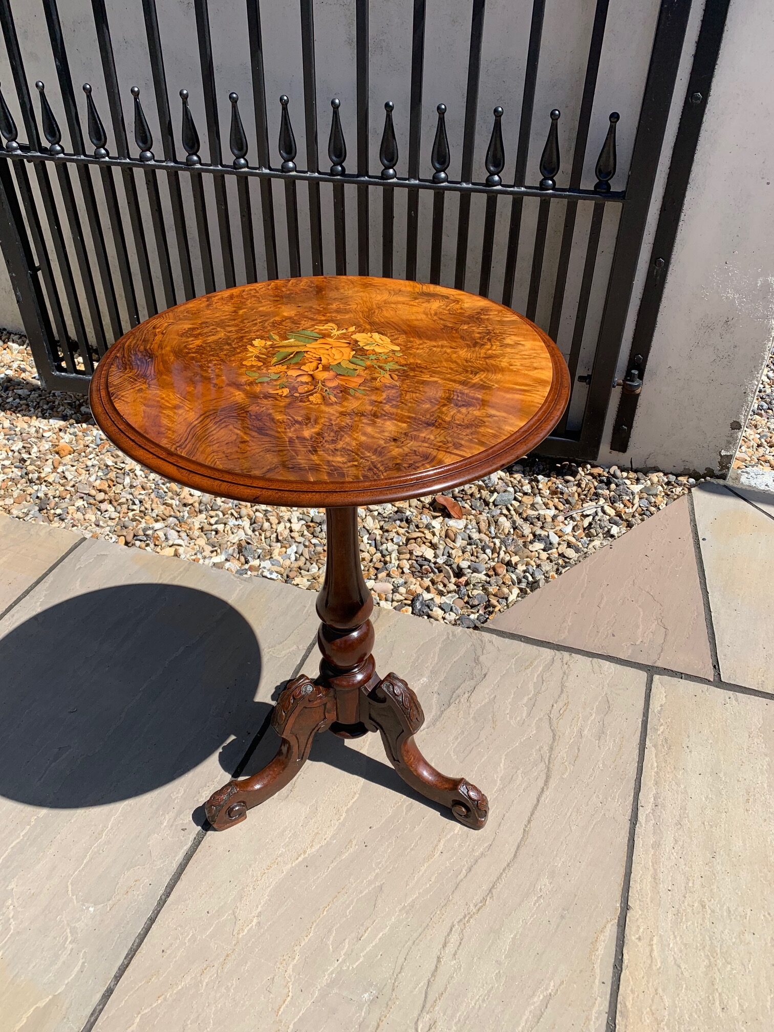 CompareA Victorian Period burr walnut circular wine table. The circular walnut veneered top having a lovely central inlaid panel and raised on a turned walnut column with acanthus carved cabriole supports. English circa 1860-1870, in excellent condition