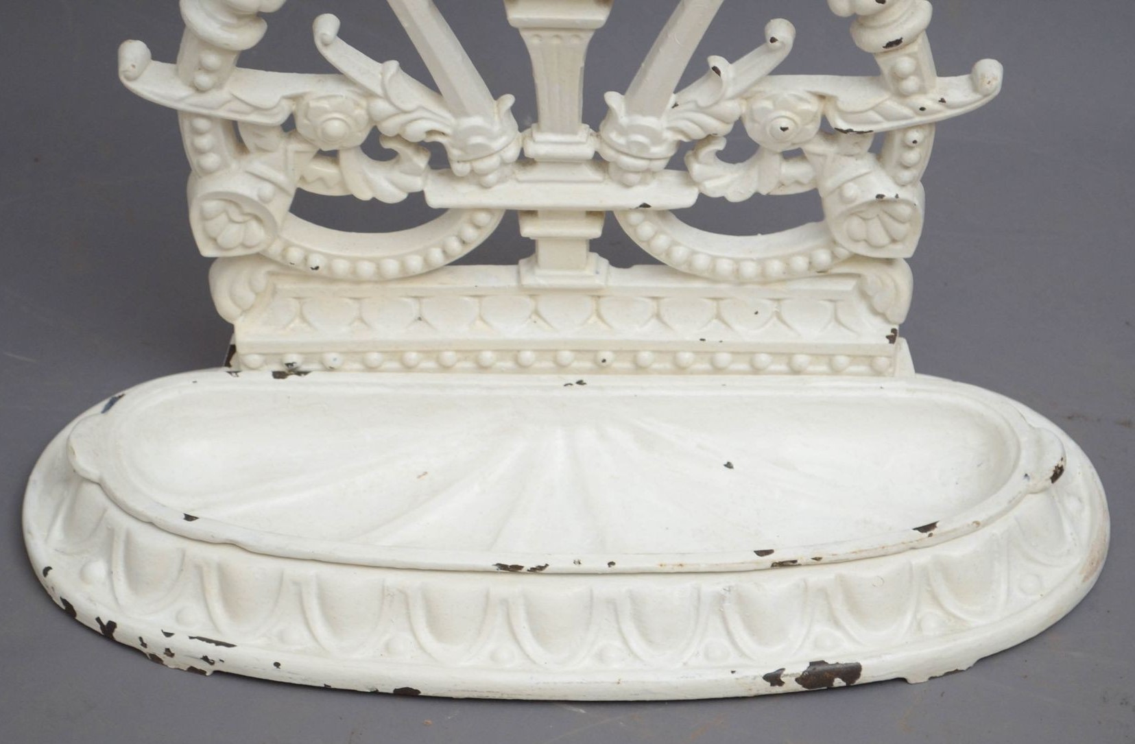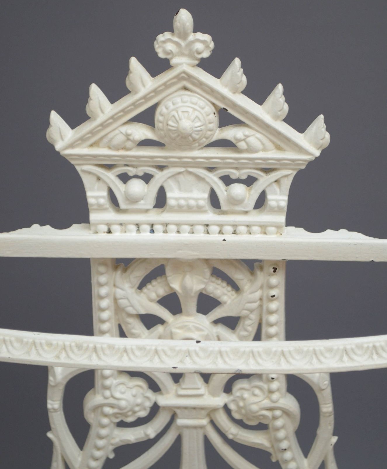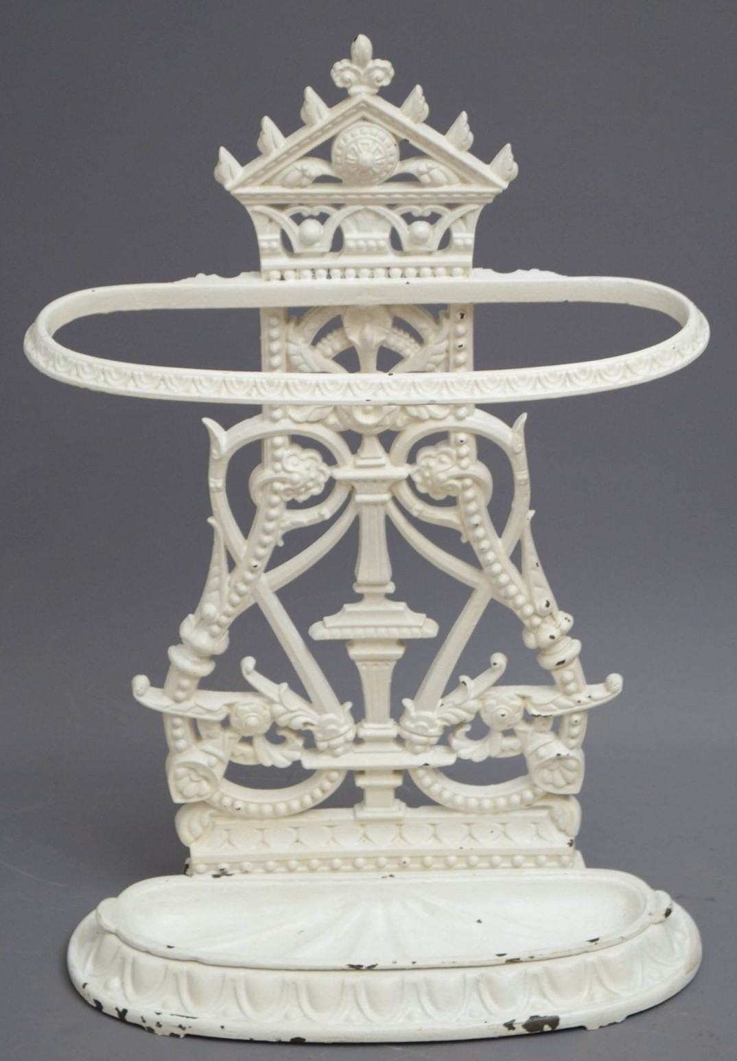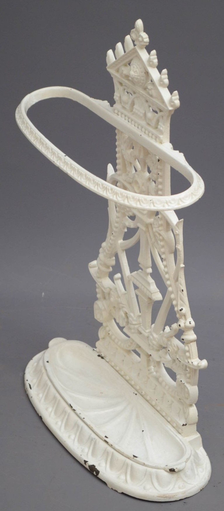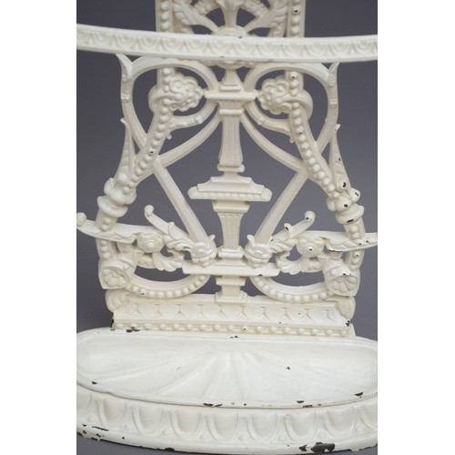 A Victorian Period cast iron umbrella stand / walking stick stand in the manner of Christopher Dresser with intricate pierced design and shell shaped removable drip tray. English Circa 1880