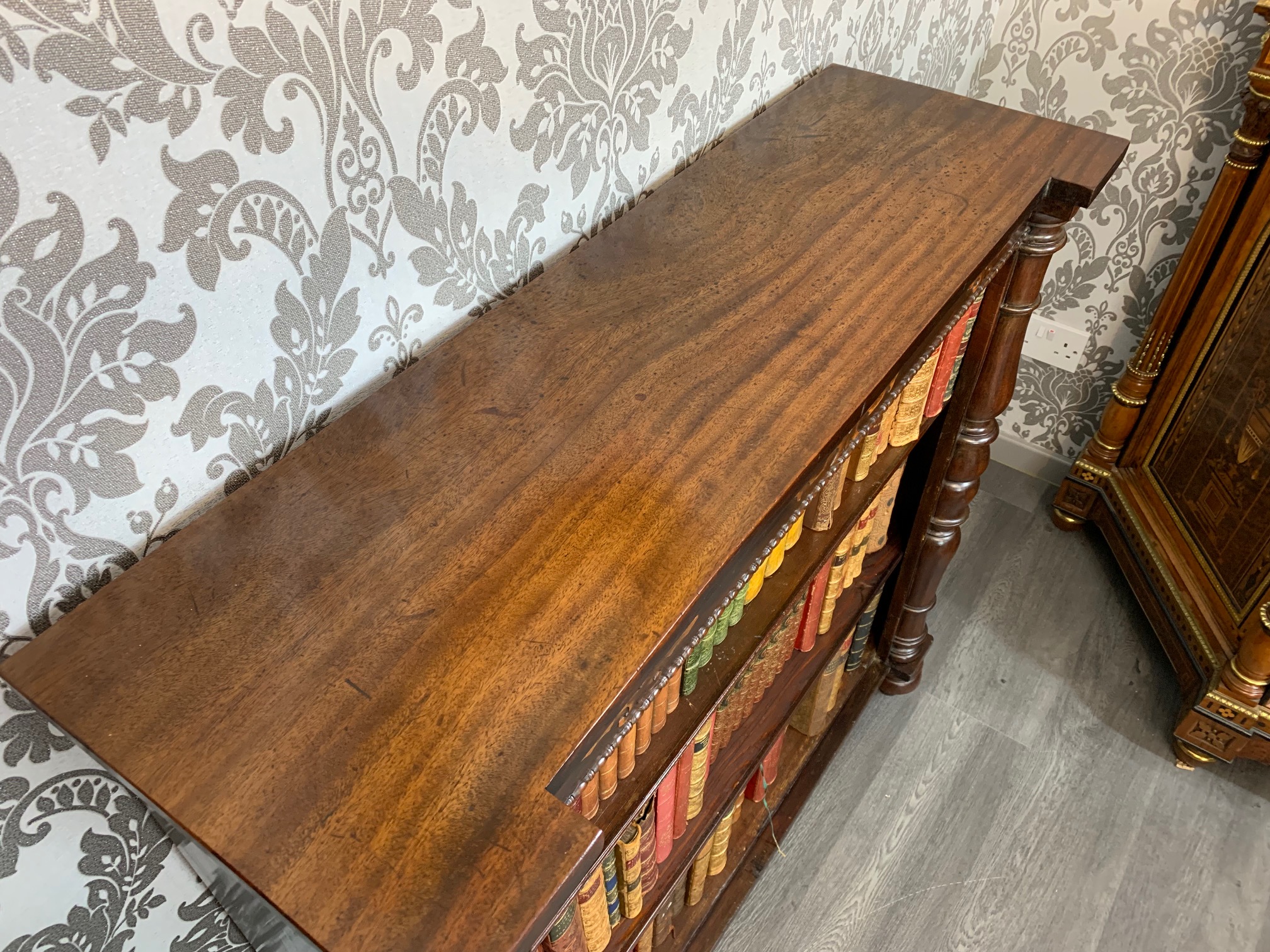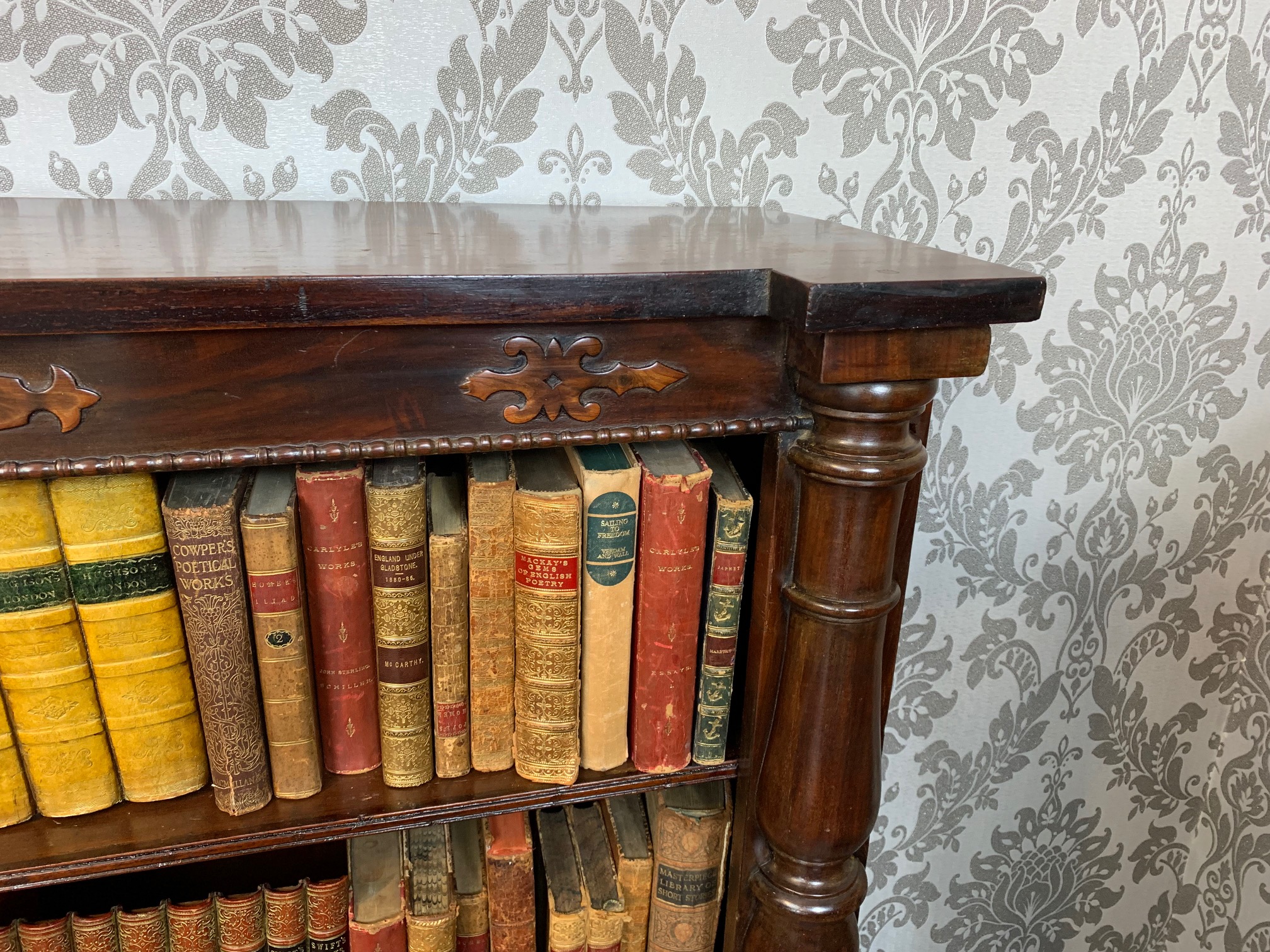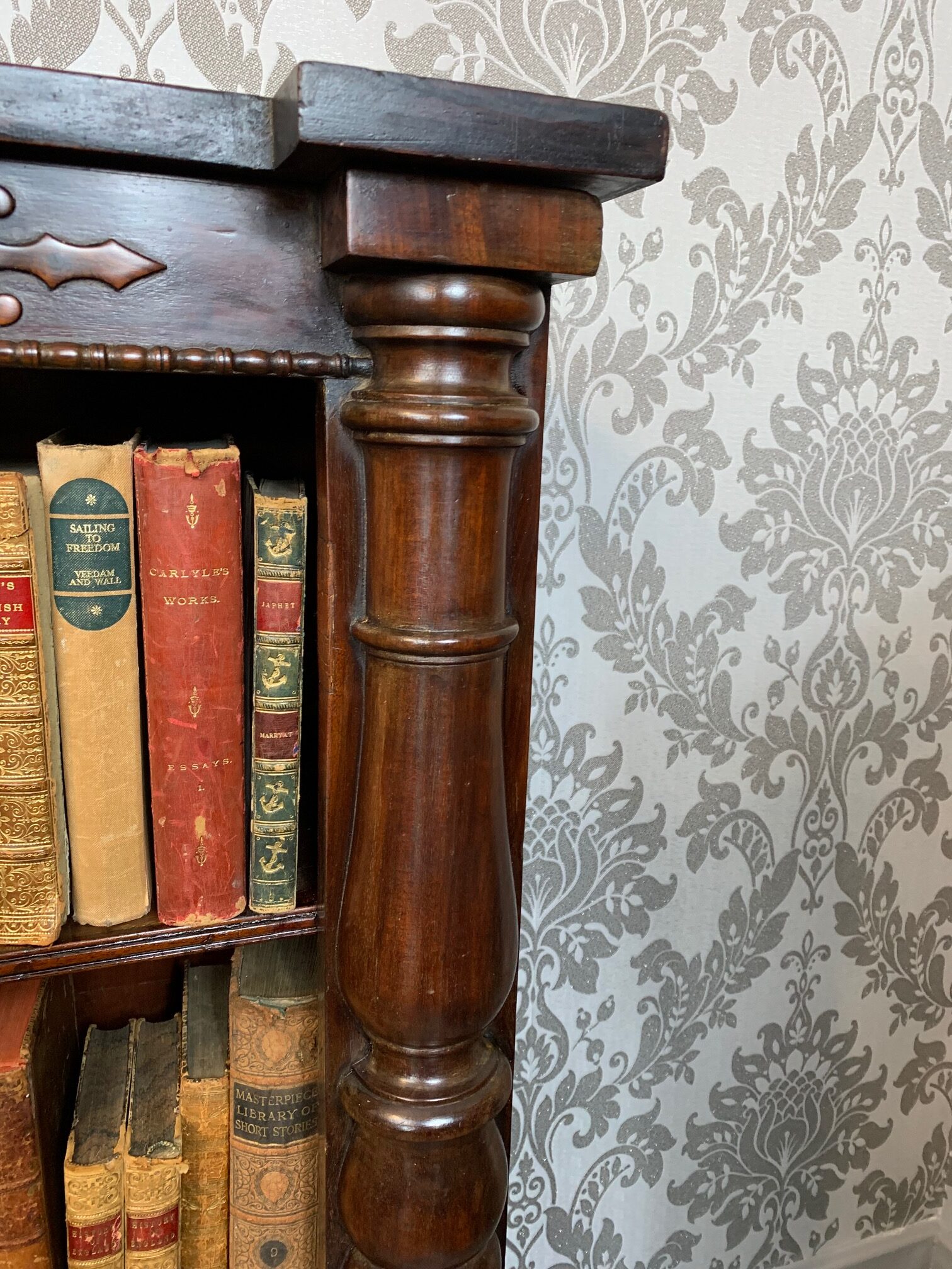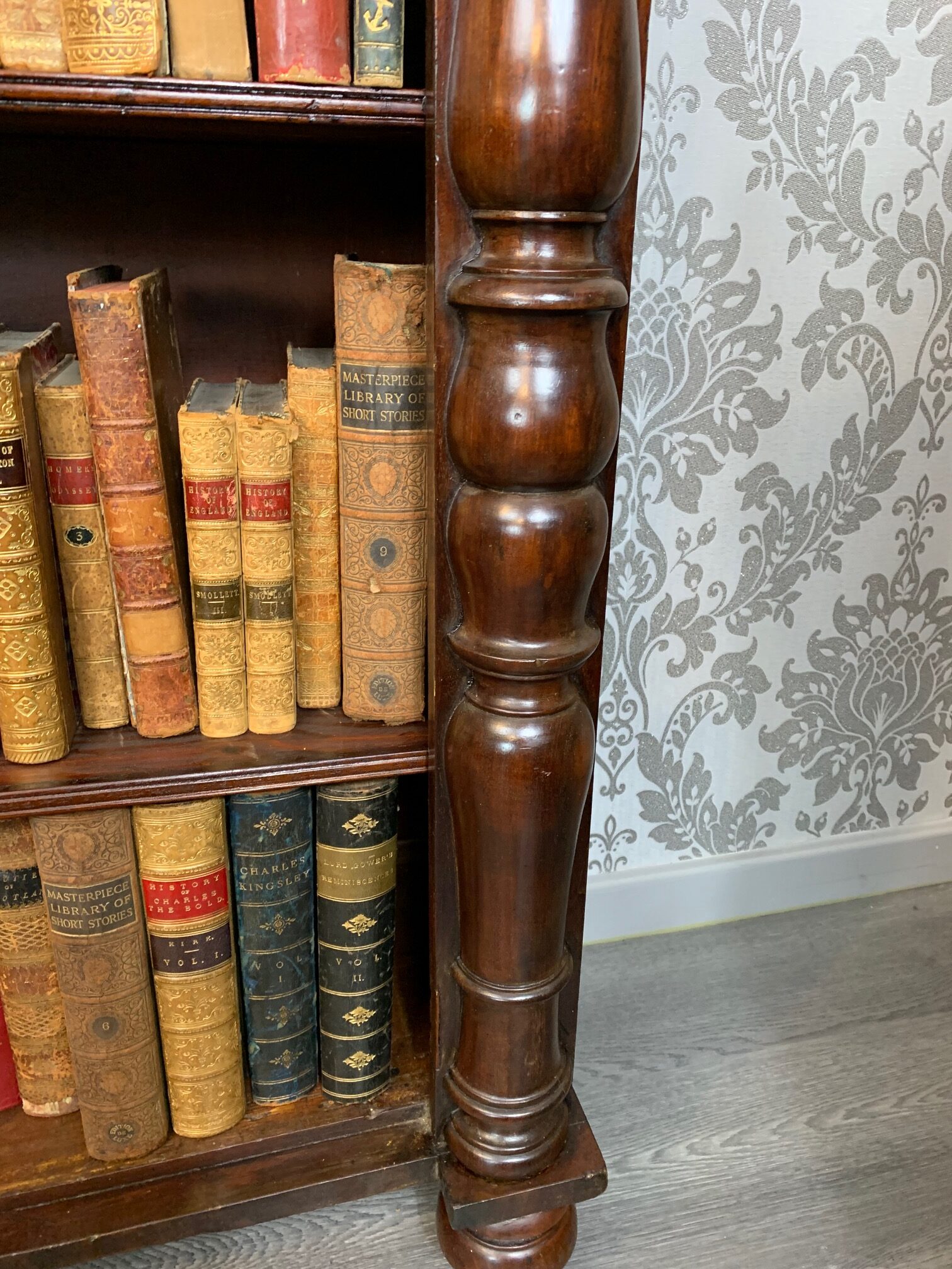 CompareA Victorian Period mahogany antique open bookcase. Having an inverted breakfront solid mahogany top above an arrangement of two adjustable shelves with solid mahogany sides and half round turned columns to the pilasters. Raised on turned bun feet. English circa 1860, excellent condition, cleaned and waxed