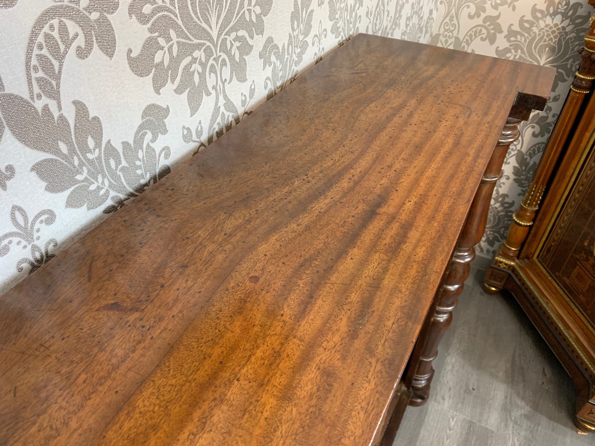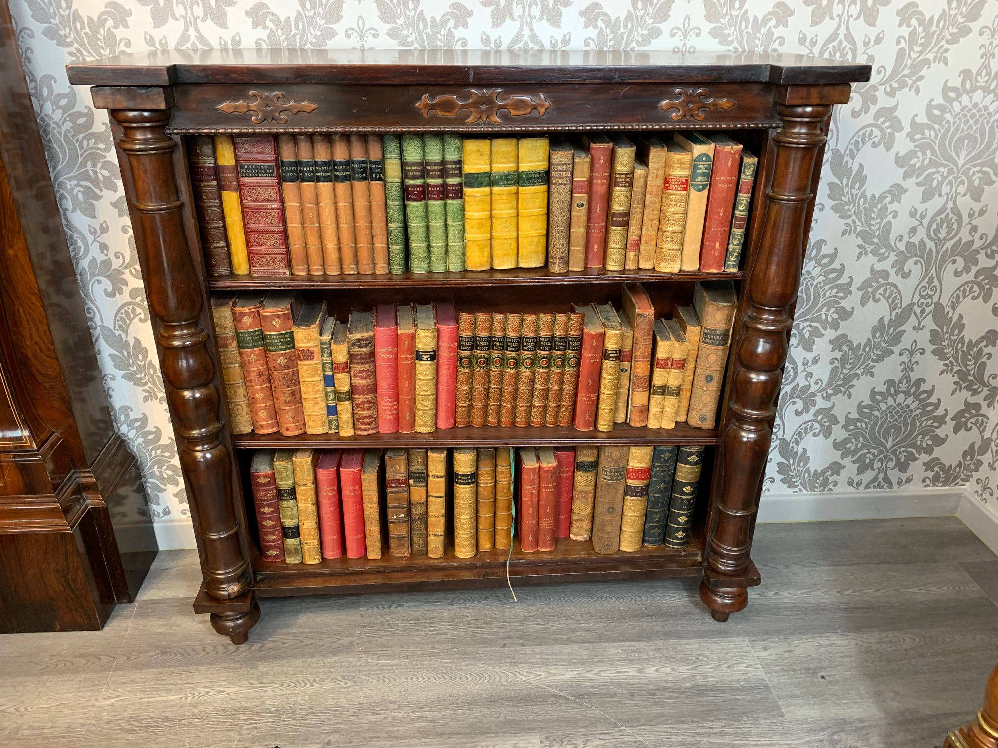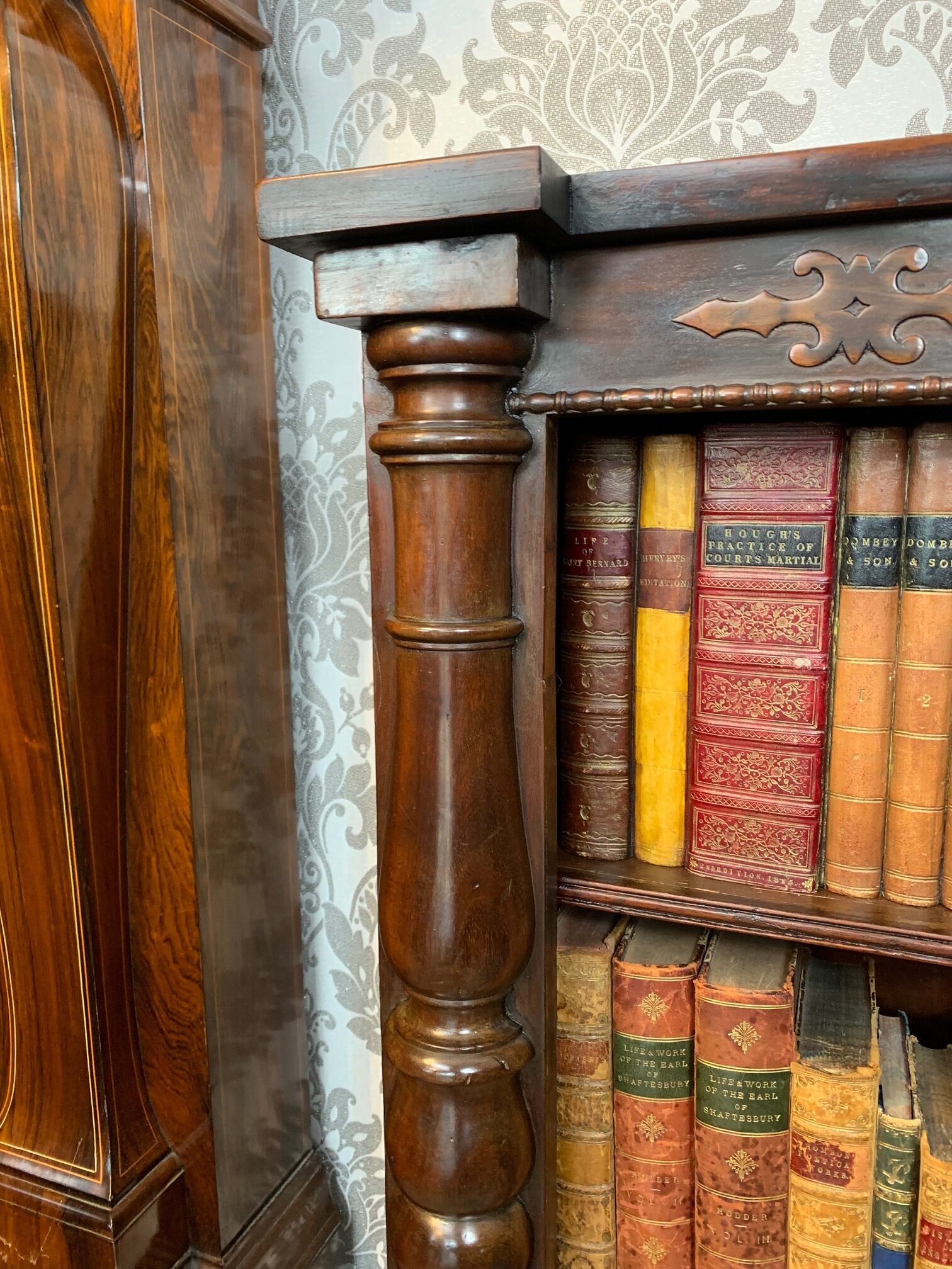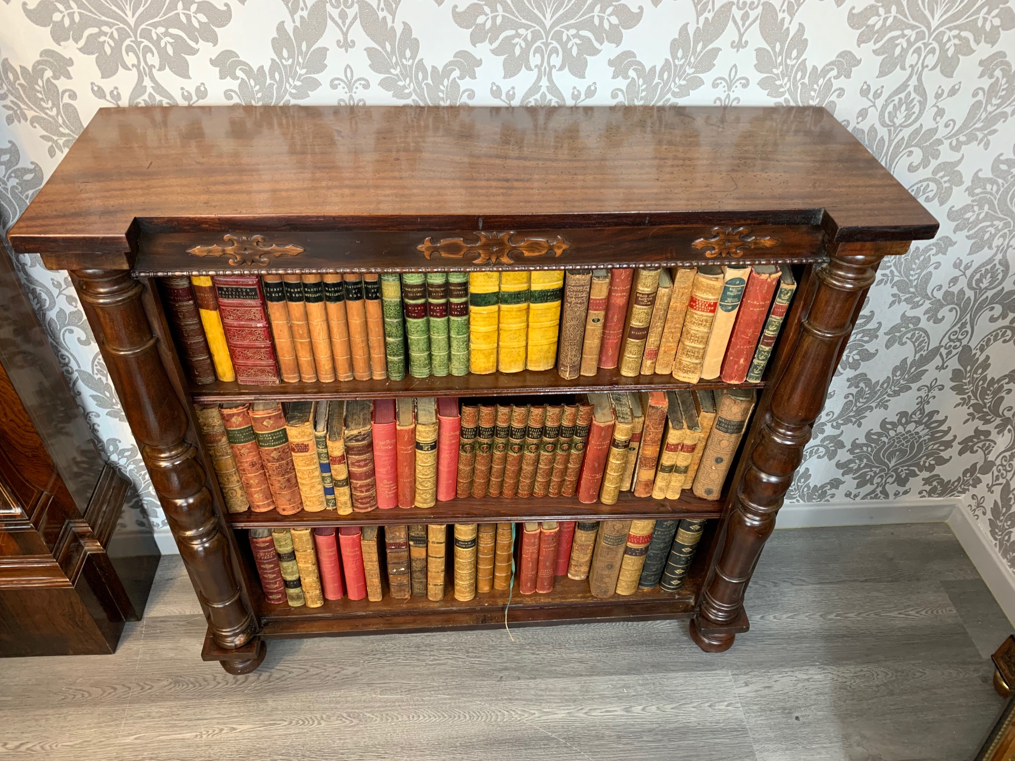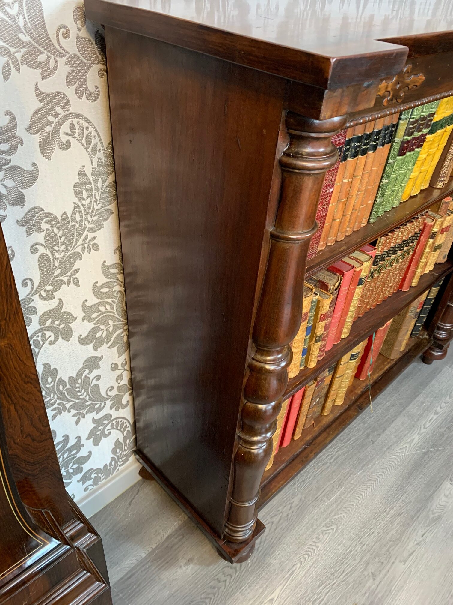 CompareA Victorian Period mahogany antique open bookcase. Having an inverted breakfront solid mahogany top above an arrangement of two adjustable shelves with solid mahogany sides and half round turned columns to the pilasters. Raised on turned bun feet. English circa 1860, excellent condition, cleaned and waxed