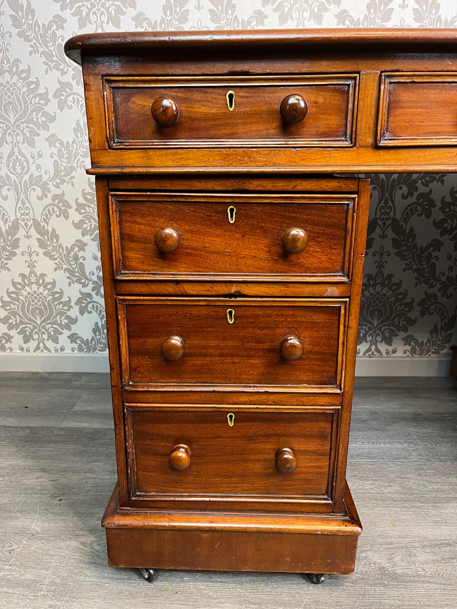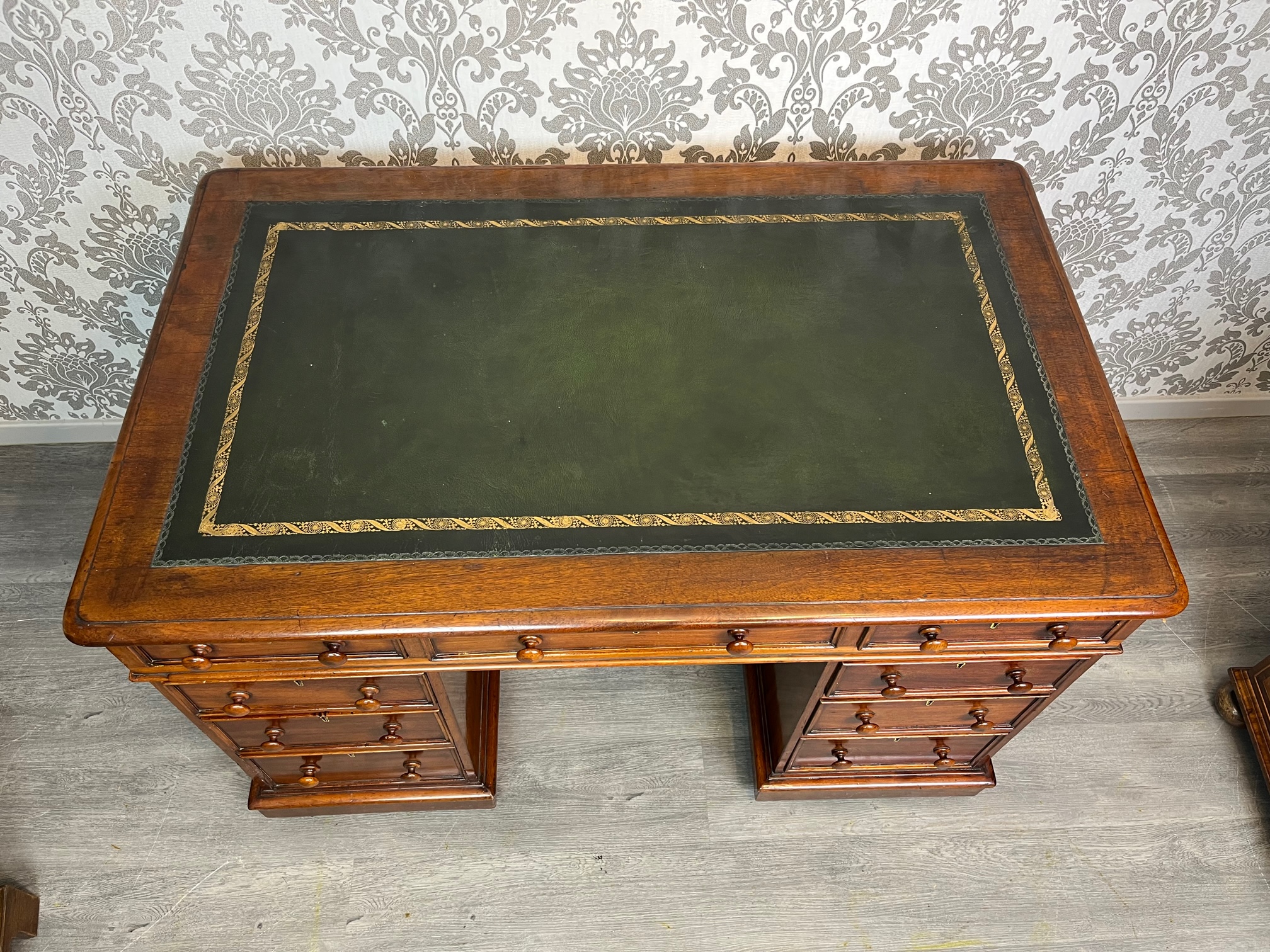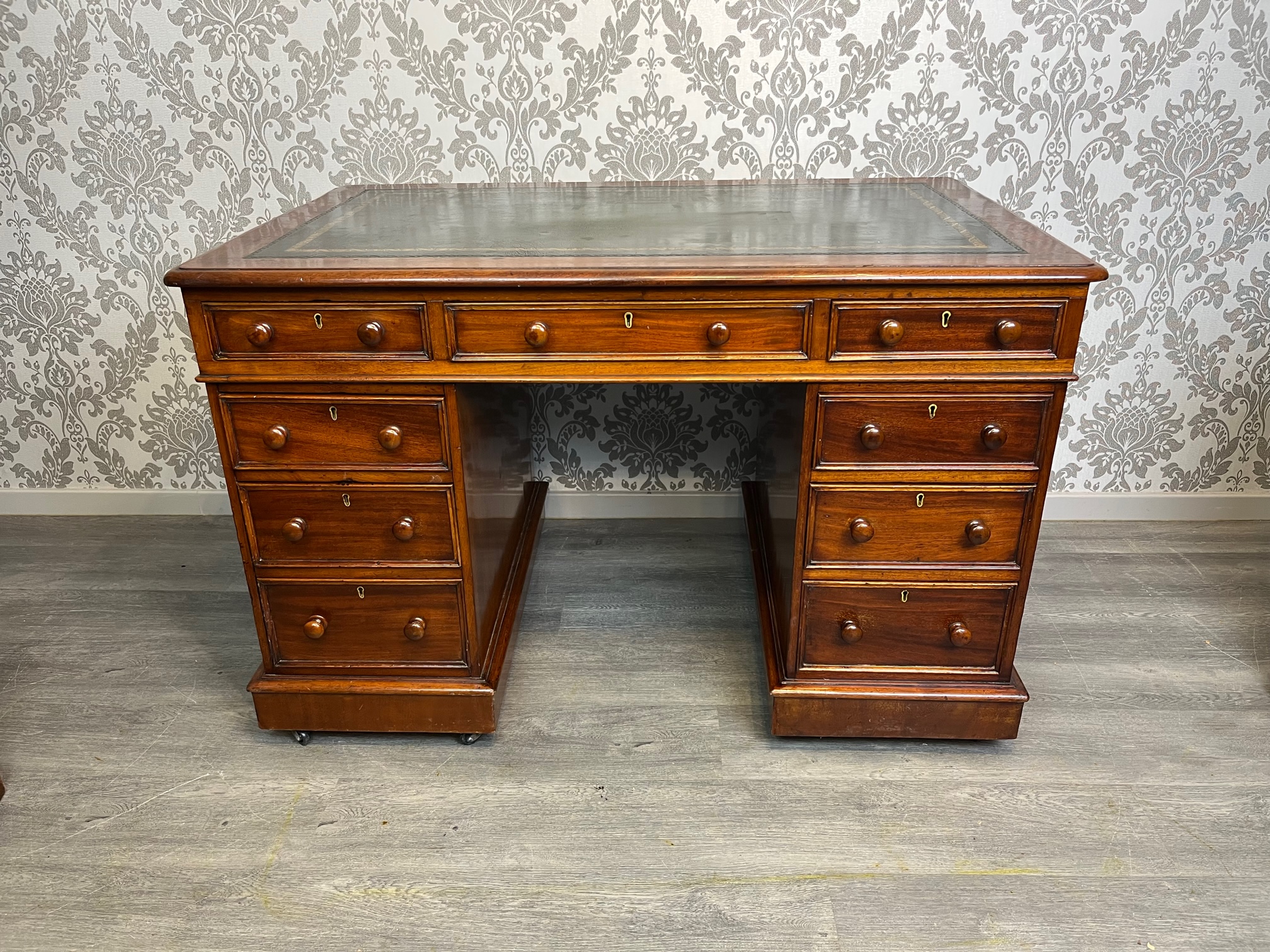 CompareA Victorian Period mahogany three part antique pedestal desk. The rectangular solid mahogany top having an inset green leather writing surface and the desk having an arrangement of nine mahogany lined rectangular drawers, retaining the original drawer pulls and chamfered mouldings. Having solid mahogany sides and back and raised on castors. Stamped Woolard & Sons, Cabinet makers, London to the drawer. English circa 1880, in good original condition throughout, the leather probably replaced 20-30 years ago.