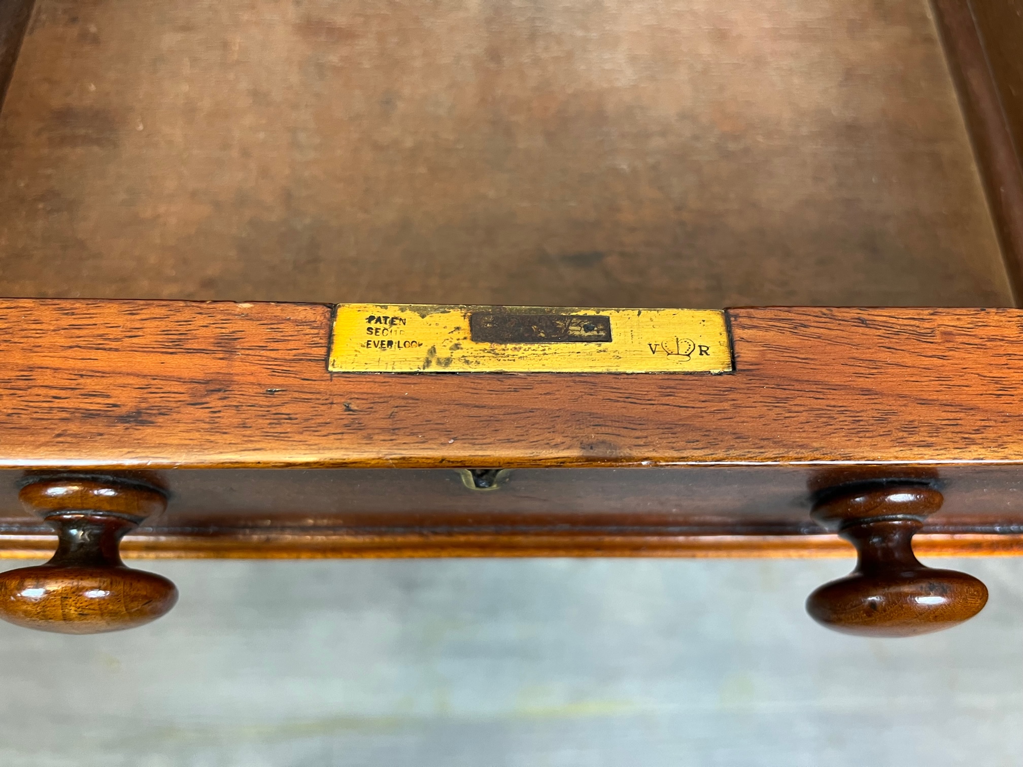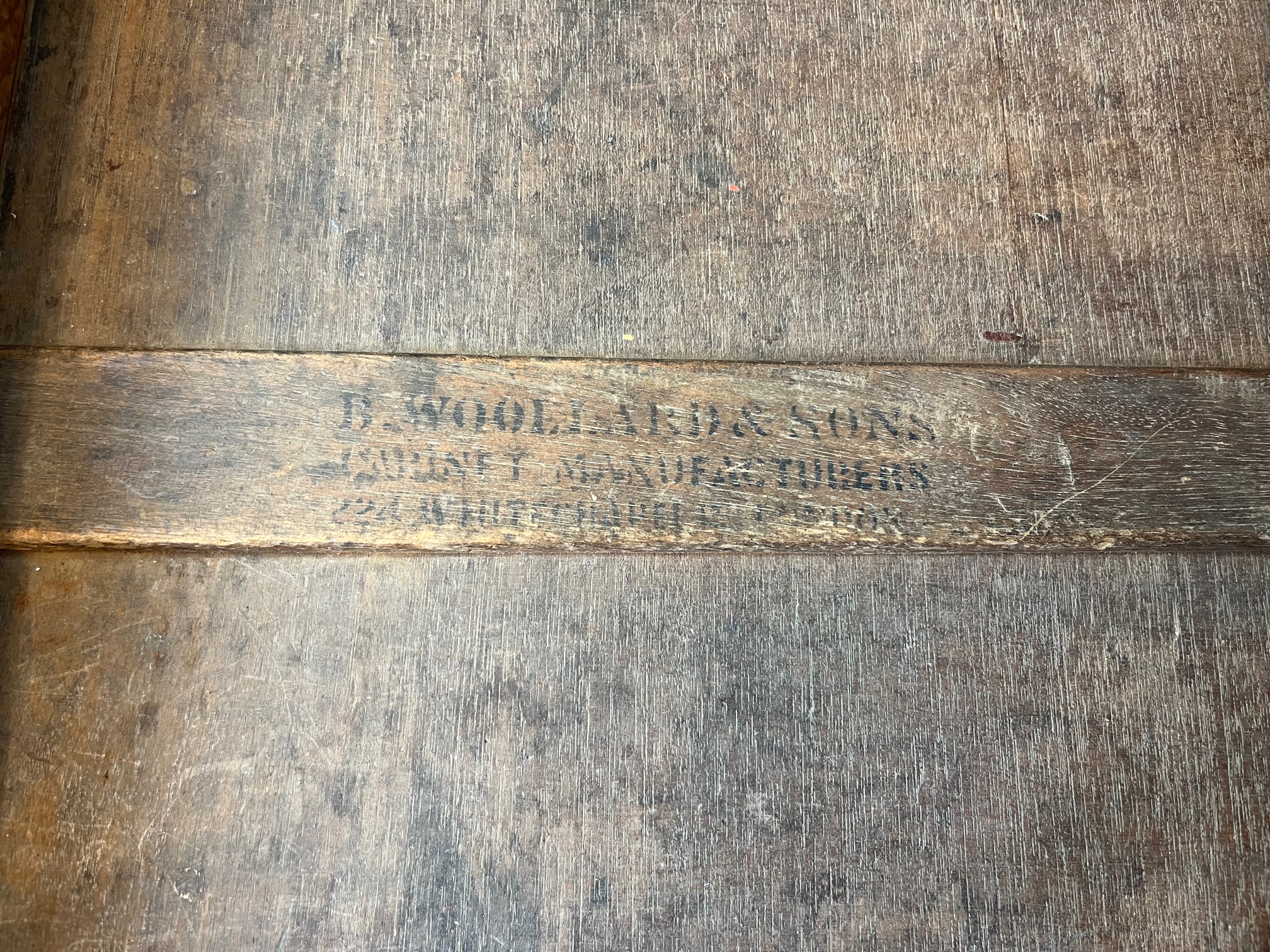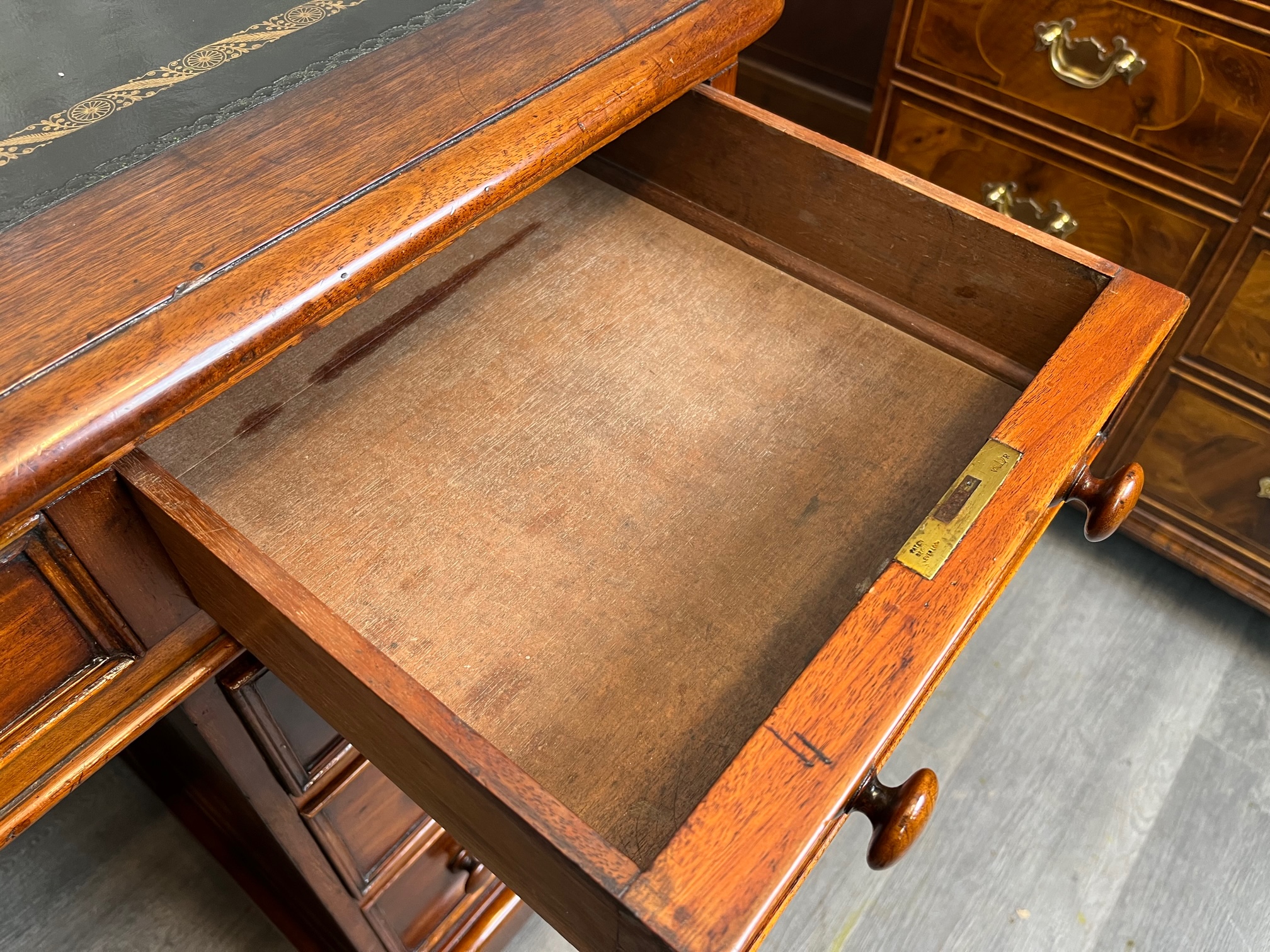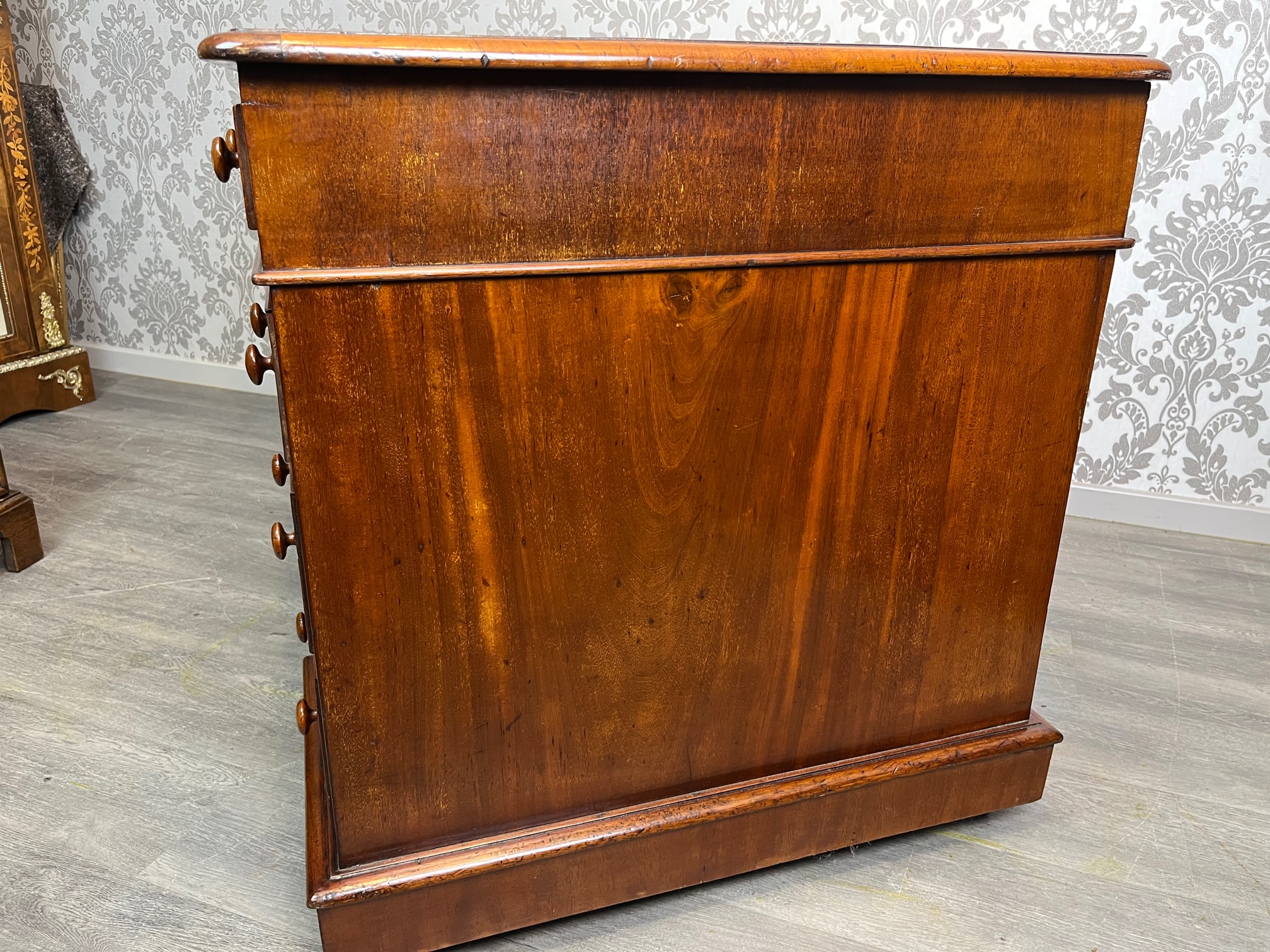 CompareA Victorian Period mahogany three part antique pedestal desk. The rectangular solid mahogany top having an inset green leather writing surface and the desk having an arrangement of nine mahogany lined rectangular drawers, retaining the original drawer pulls and chamfered mouldings. Having solid mahogany sides and back and raised on castors. Stamped Woolard & Sons, Cabinet makers, London to the drawer. English circa 1880, in good original condition throughout, the leather probably replaced 20-30 years ago.