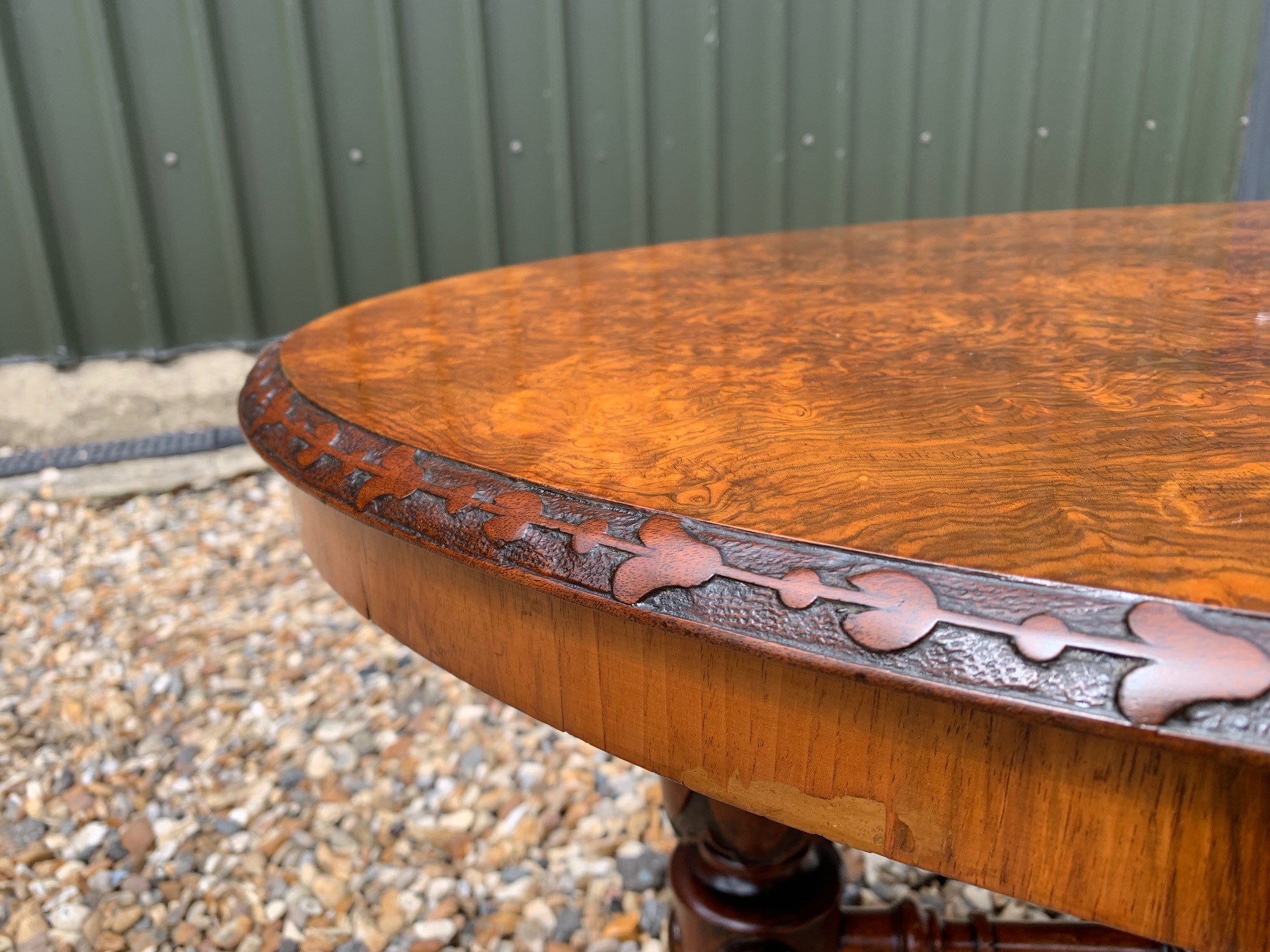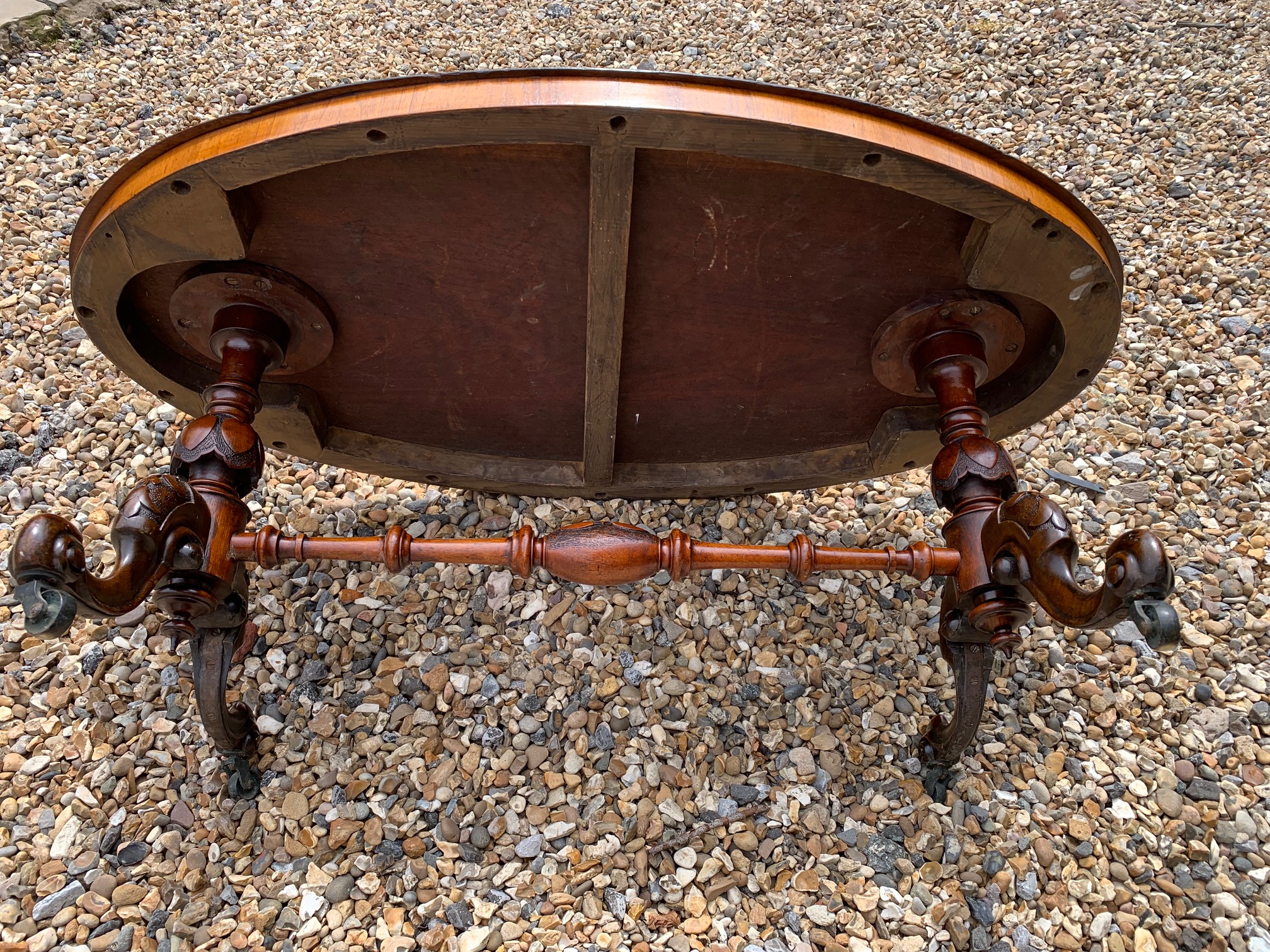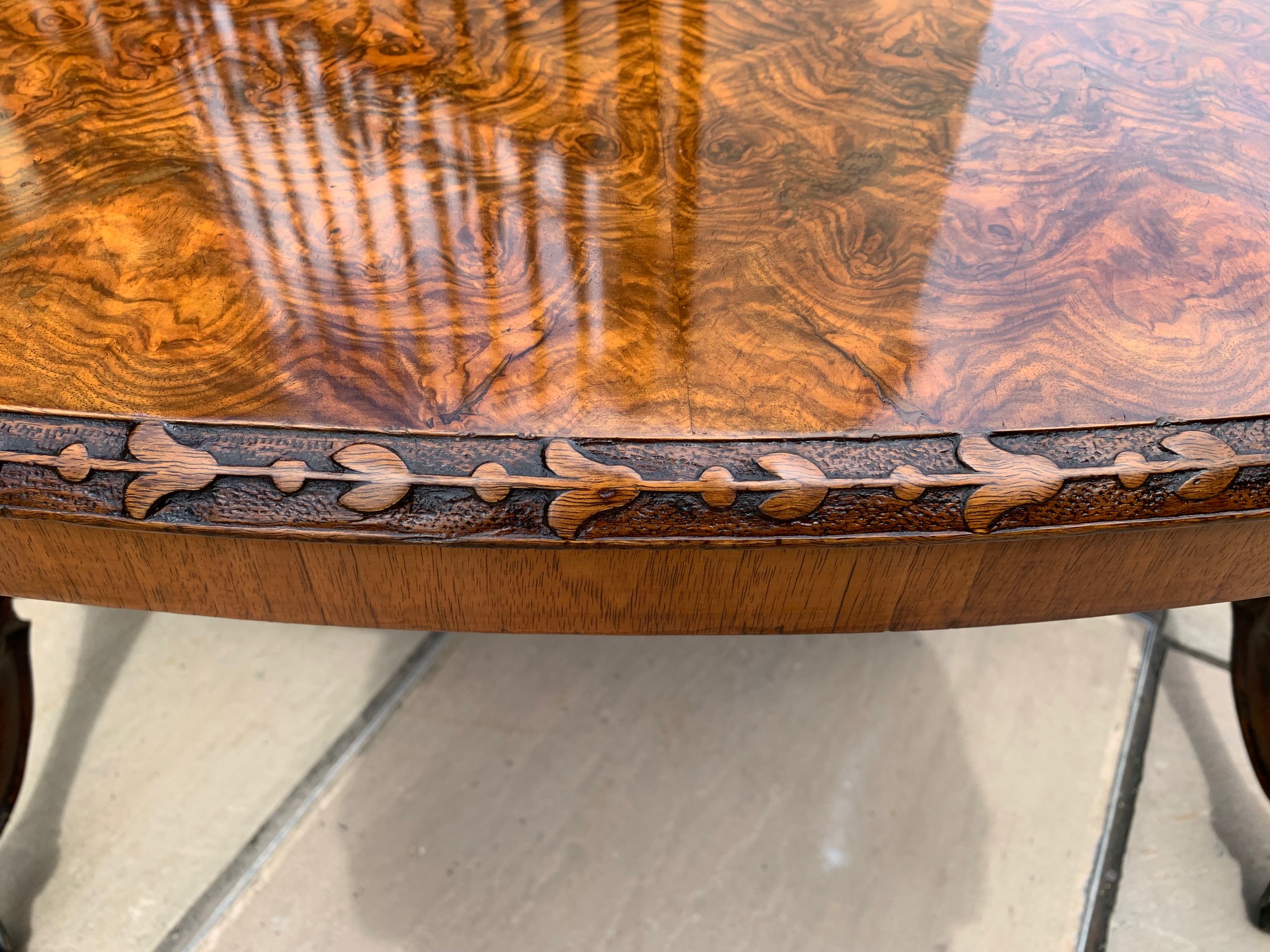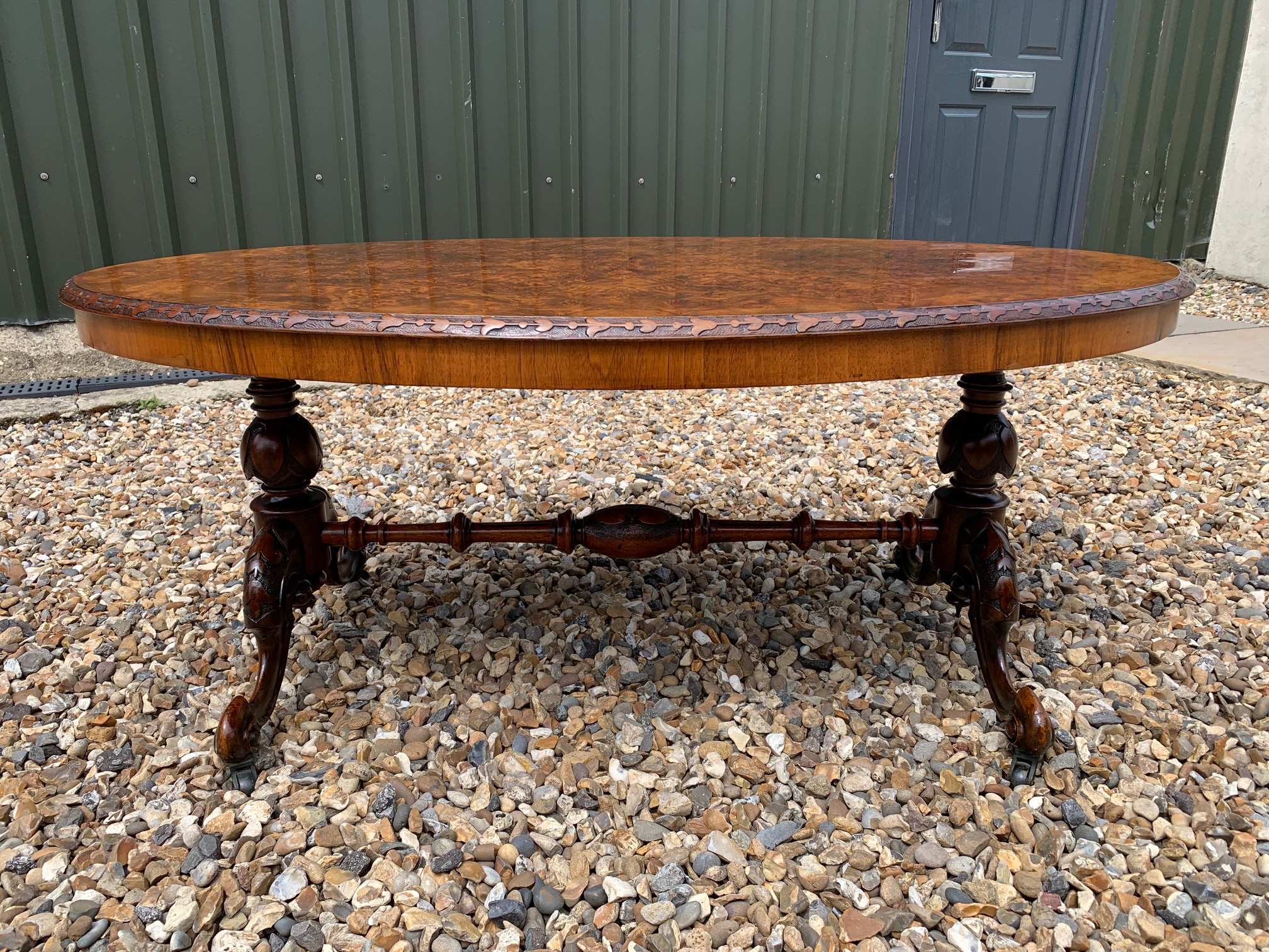 CompareA Victorian Period oval burr walnut antique coffee table. The oval top veneered in beautifully figured burr walnut with a floral carved moulded edge. Raised on twin turned columns with acanthus carved cabriole supports united by a turned and carved stretcher. In superb condition, unfortunately the castors have seized but it does not effect the stability or use of the table. English circa 1870-1800