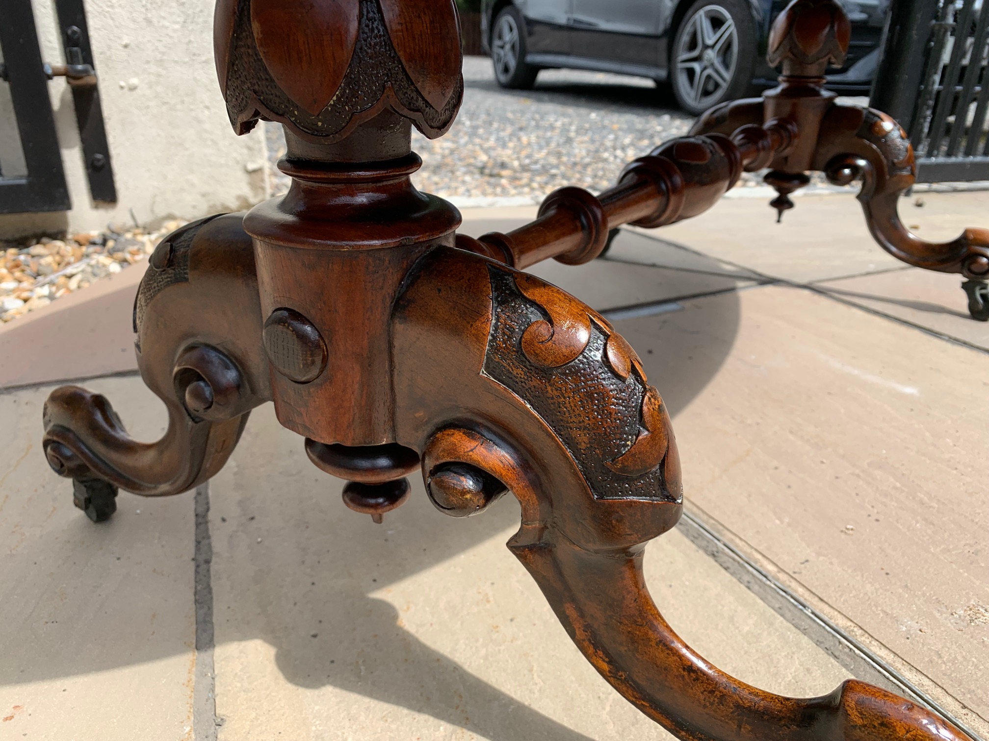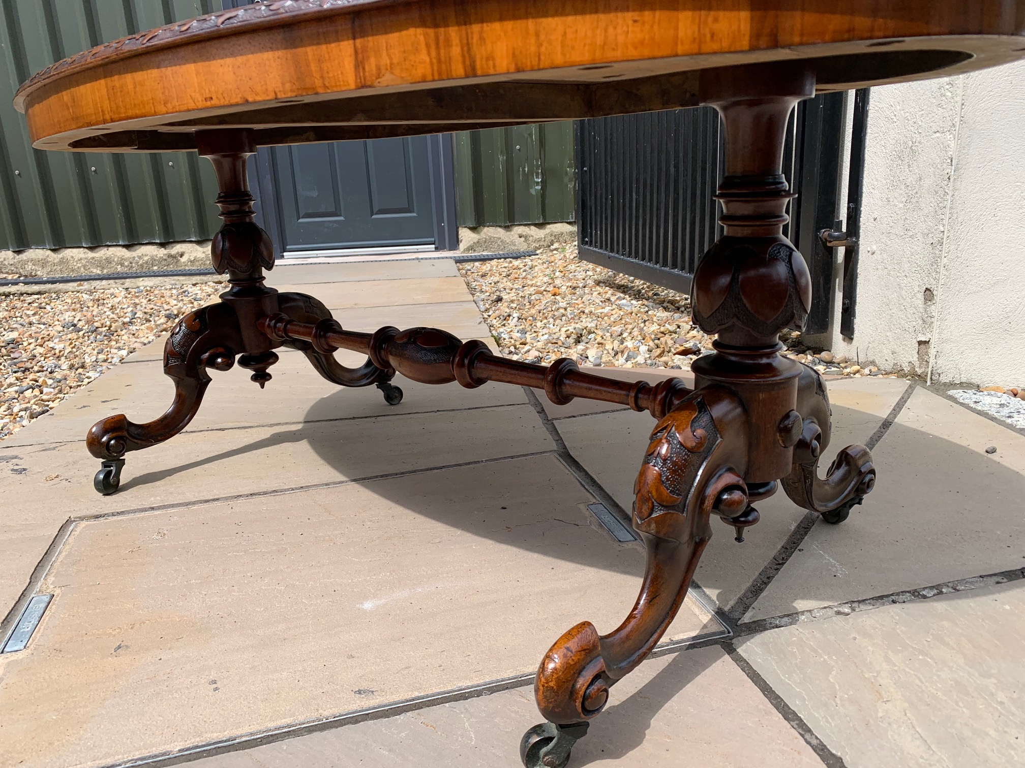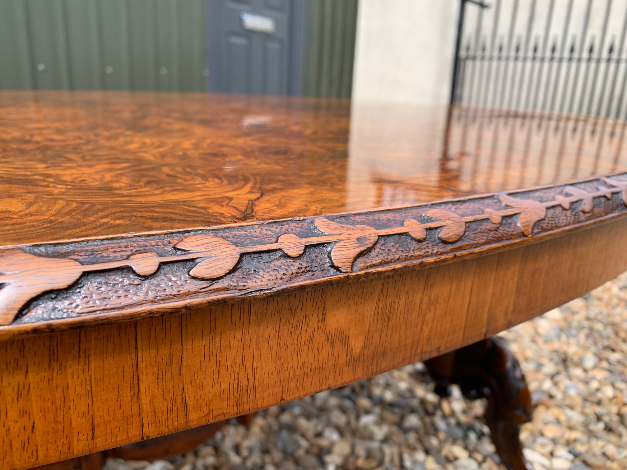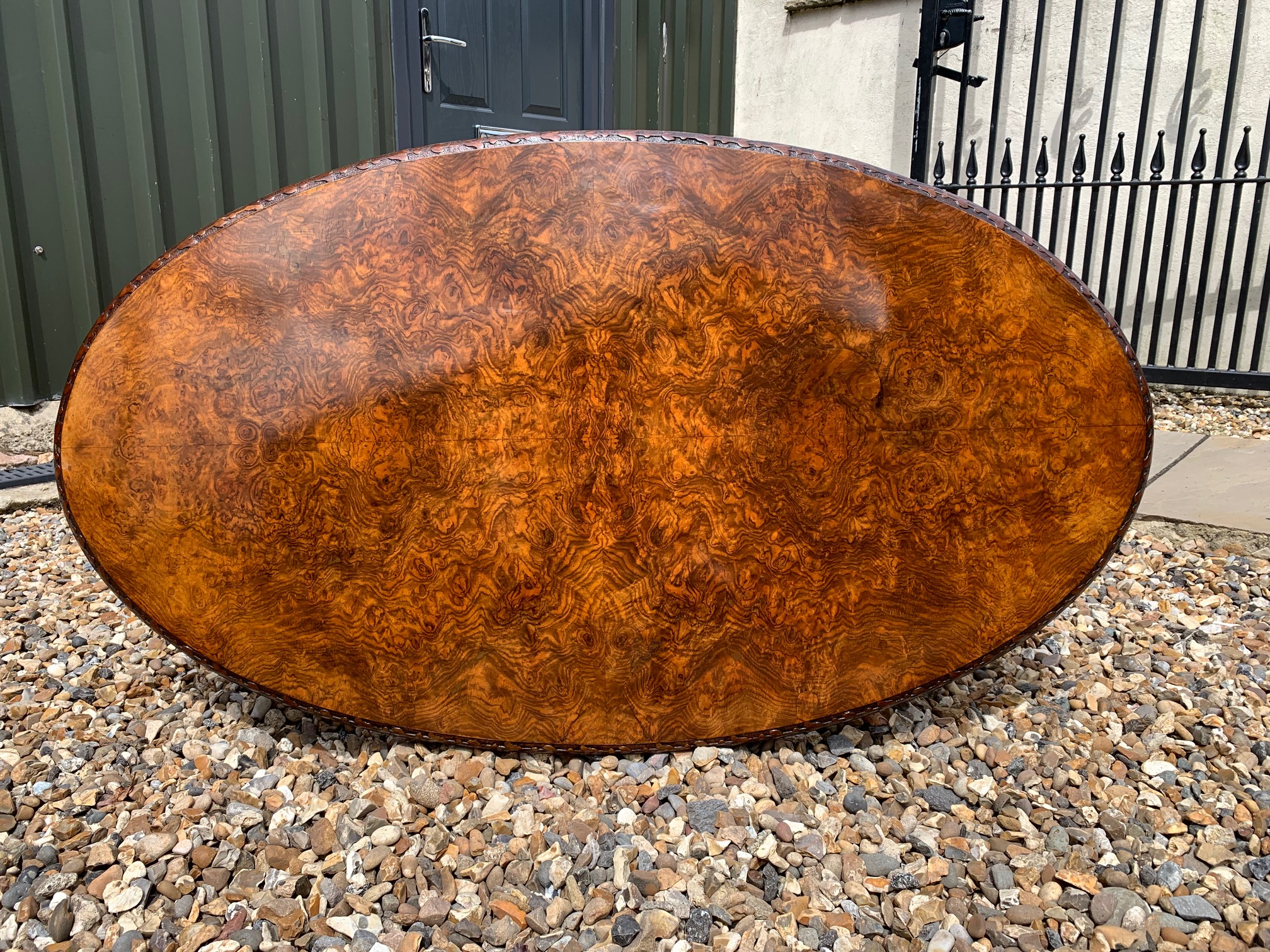 CompareA Victorian Period oval burr walnut antique coffee table. The oval top veneered in beautifully figured burr walnut with a floral carved moulded edge. Raised on twin turned columns with acanthus carved cabriole supports united by a turned and carved stretcher. In superb condition, unfortunately the castors have seized but it does not effect the stability or use of the table. English circa 1870-1800