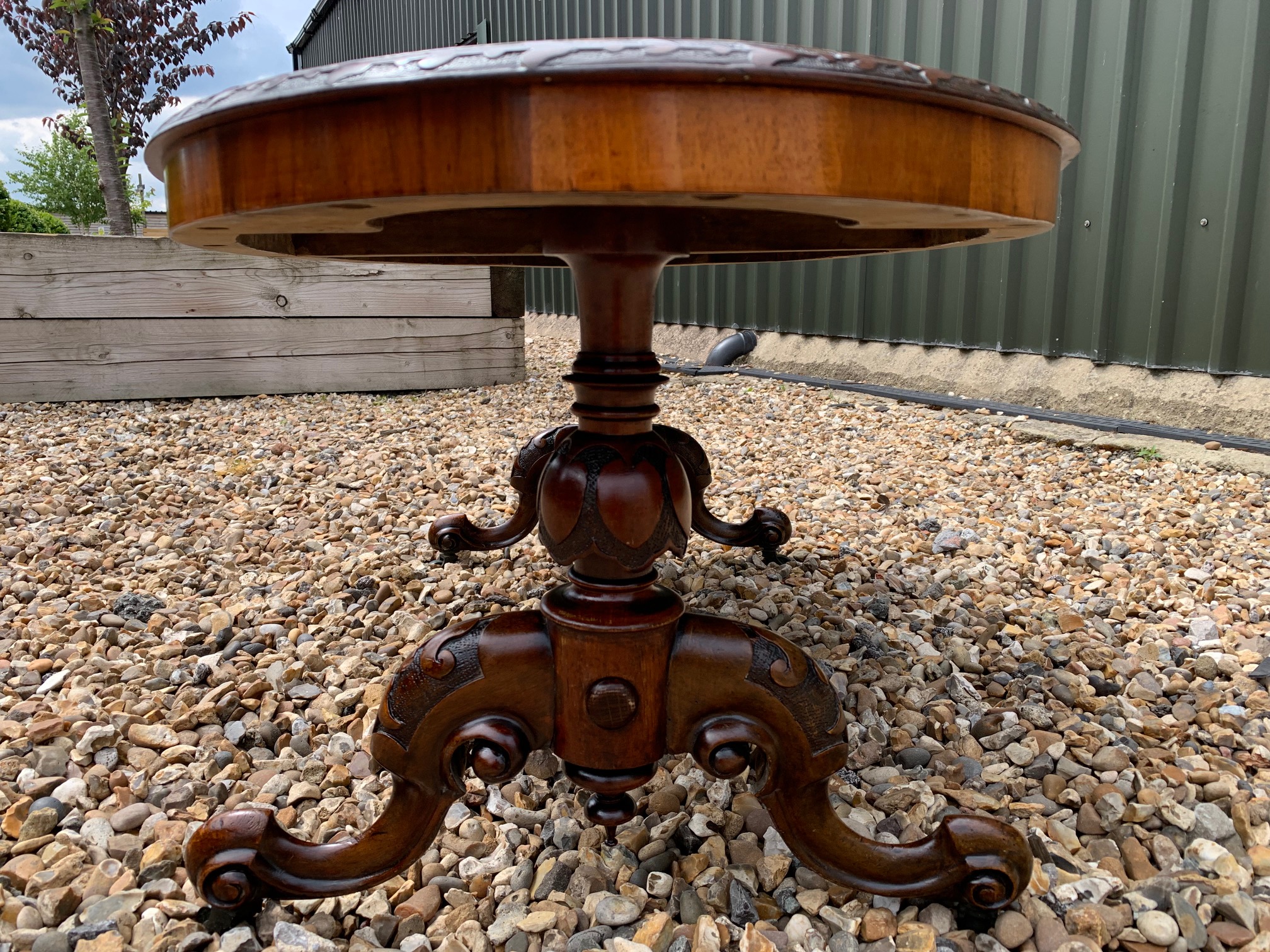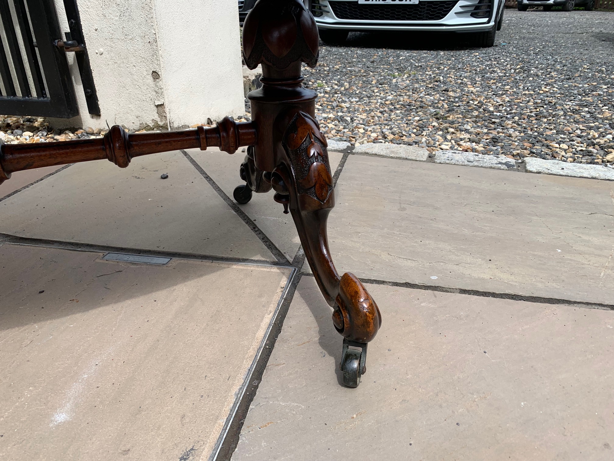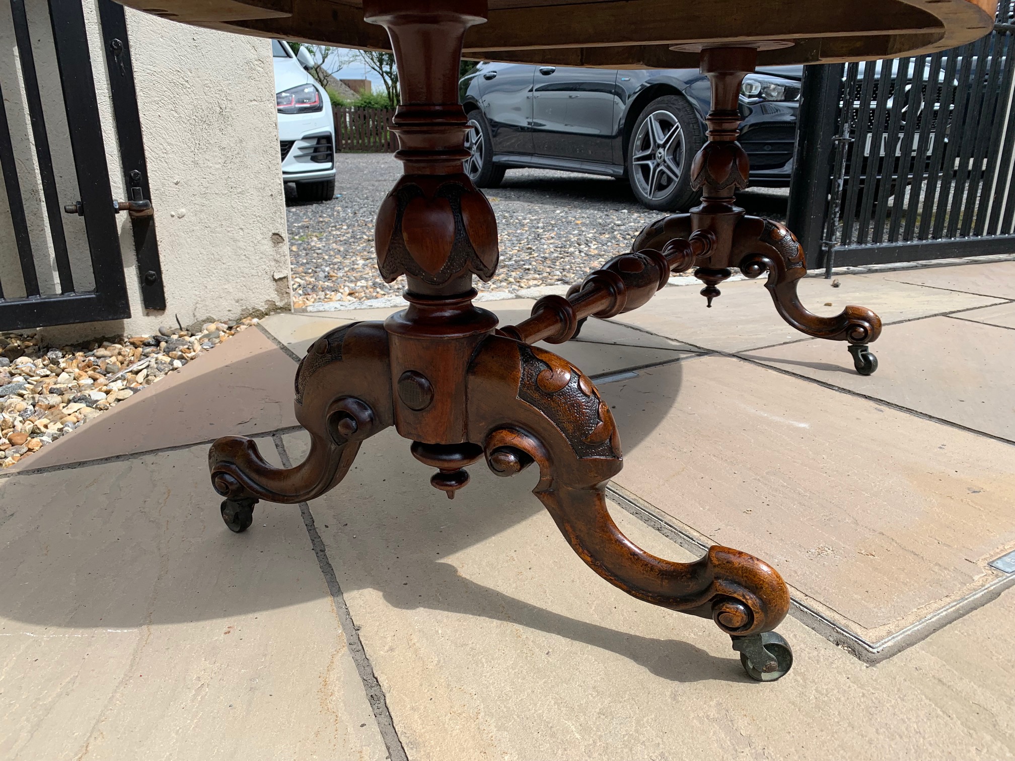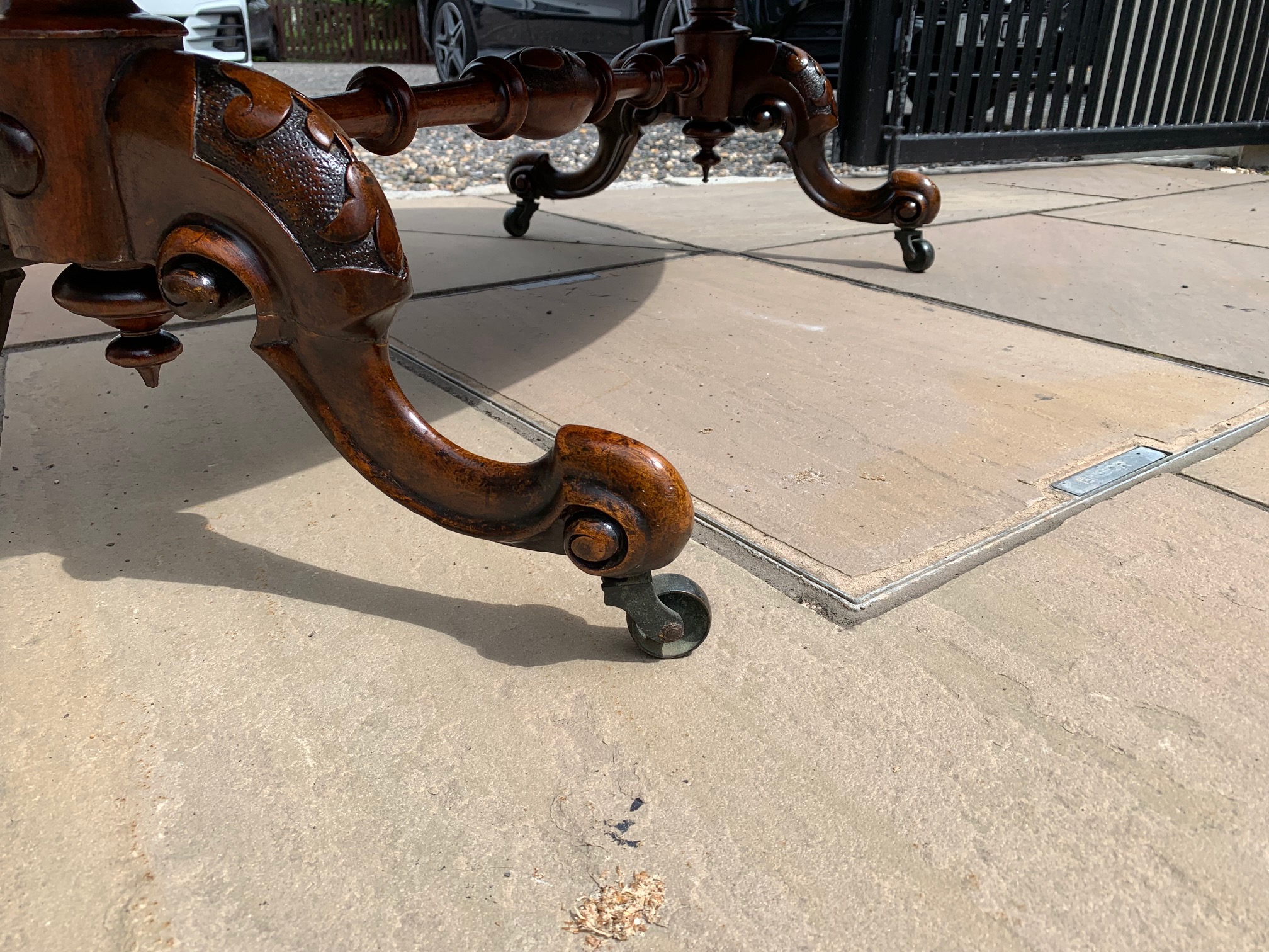 CompareA Victorian Period oval burr walnut antique coffee table. The oval top veneered in beautifully figured burr walnut with a floral carved moulded edge. Raised on twin turned columns with acanthus carved cabriole supports united by a turned and carved stretcher. In superb condition, unfortunately the castors have seized but it does not effect the stability or use of the table. English circa 1870-1800
