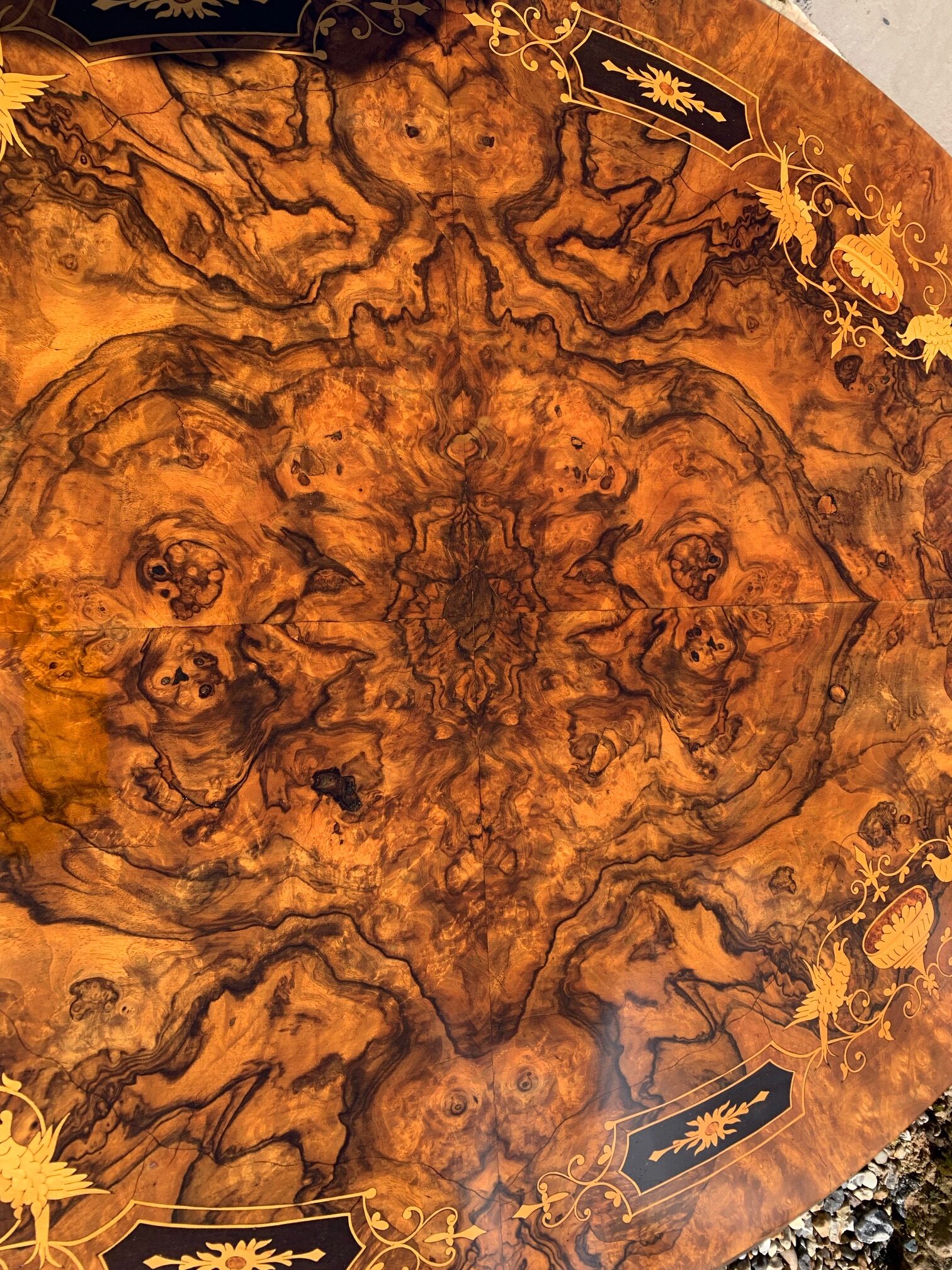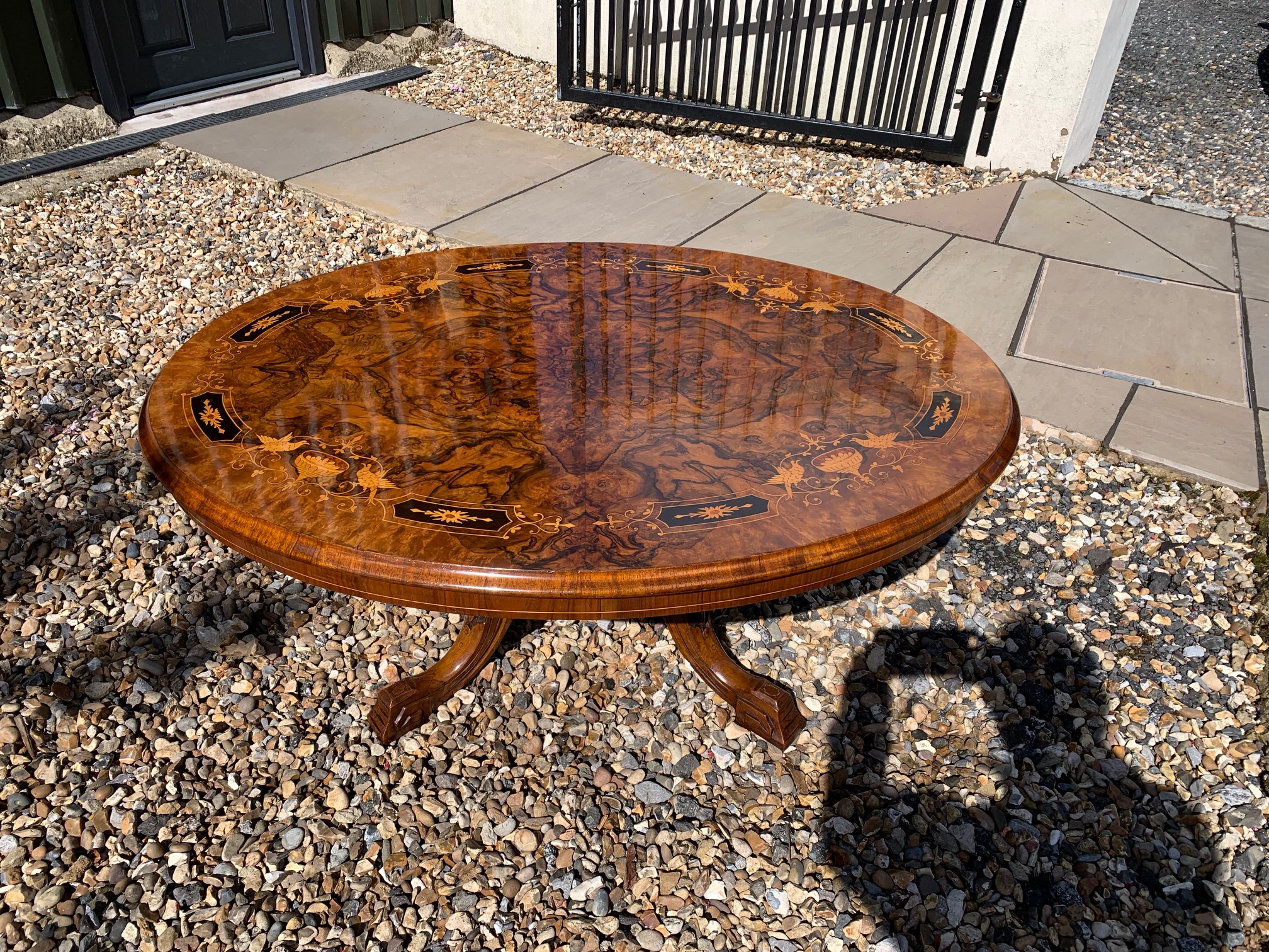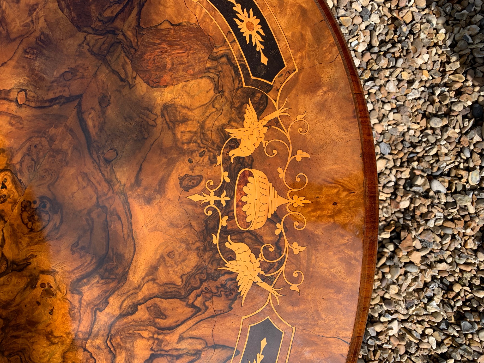 A Victorian Period oval marquetry and burr walnut antique coffee table
