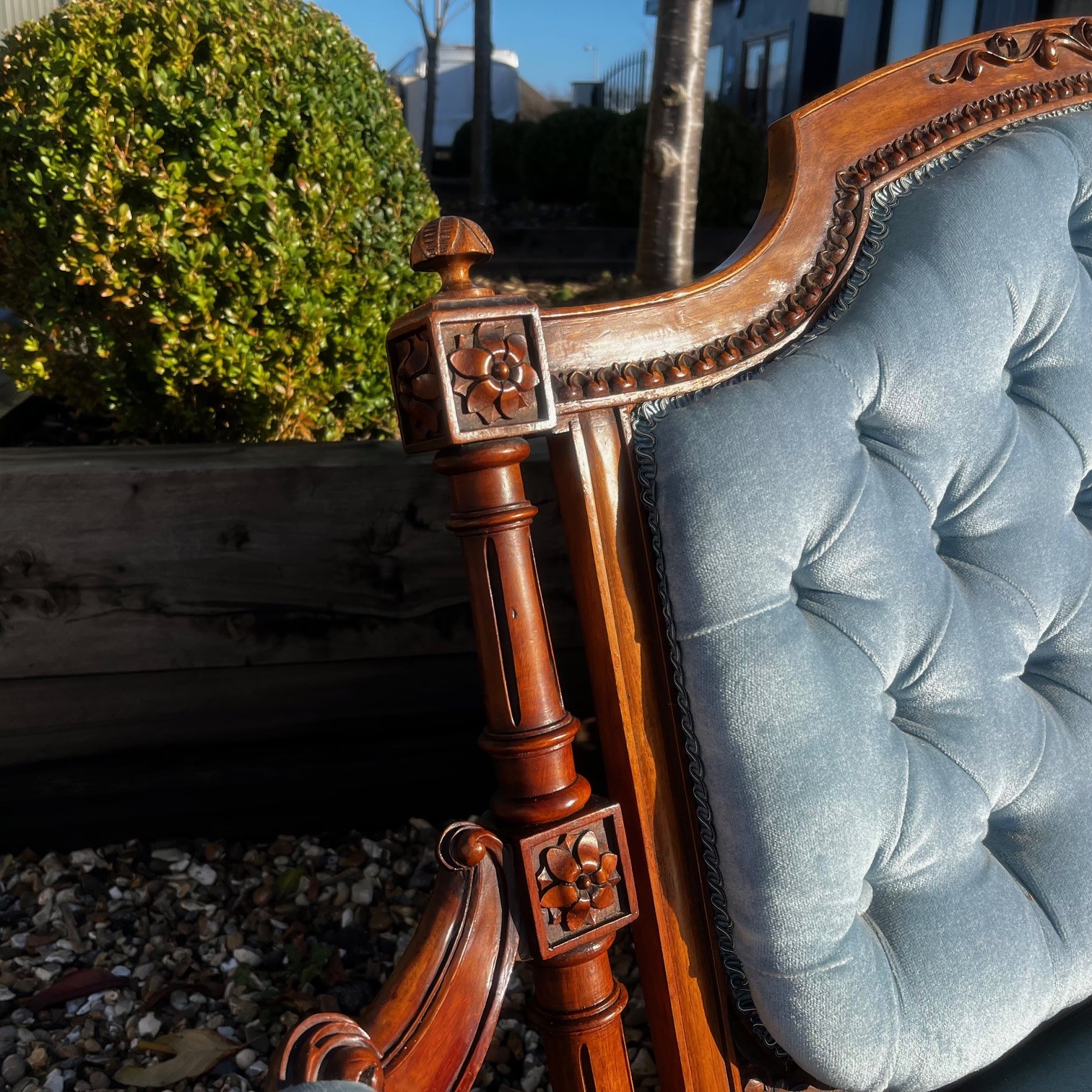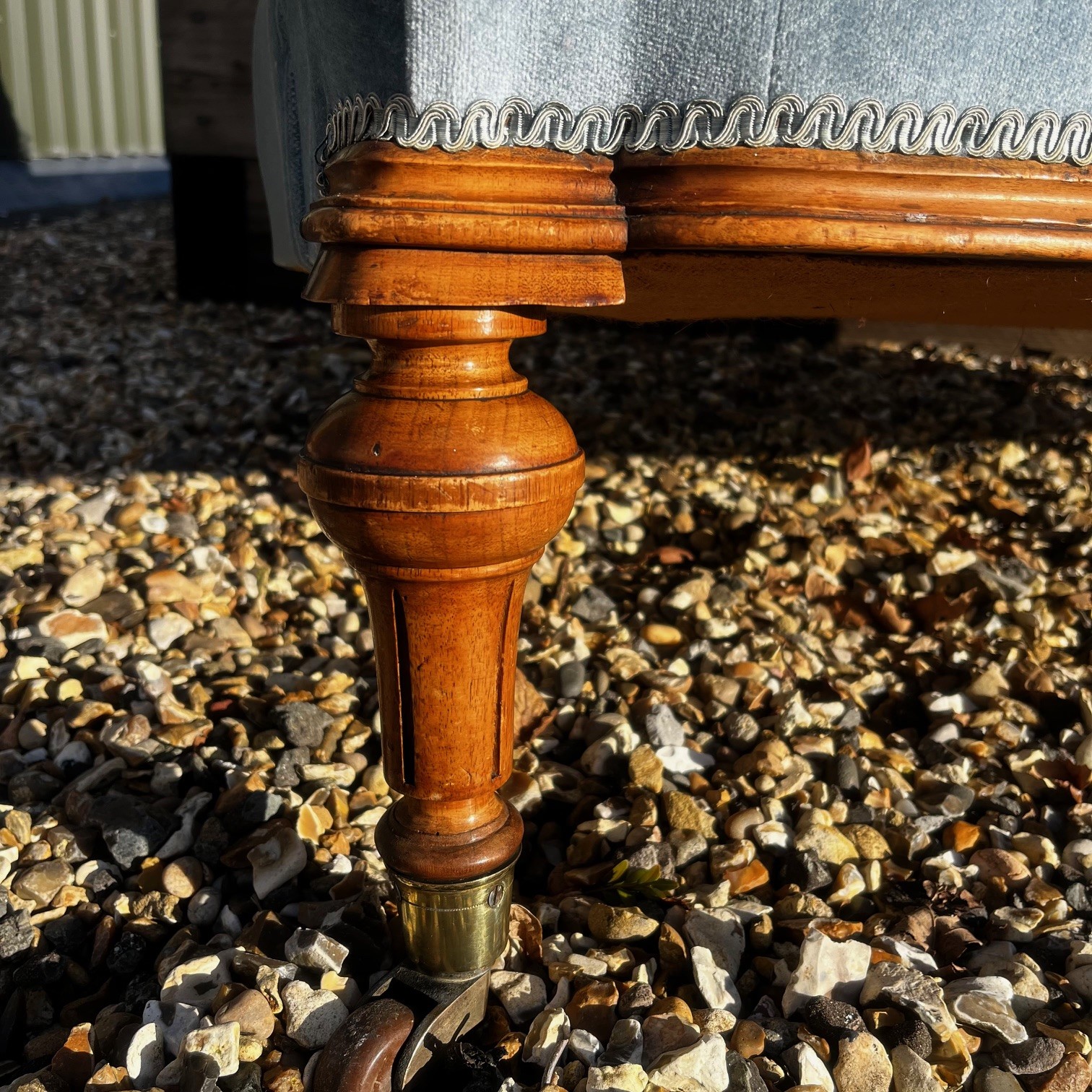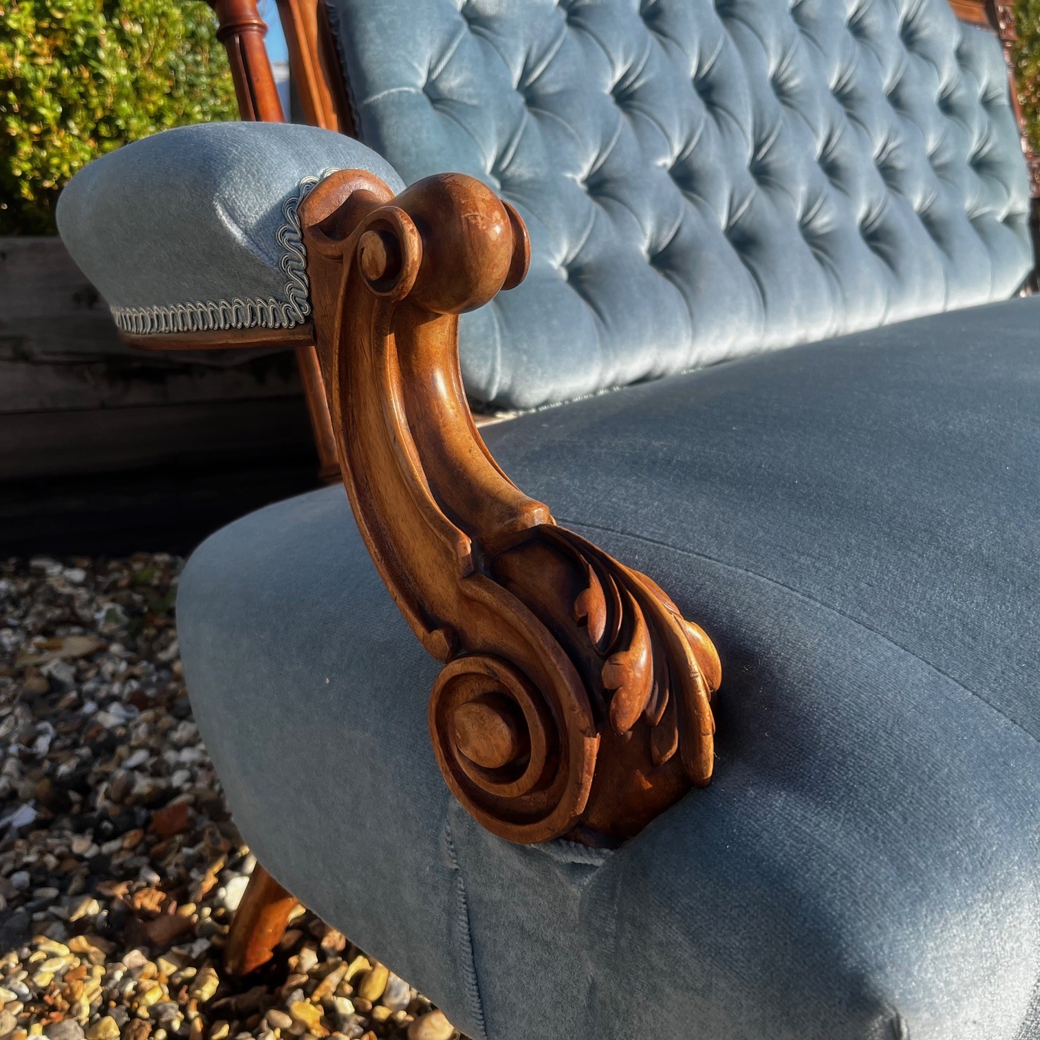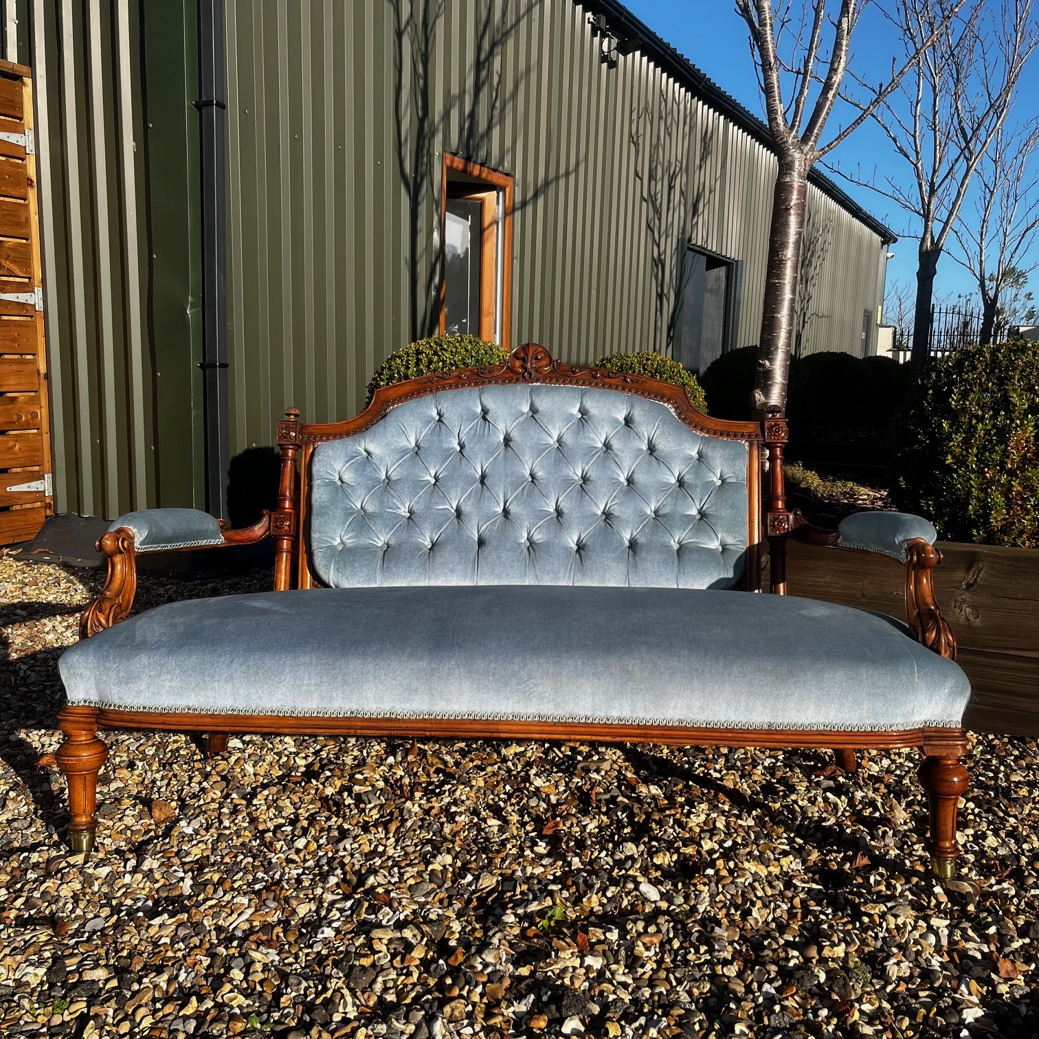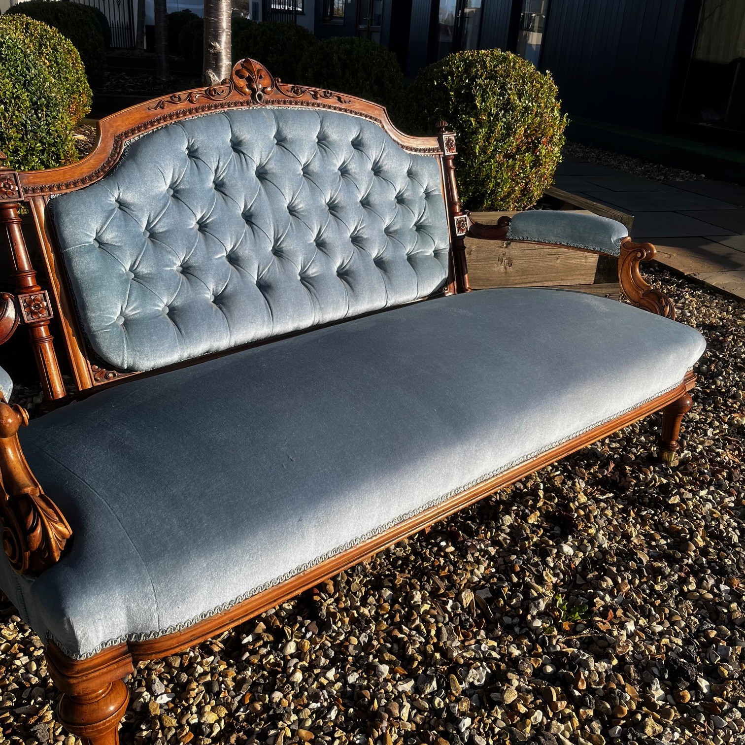 A Victorian Period Walnut Sofa. The show frame with finely carved floral detail. Having open swept arms and raised on turned and reeded walnut supports with brass castors. Having a deep buttoned back and sprung seat, upholstered in a pale blue velvet. English circa 1870-1880, in excellent condition, the fabric in perfect condition.