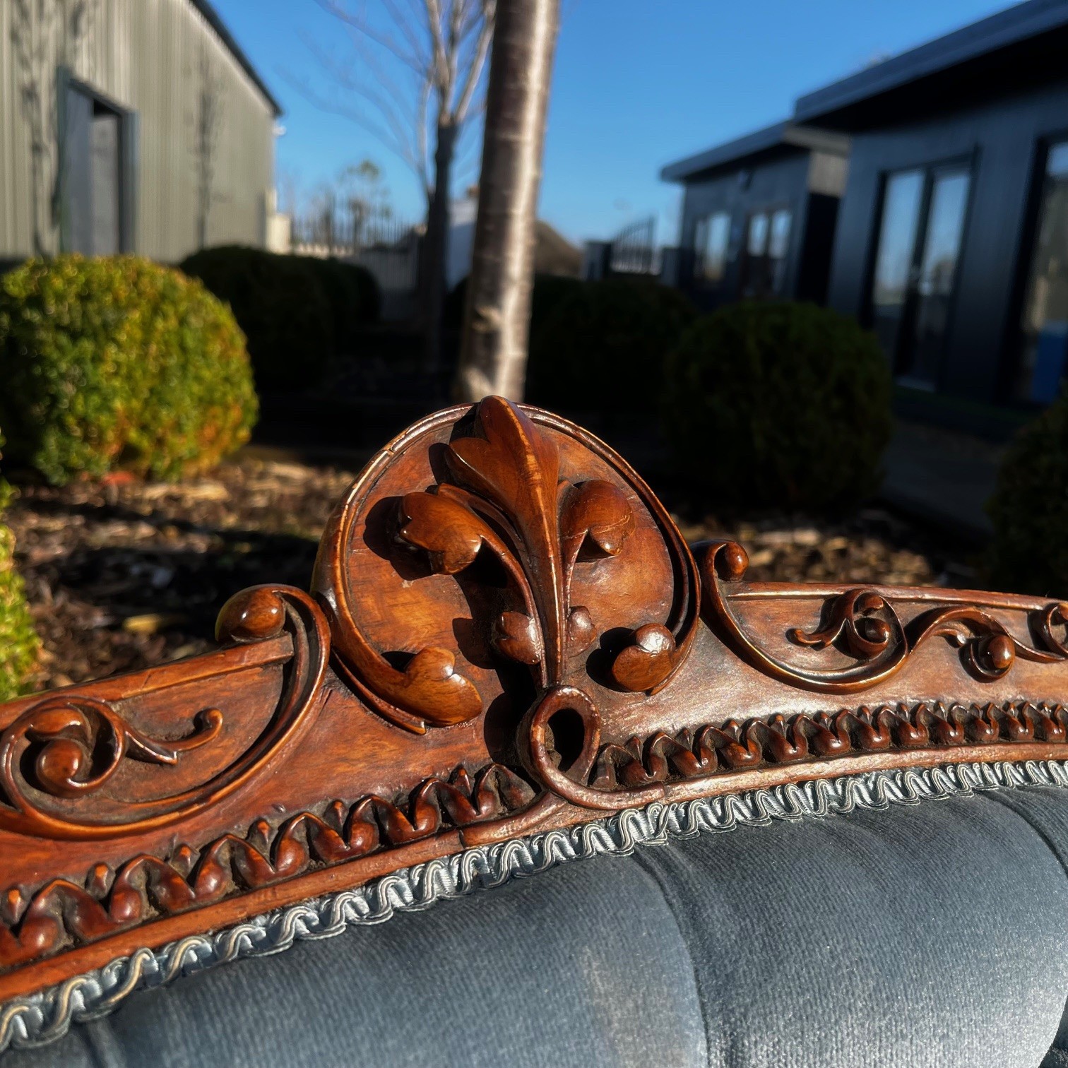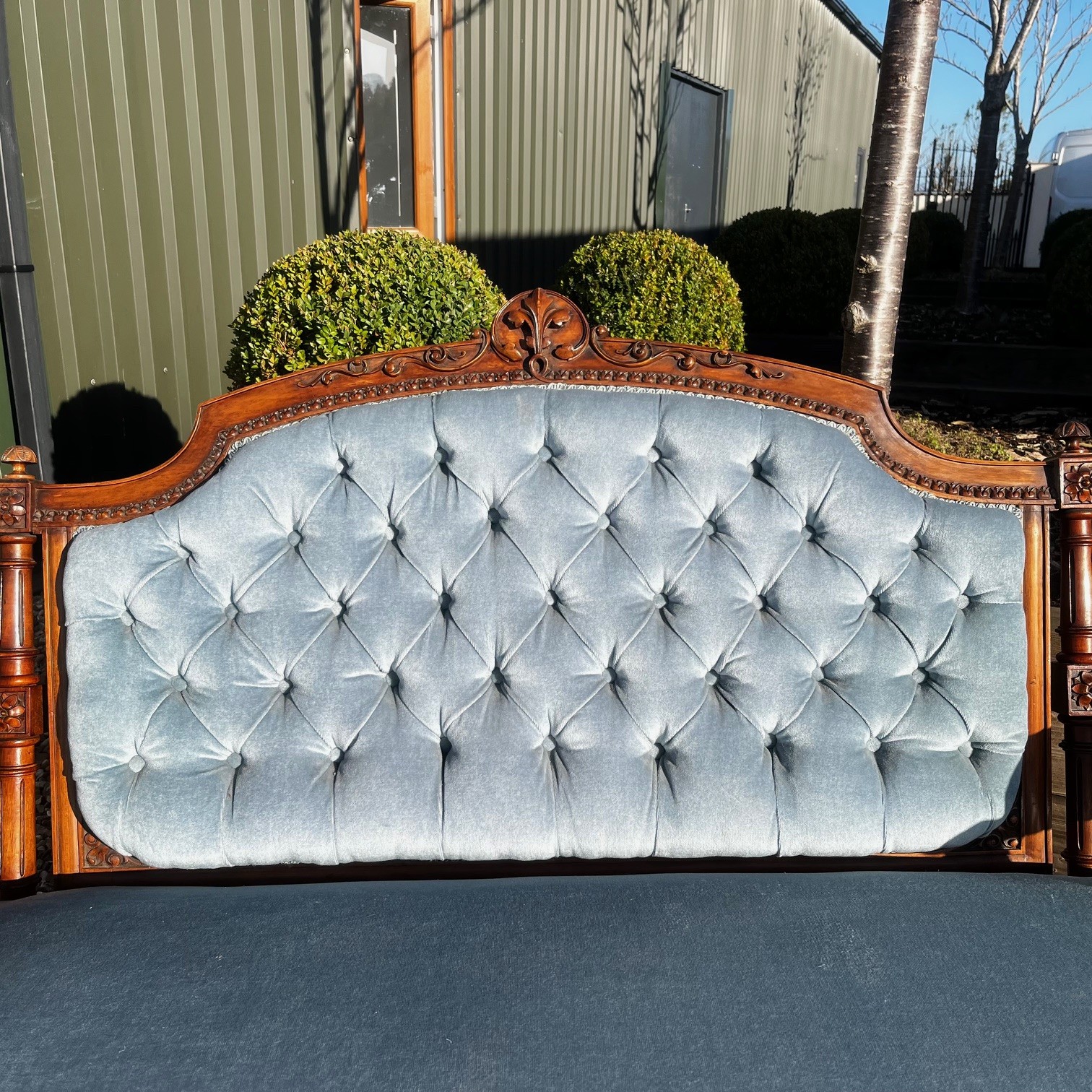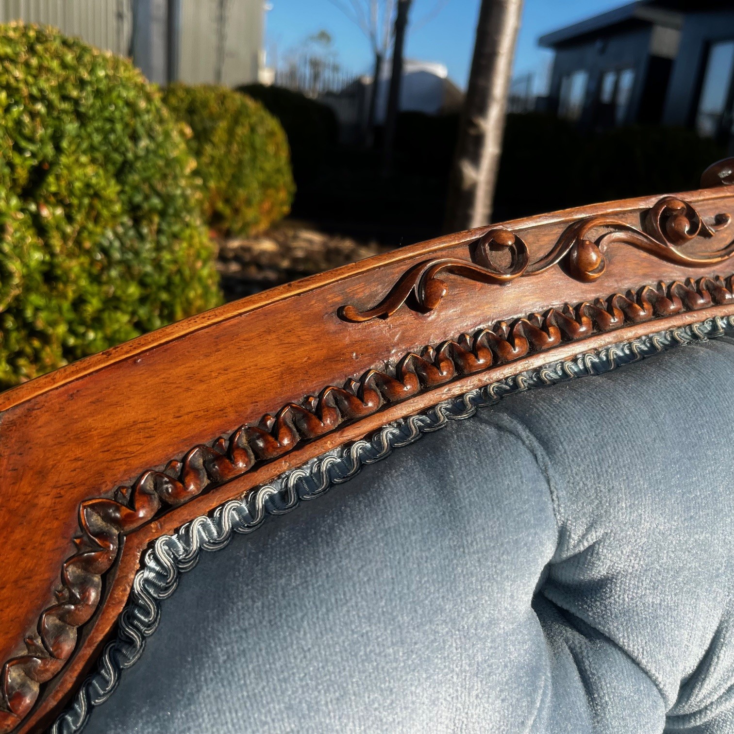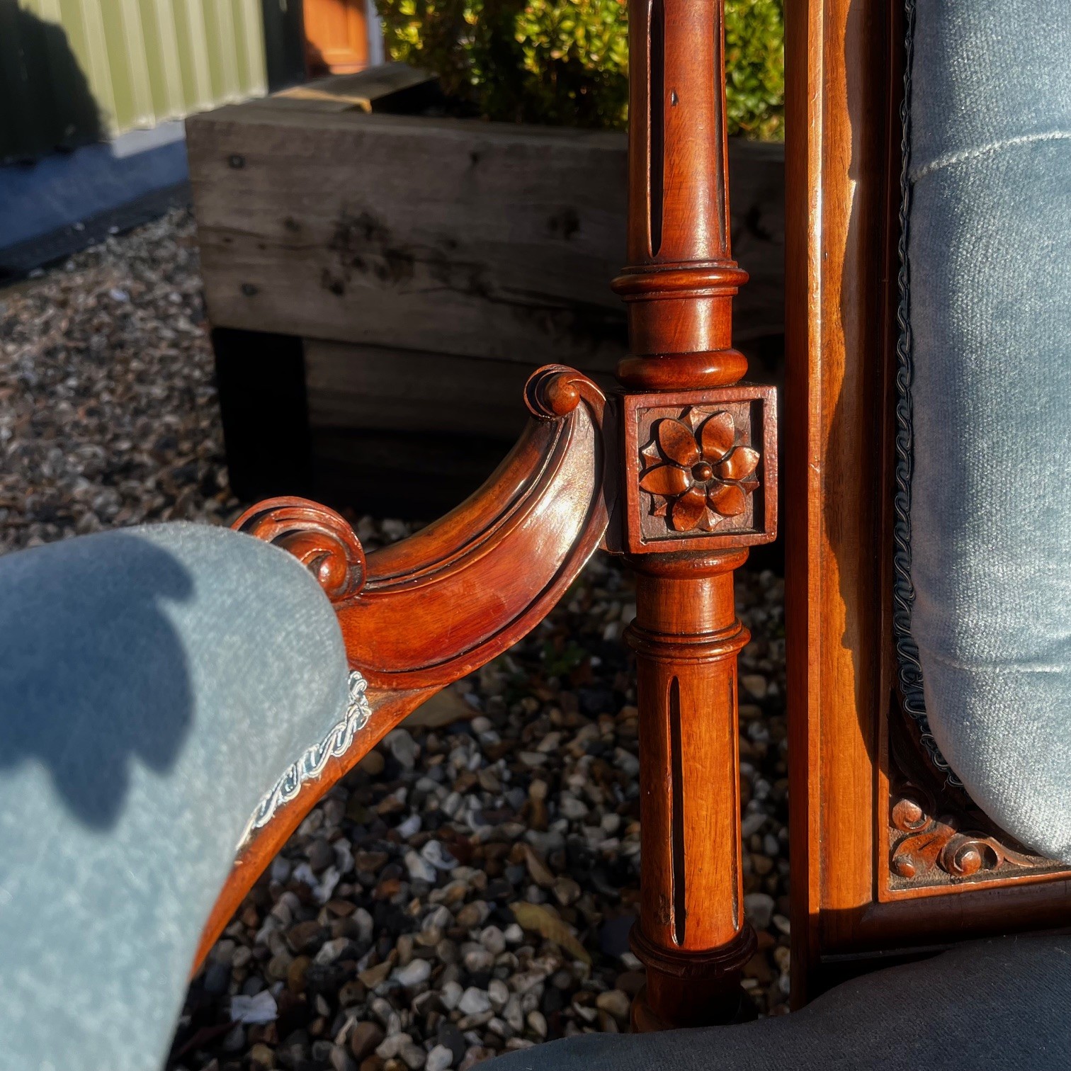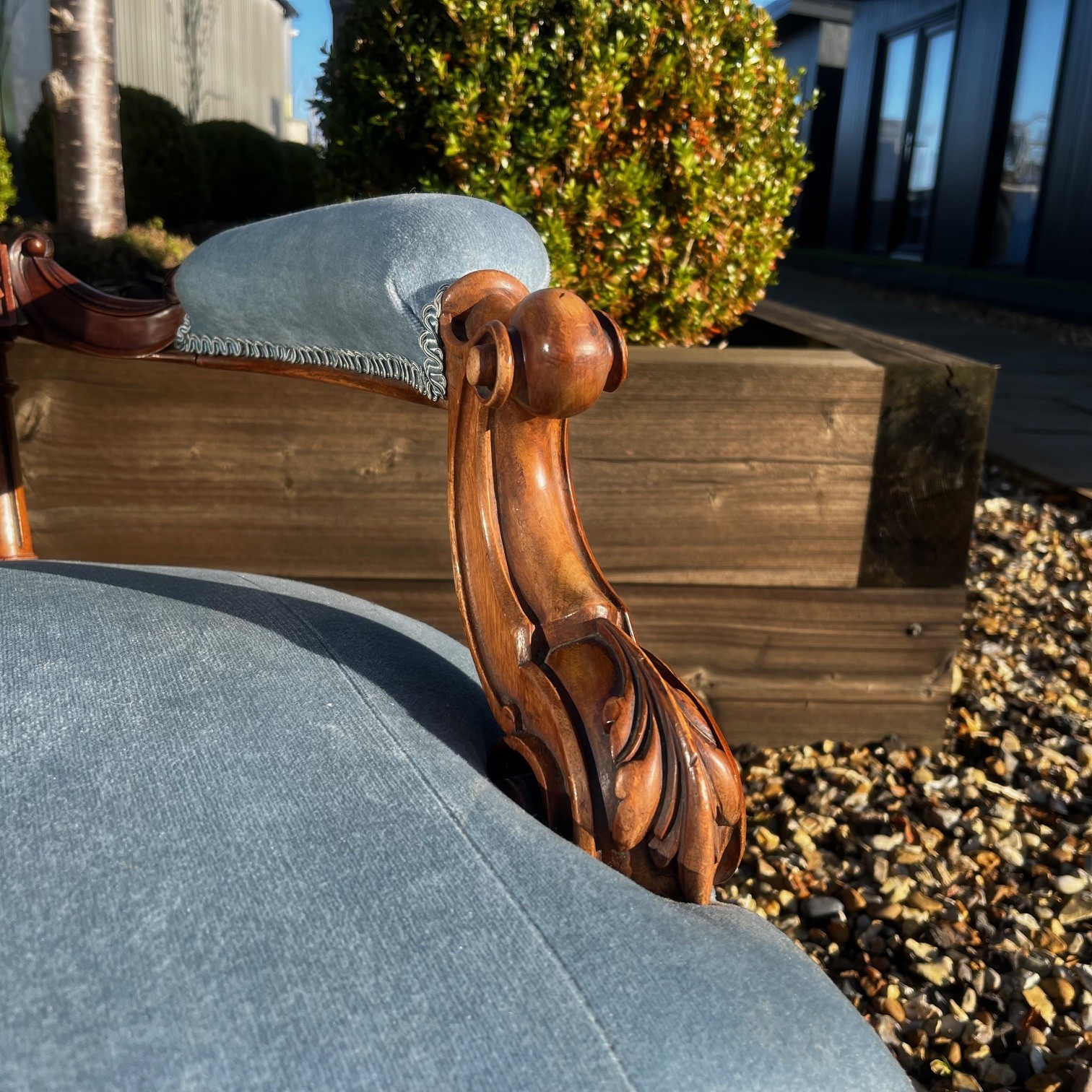 A Victorian Period Walnut Sofa. The show frame with finely carved floral detail. Having open swept arms and raised on turned and reeded walnut supports with brass castors. Having a deep buttoned back and sprung seat, upholstered in a pale blue velvet. English circa 1870-1880, in excellent condition, the fabric in perfect condition.