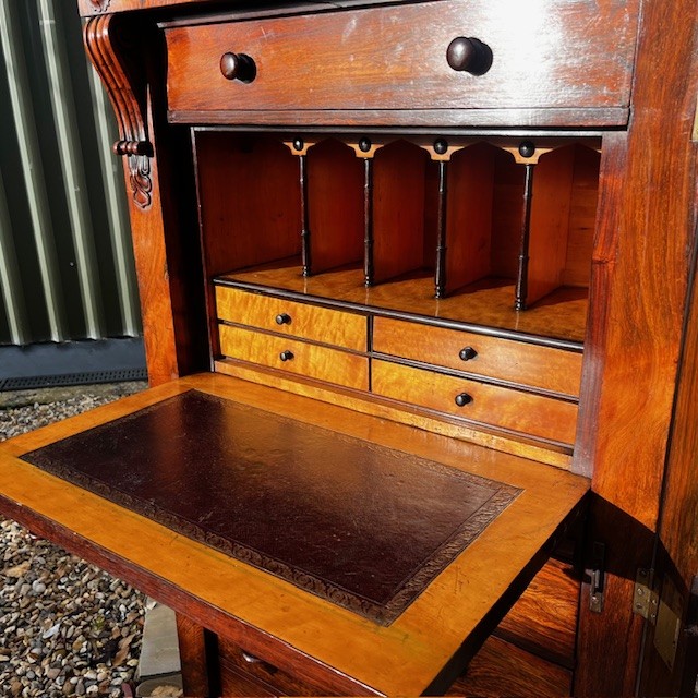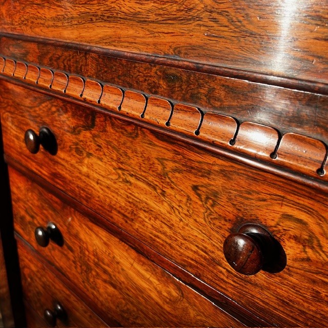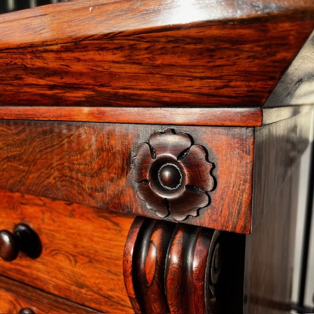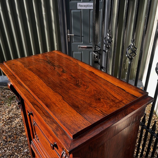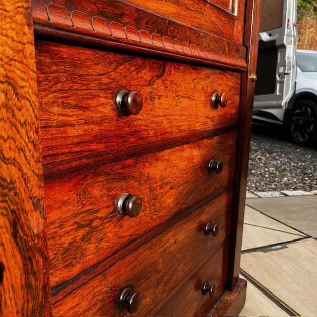 A William IV Period rosewood secrétaire wellington chest. Veneered throughout in beautifully figured rosewood and having an arrangement of five mahogany lined drawers with a central hinged secretaire section with a well fitted Birds Eye maple and ebony interior. Having fined carved corrals and floral appliqués. English circa 1830-1840