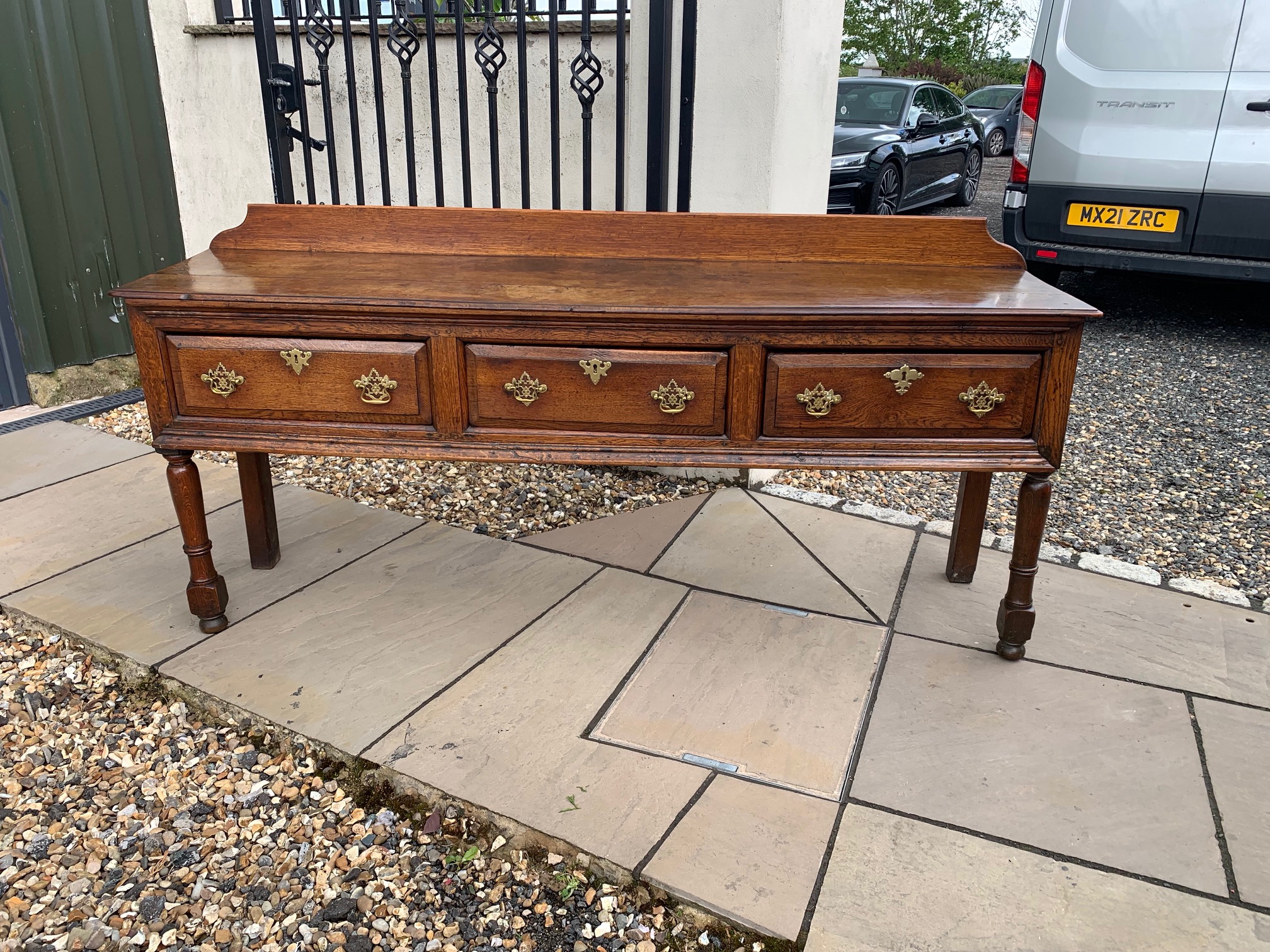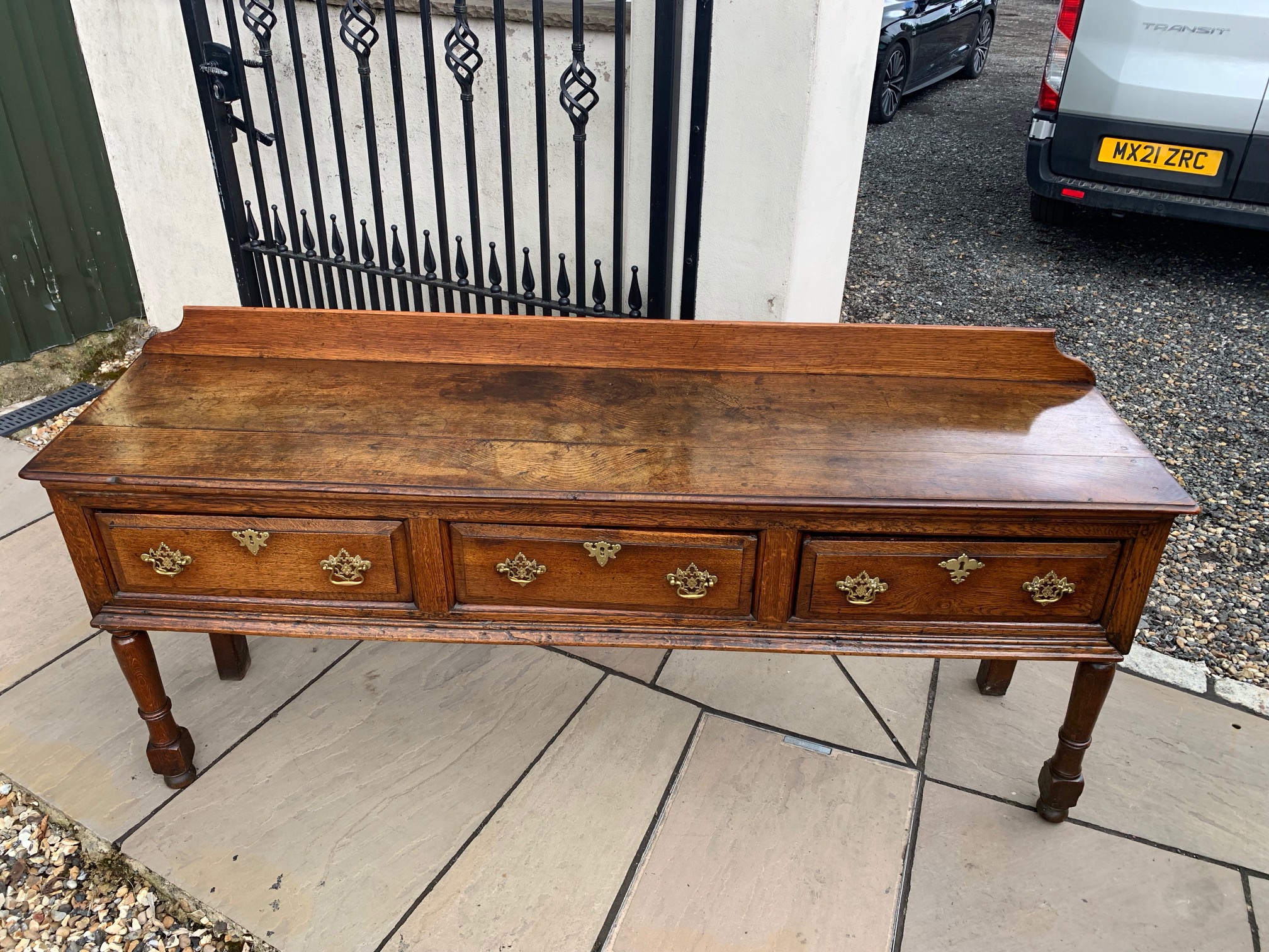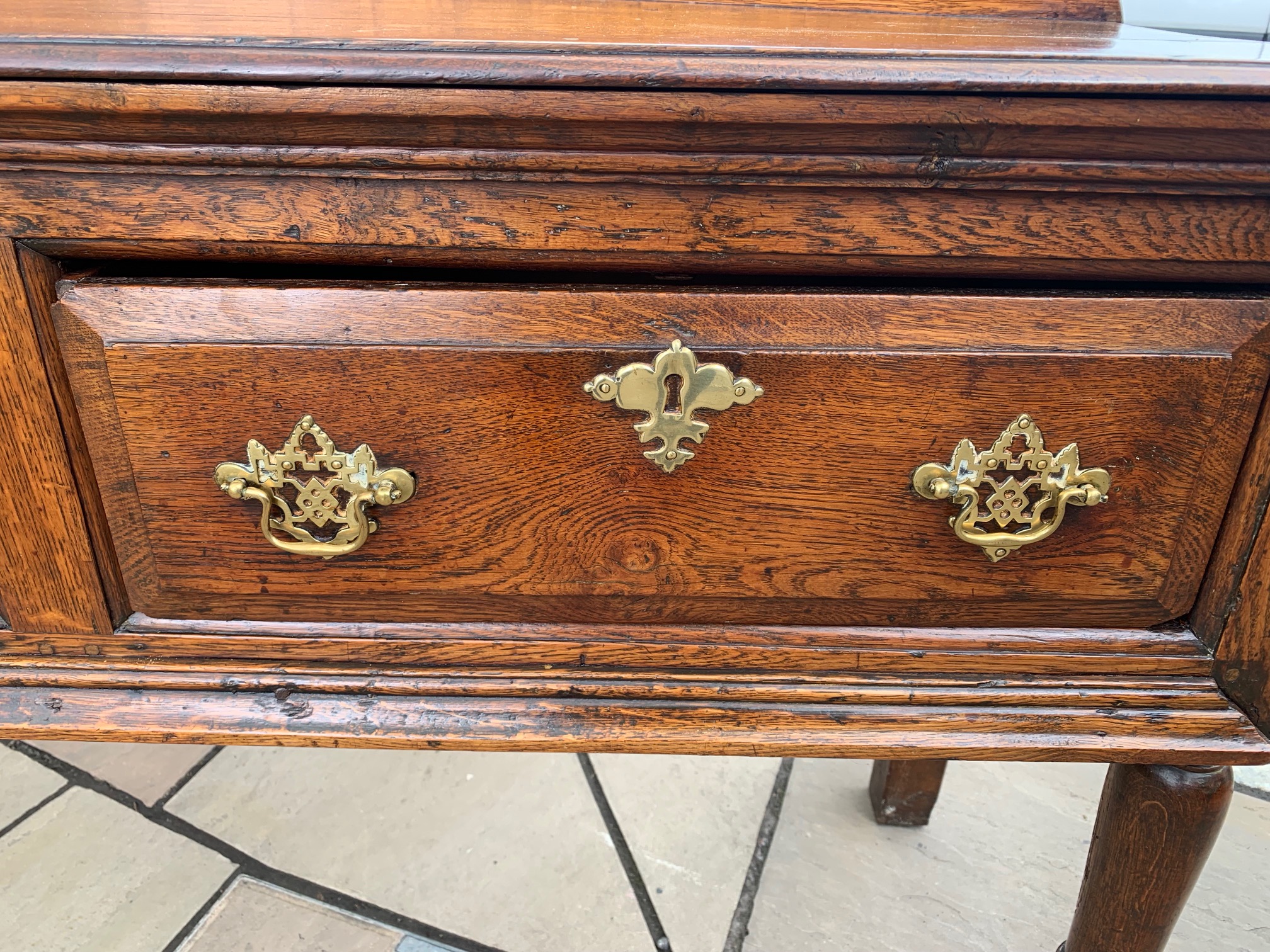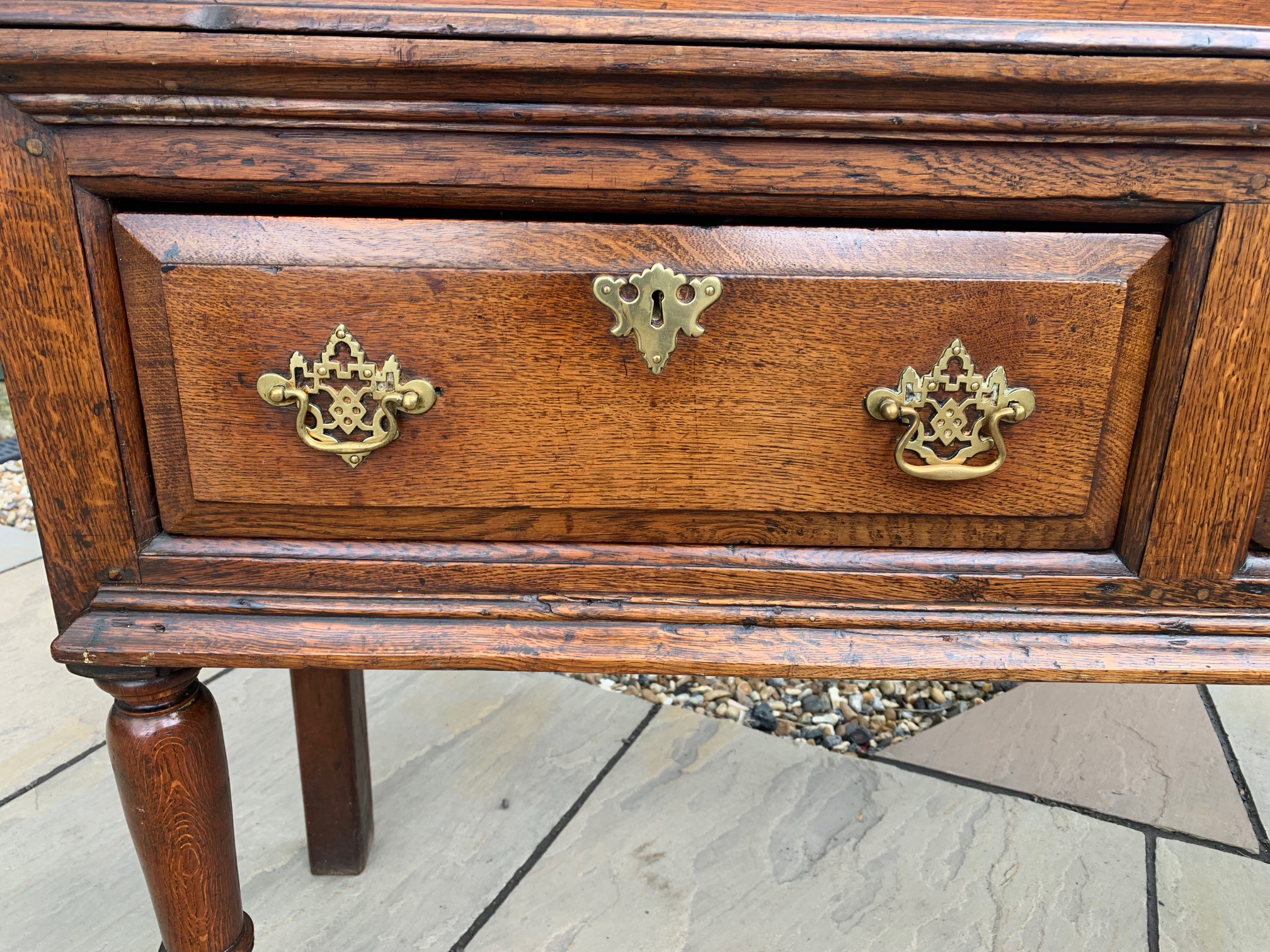 CompareAn 18th Century oak antique dresser base. Having a two plank top above three rectangular oak lined drawers with pierced brass back plate handles and raised on turned front supports with stile rear supports. The rear supports having old repairs. An excellent colour and patination. English circa 1780-1800