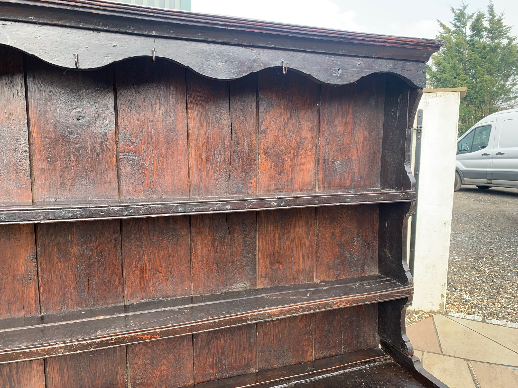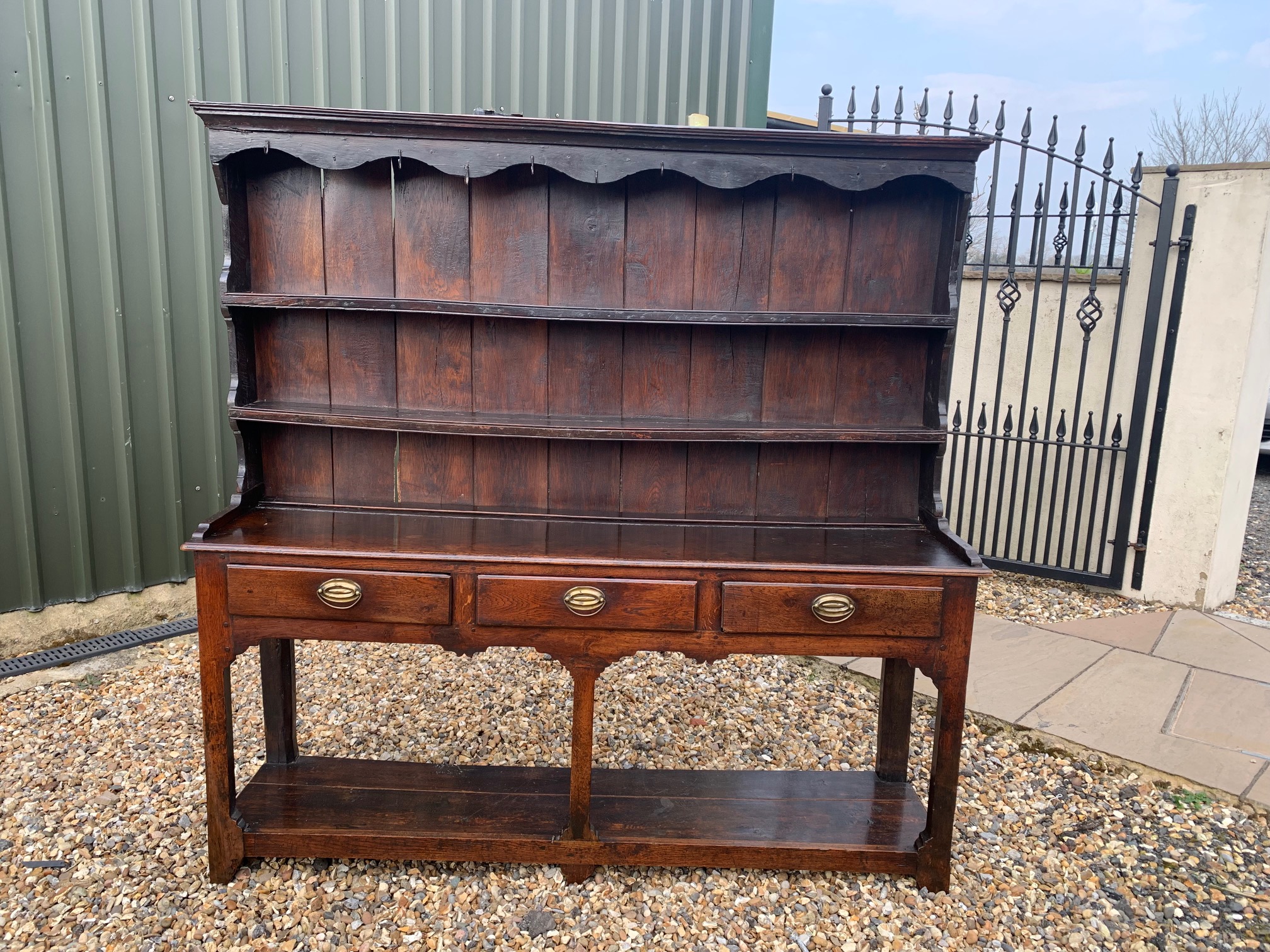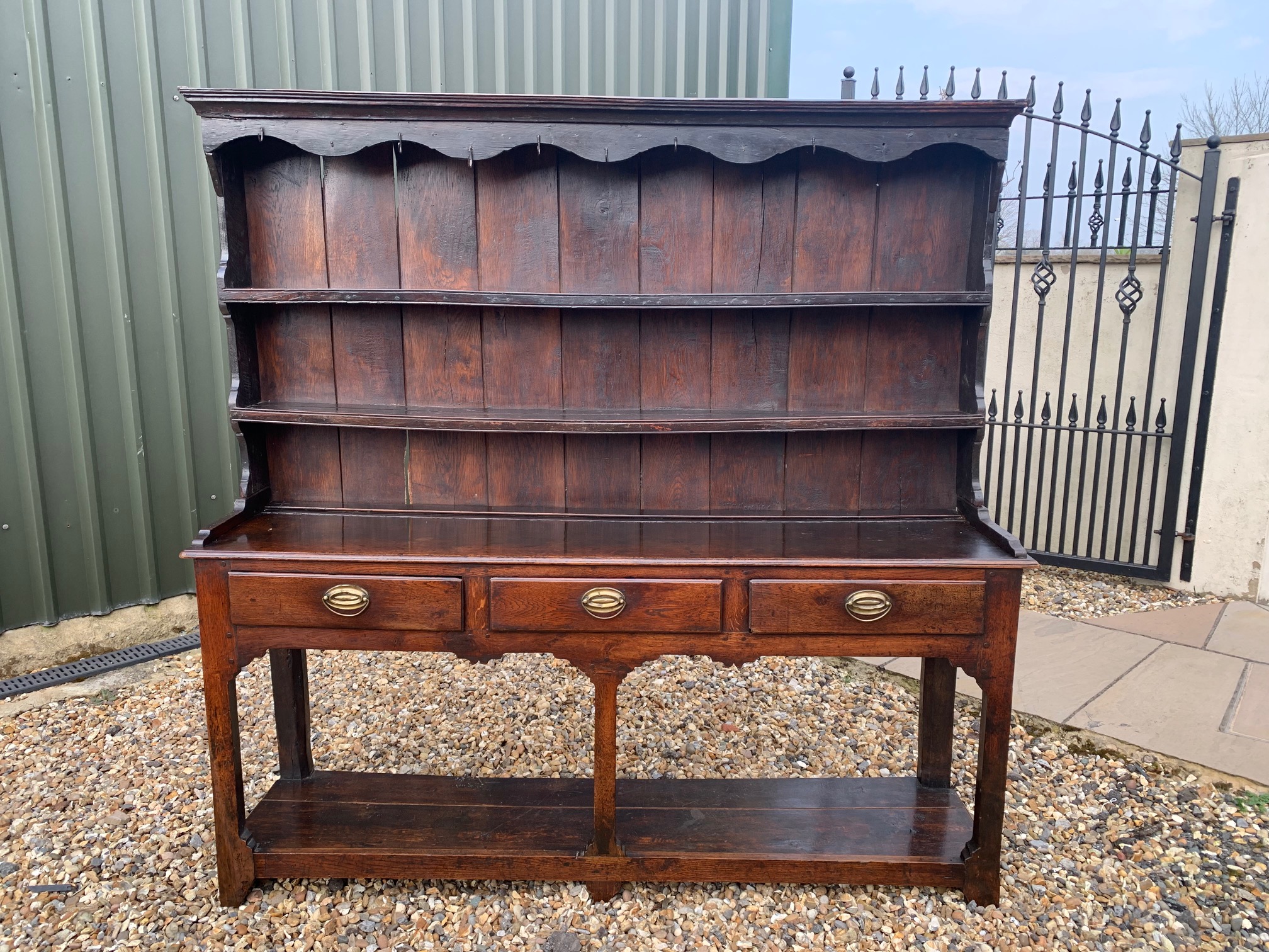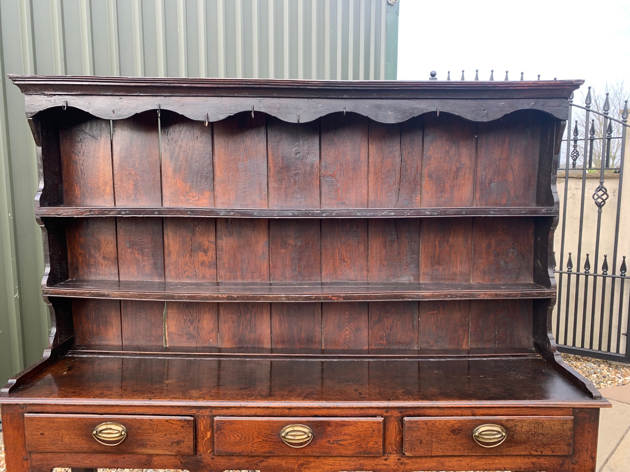 CompareAn 18th Century oak antique Welsh pot board dresser. The lower section having a two plank top above an arrangement of three rectangular drawers with oval brass handles, with a lovely shaped frieze and a central silhouette support showing pegged construction throughout. The upper rack section having three shelves and the whole raised on square supports and united by a pot board base. Welsh circa 1760-1780 of fabulous colour and patination throughout.