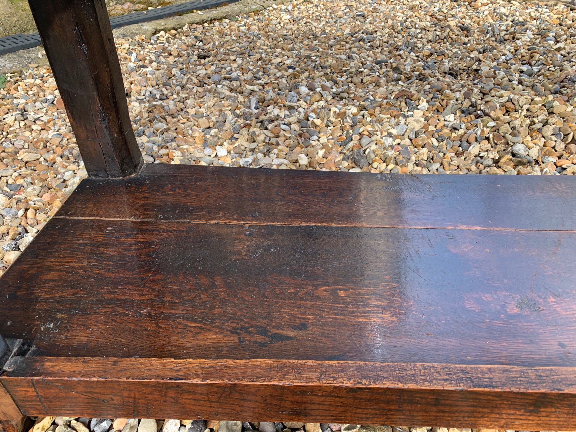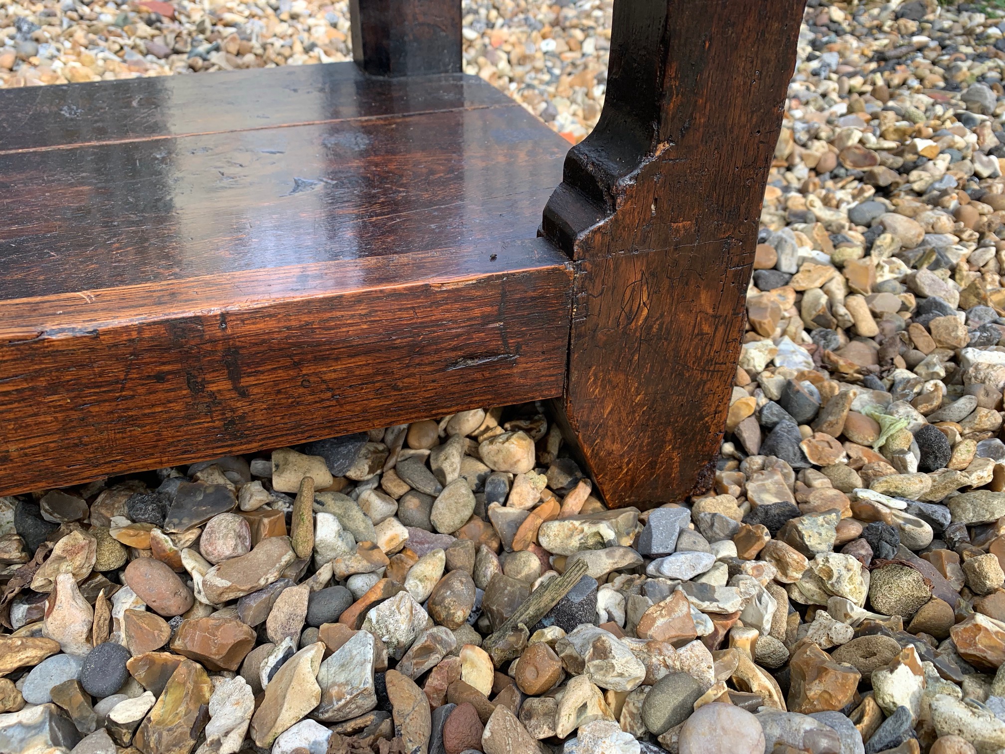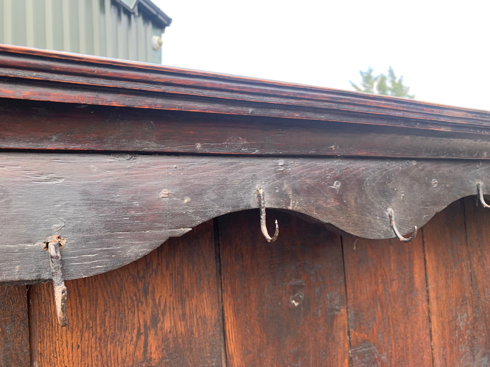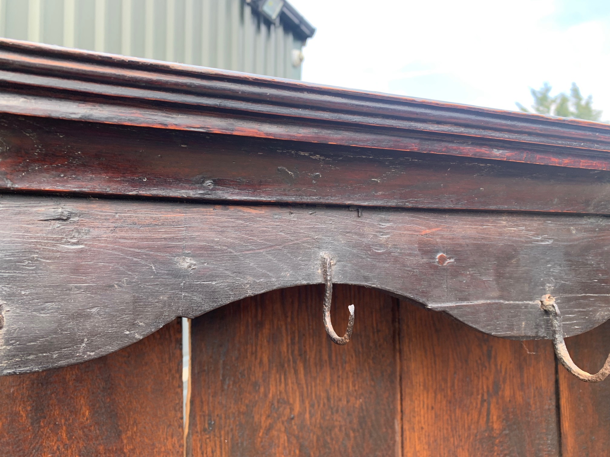 CompareAn 18th Century oak antique Welsh pot board dresser. The lower section having a two plank top above an arrangement of three rectangular drawers with oval brass handles, with a lovely shaped frieze and a central silhouette support showing pegged construction throughout. The upper rack section having three shelves and the whole raised on square supports and united by a pot board base. Welsh circa 1760-1780 of fabulous colour and patination throughout.