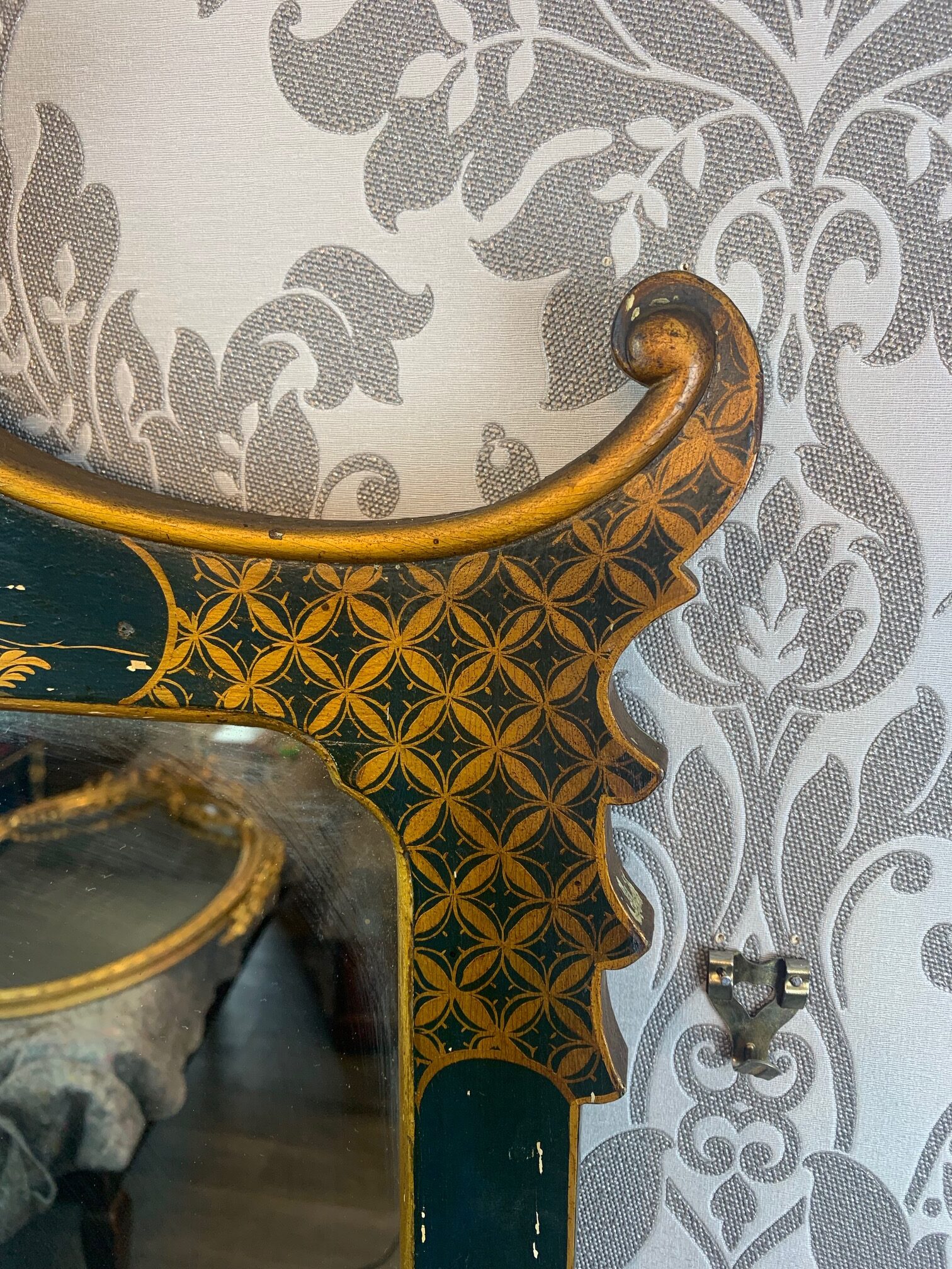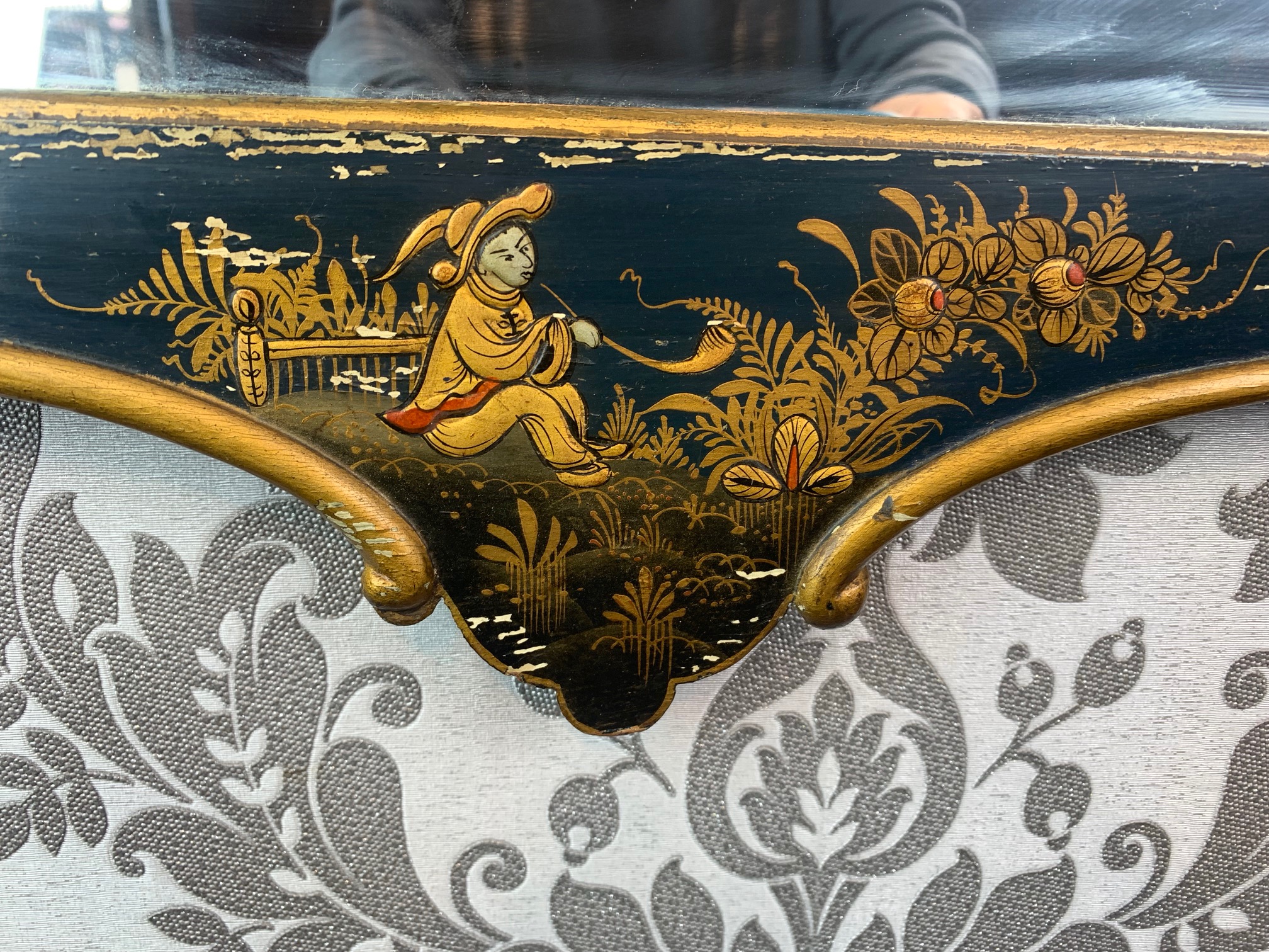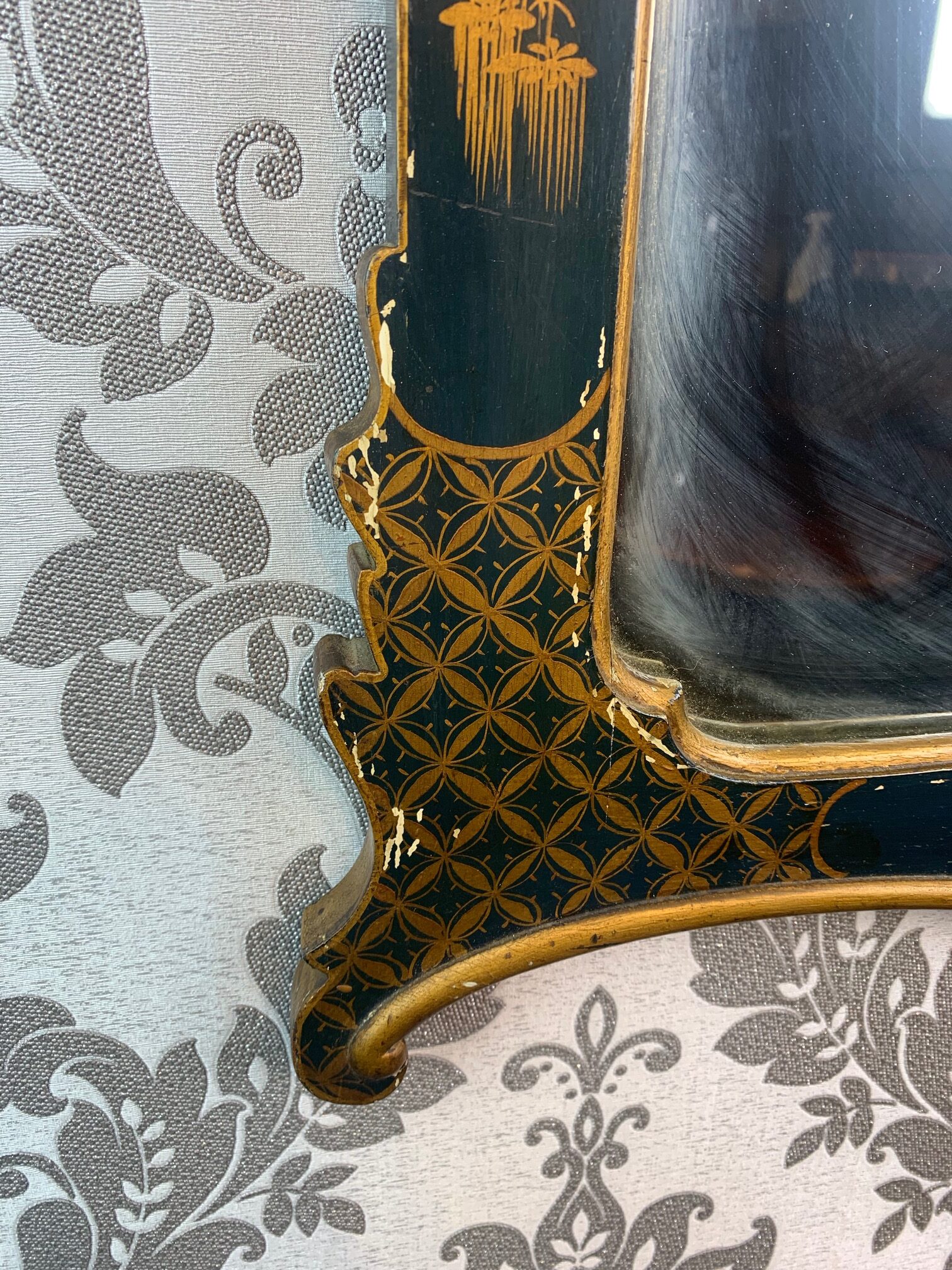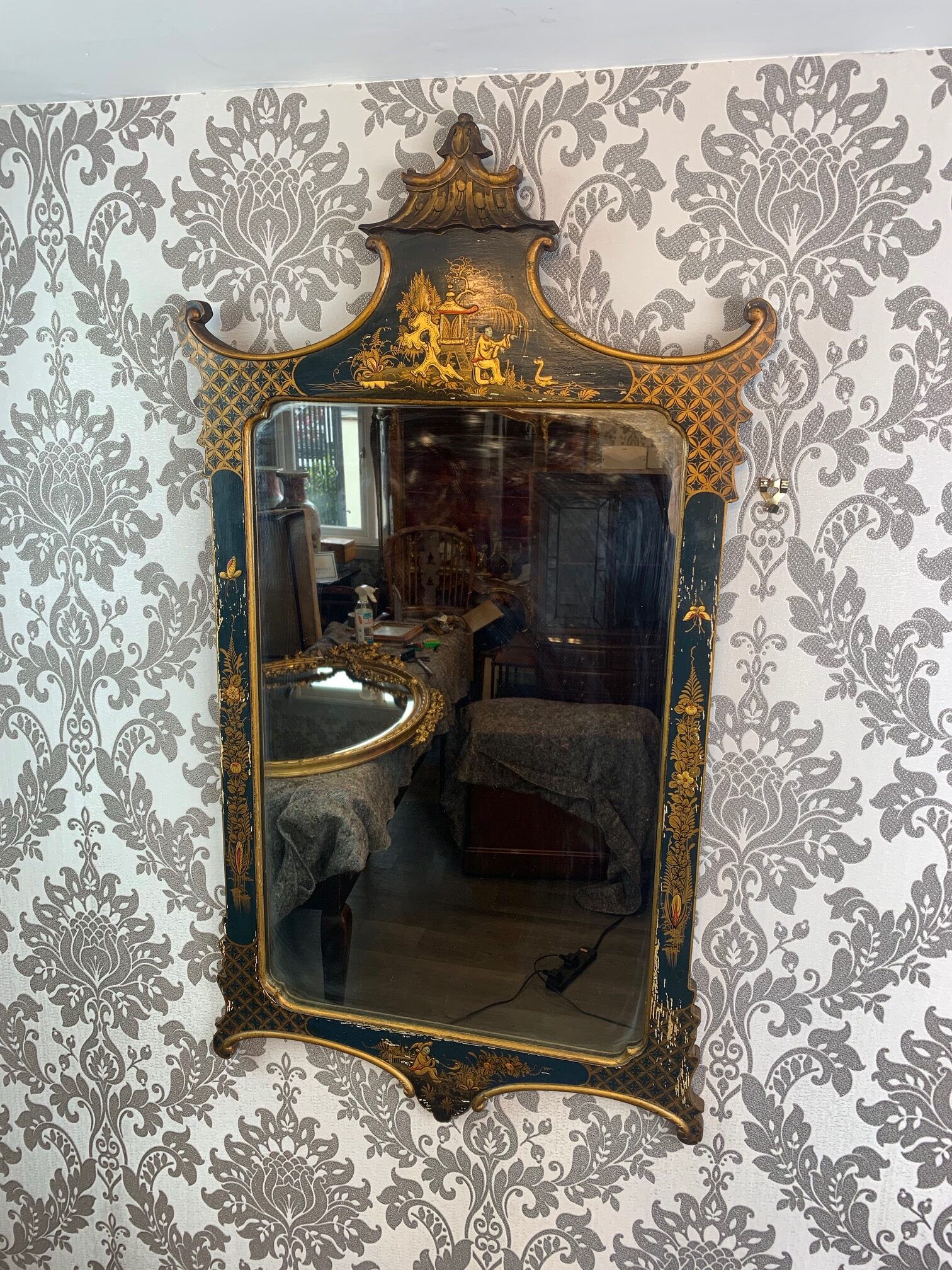 CompareAn 18th Century Style Chinoiserie wall mirror. The blue ground frame having a pagoda crest and chinoiserie detail, with further gilt decoration. Housing the original mirror plate. English circa 1900, in excellent original condition
