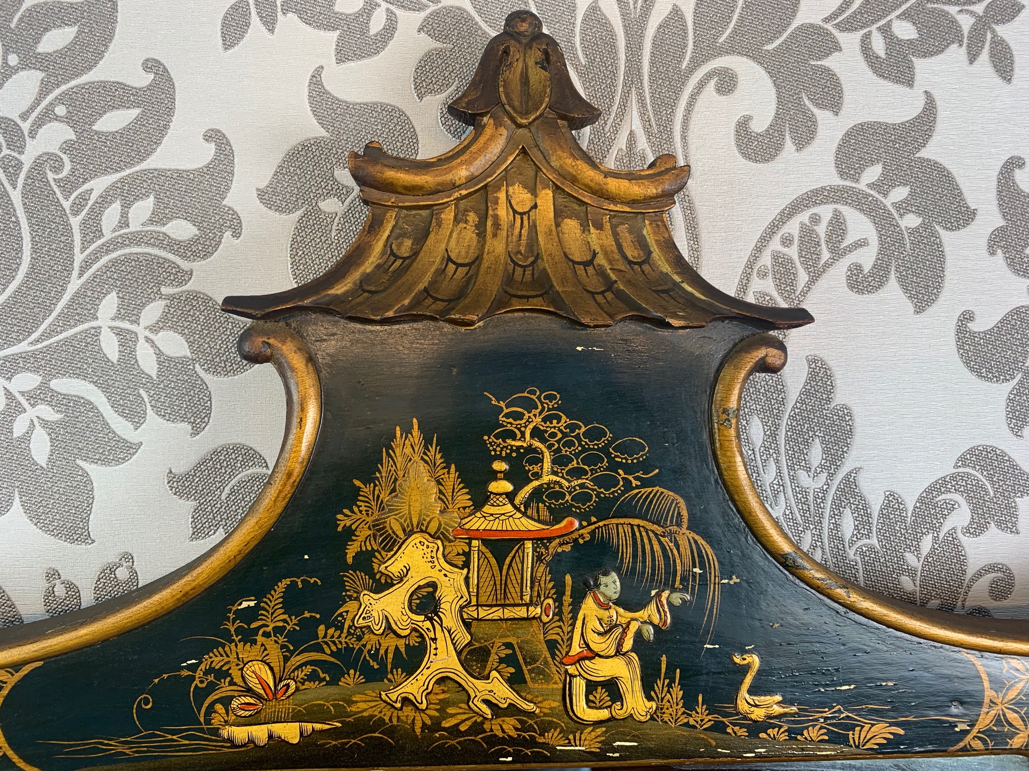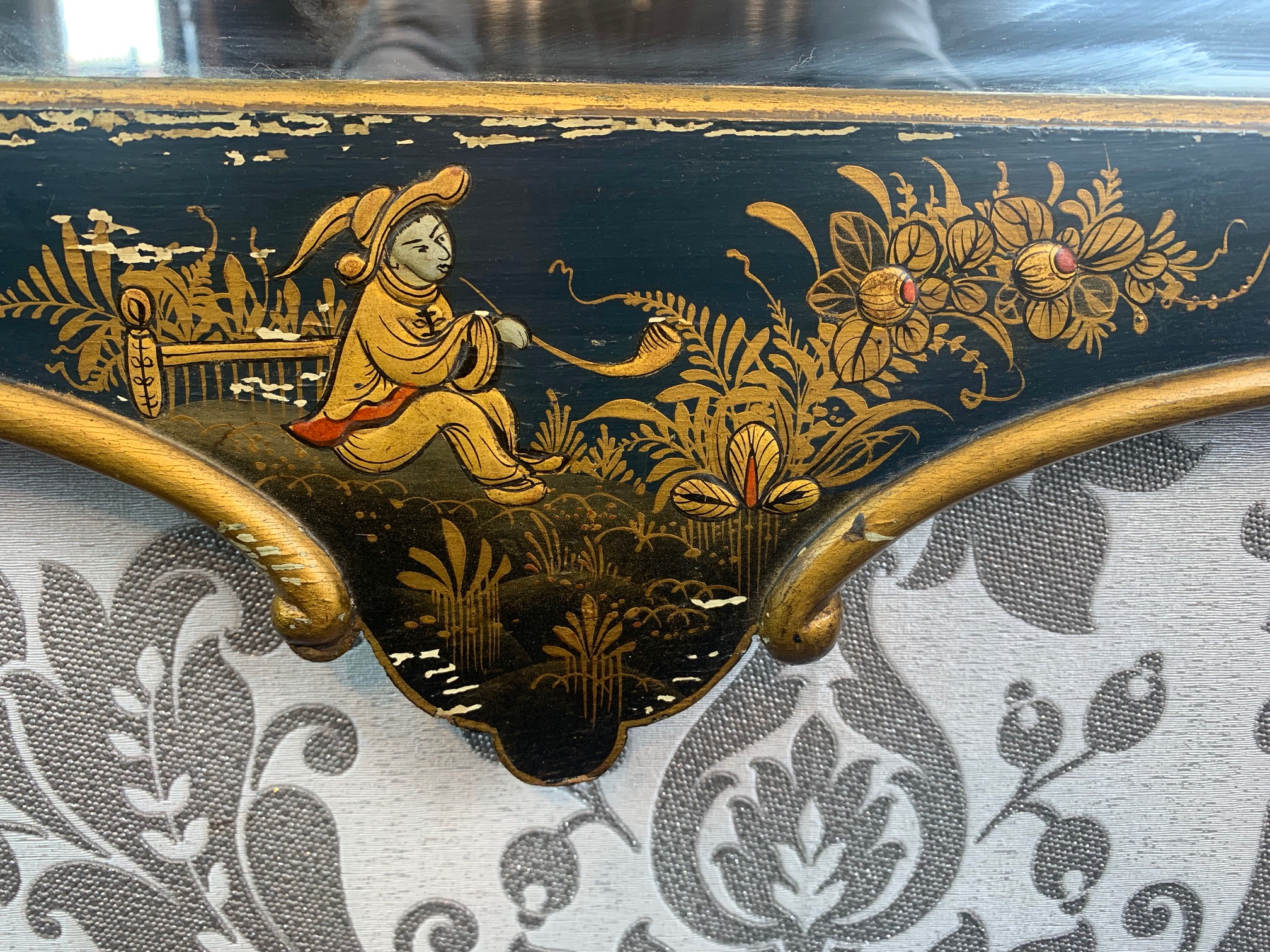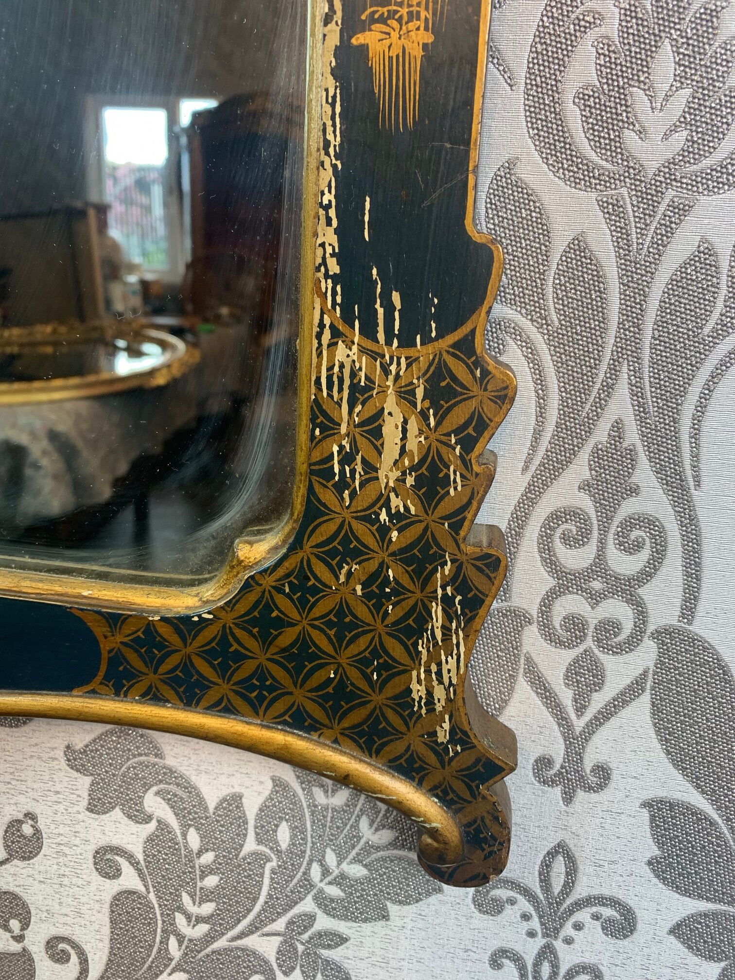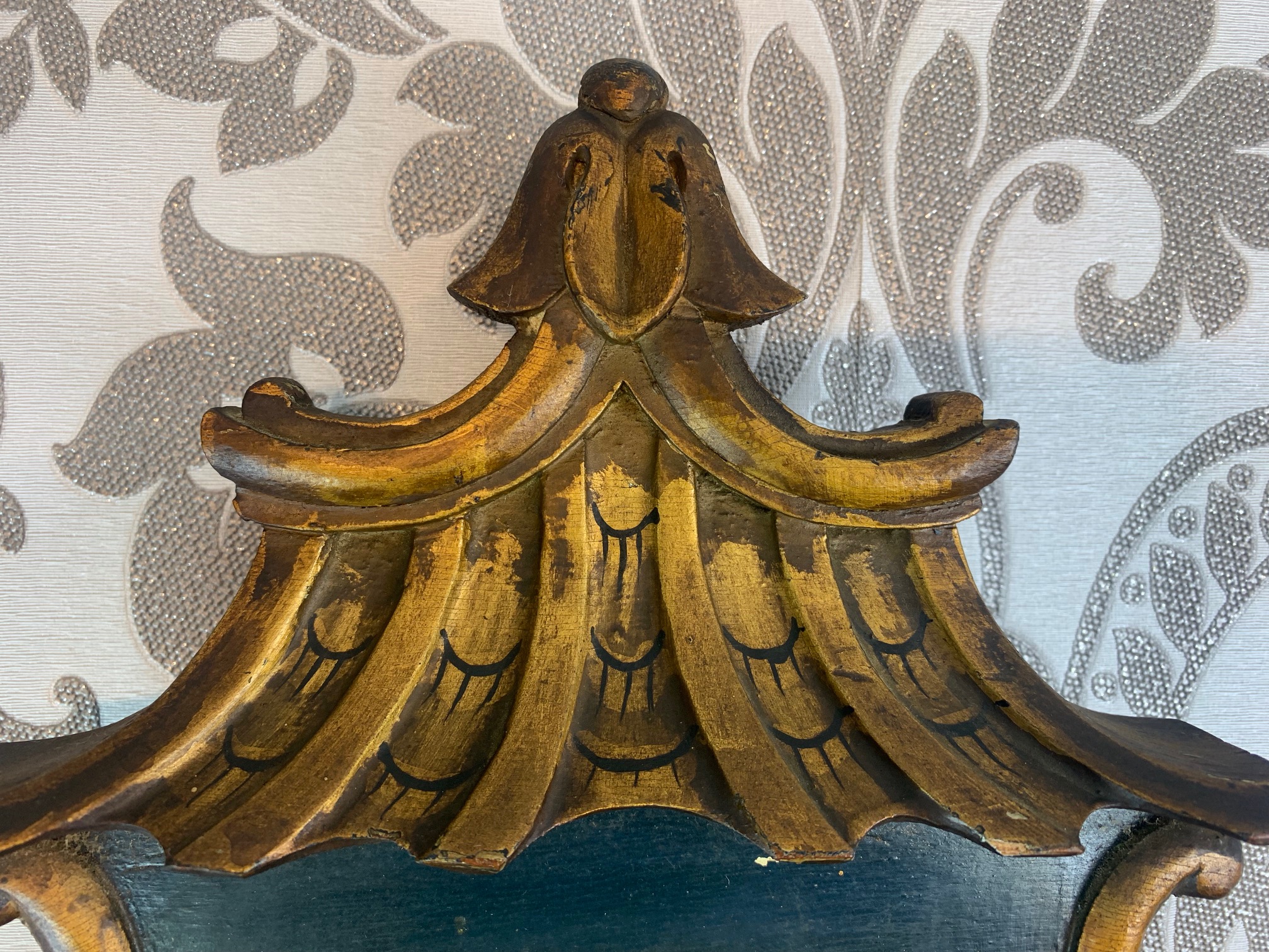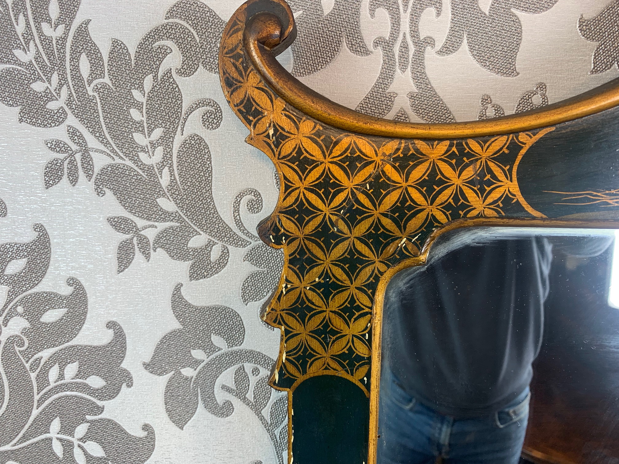 CompareAn 18th Century Style Chinoiserie wall mirror. The blue ground frame having a pagoda crest and chinoiserie detail, with further gilt decoration. Housing the original mirror plate. English circa 1900, in excellent original condition