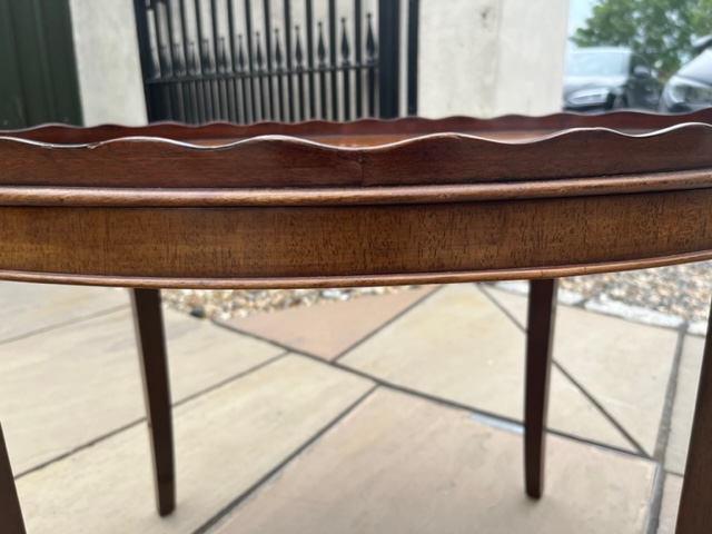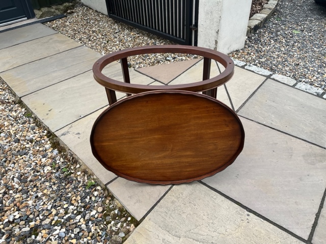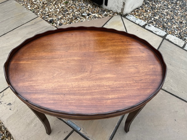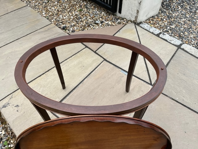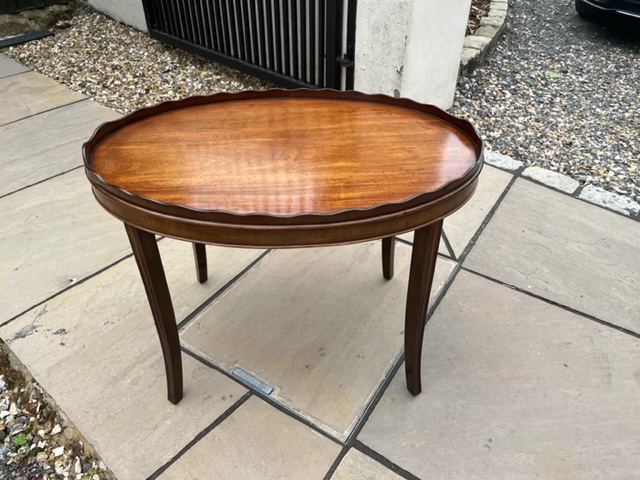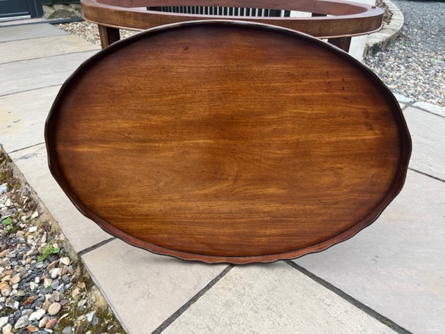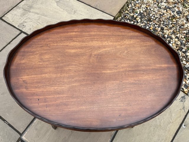 An Antique mahogany coffee table. The oval George III Period tray top with a pie crust edge, raised on a later oval stand with faceted shaped supports. English tray circa 1800, stand circa 1920-30