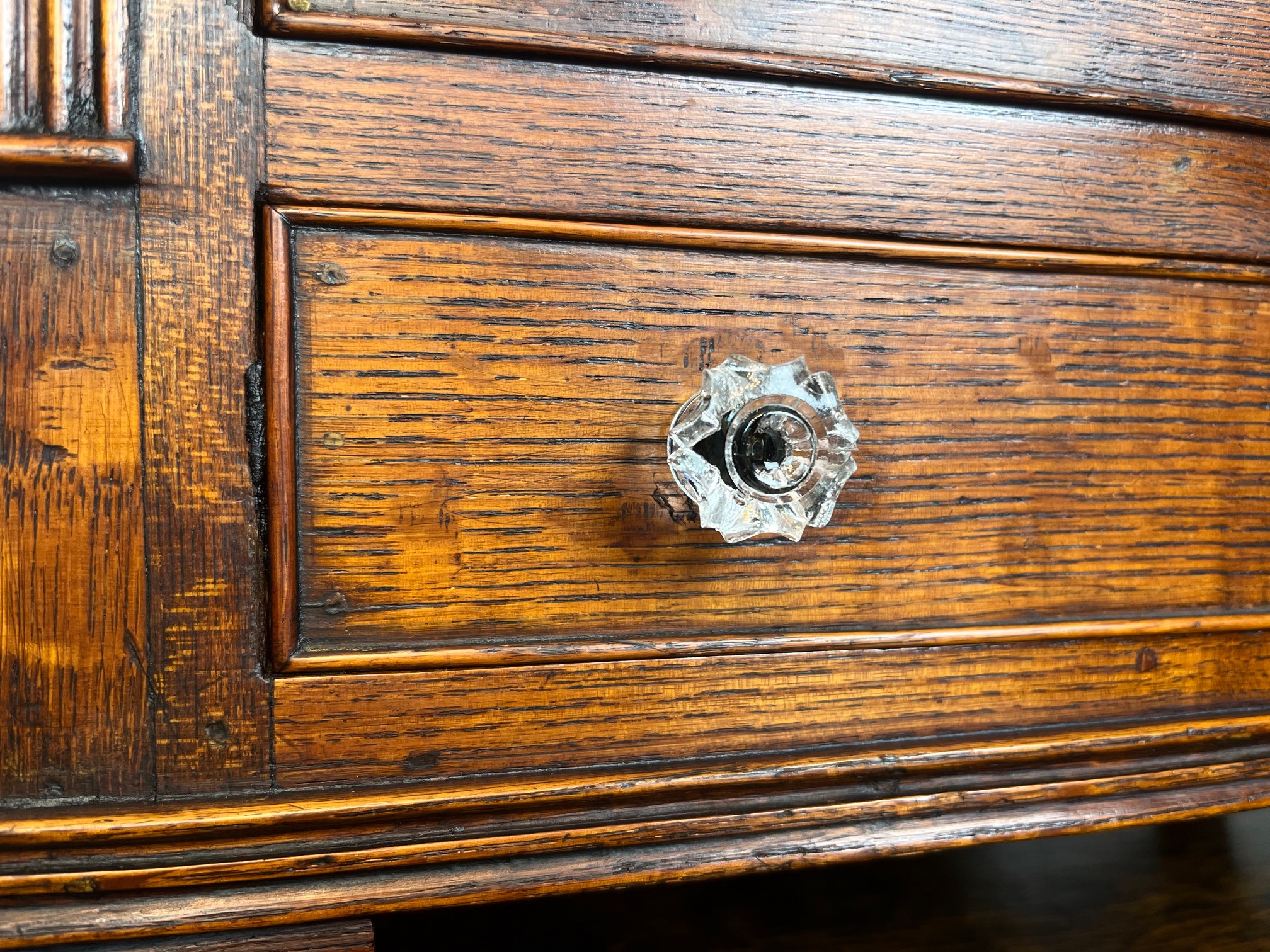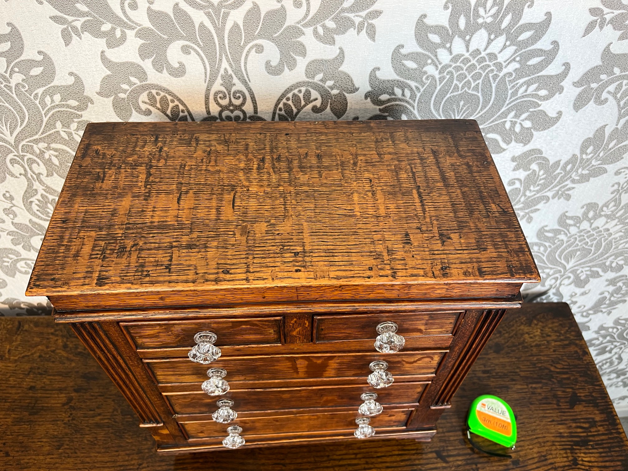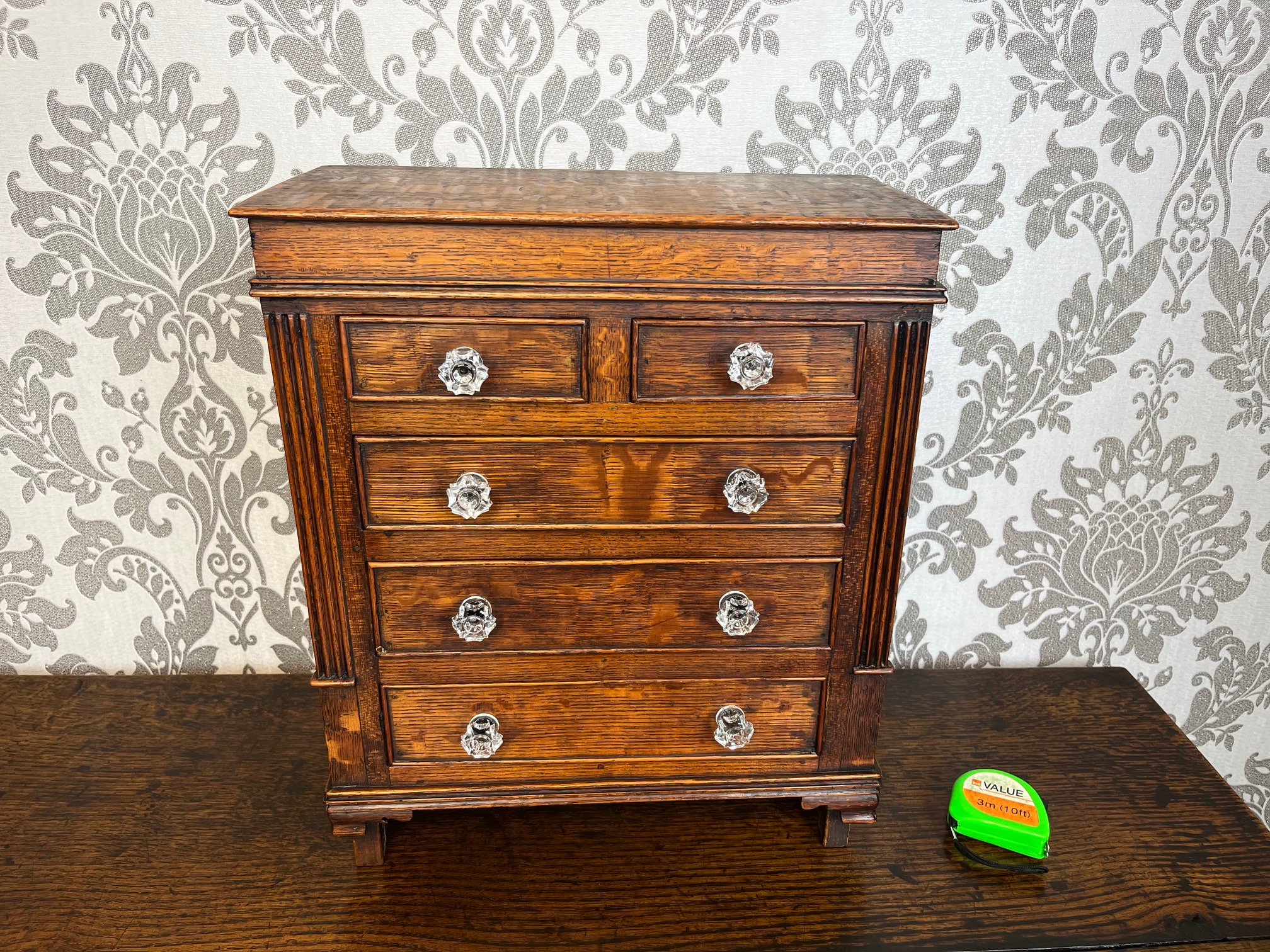 CompareAn early 19th Century oak miniature chest of drawers constructed in oak. Having a rectangular top above an arrangement of two short and three long drawers each retaining their original cut glass handles, with reeded pilasters and raised on ogee bracket feet with small stiles behind to raise and protect the feet. English circa 1800-1820 in superb original condition