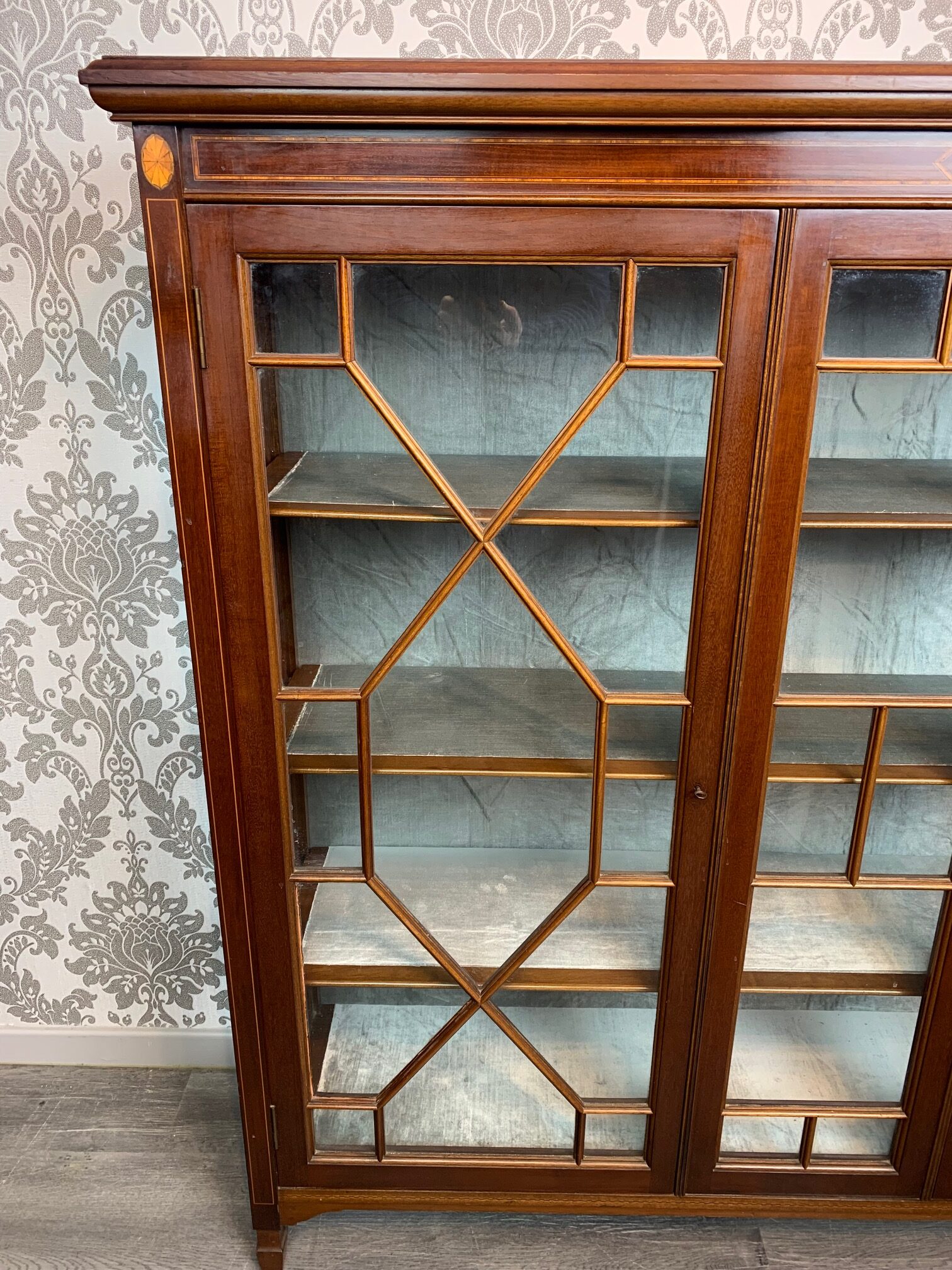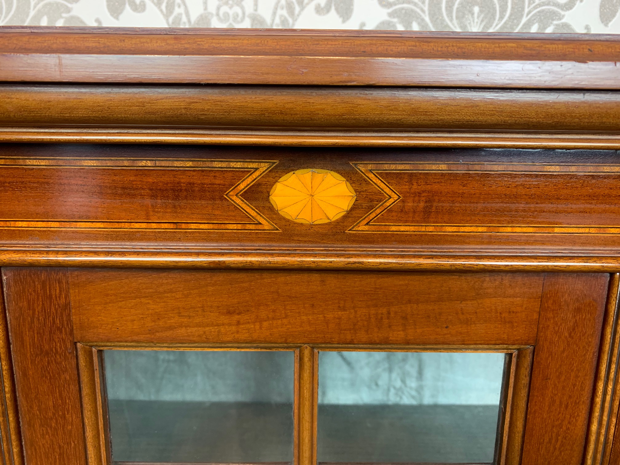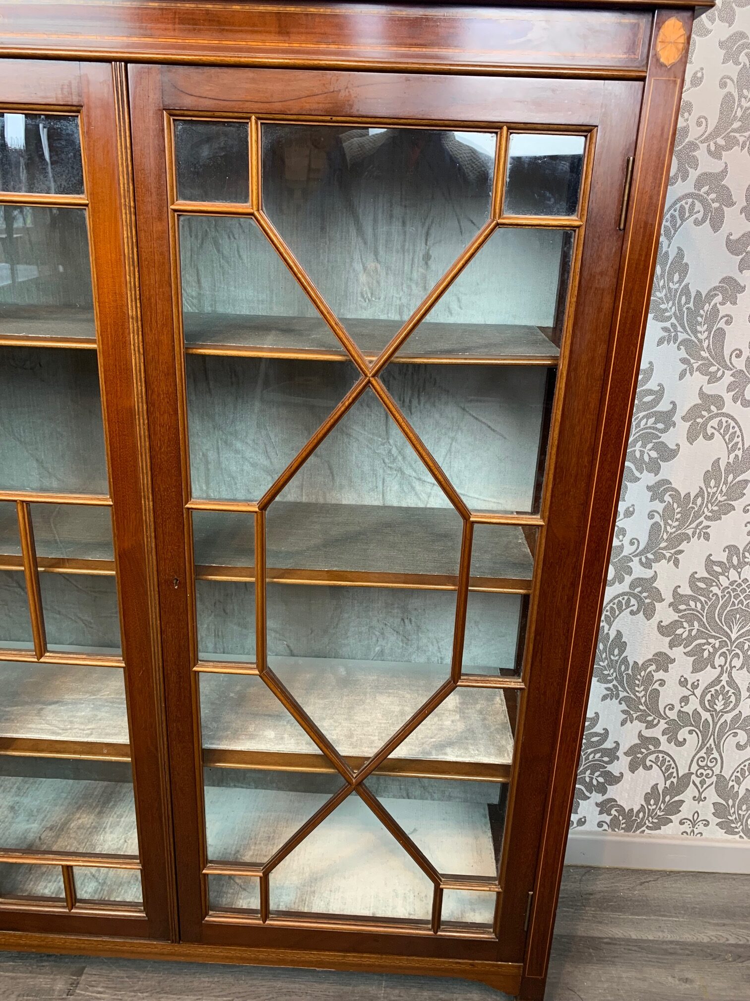 CompareAn Edwardian Period mahogany antique display cabinet, constructed in fine quality mahogany throughout with shell inlaid paterae, string inlay and astragal glazed doors. Having glazed sides and raised on spade feet. English circa 1900-1910, in superb condition, newly lined interior