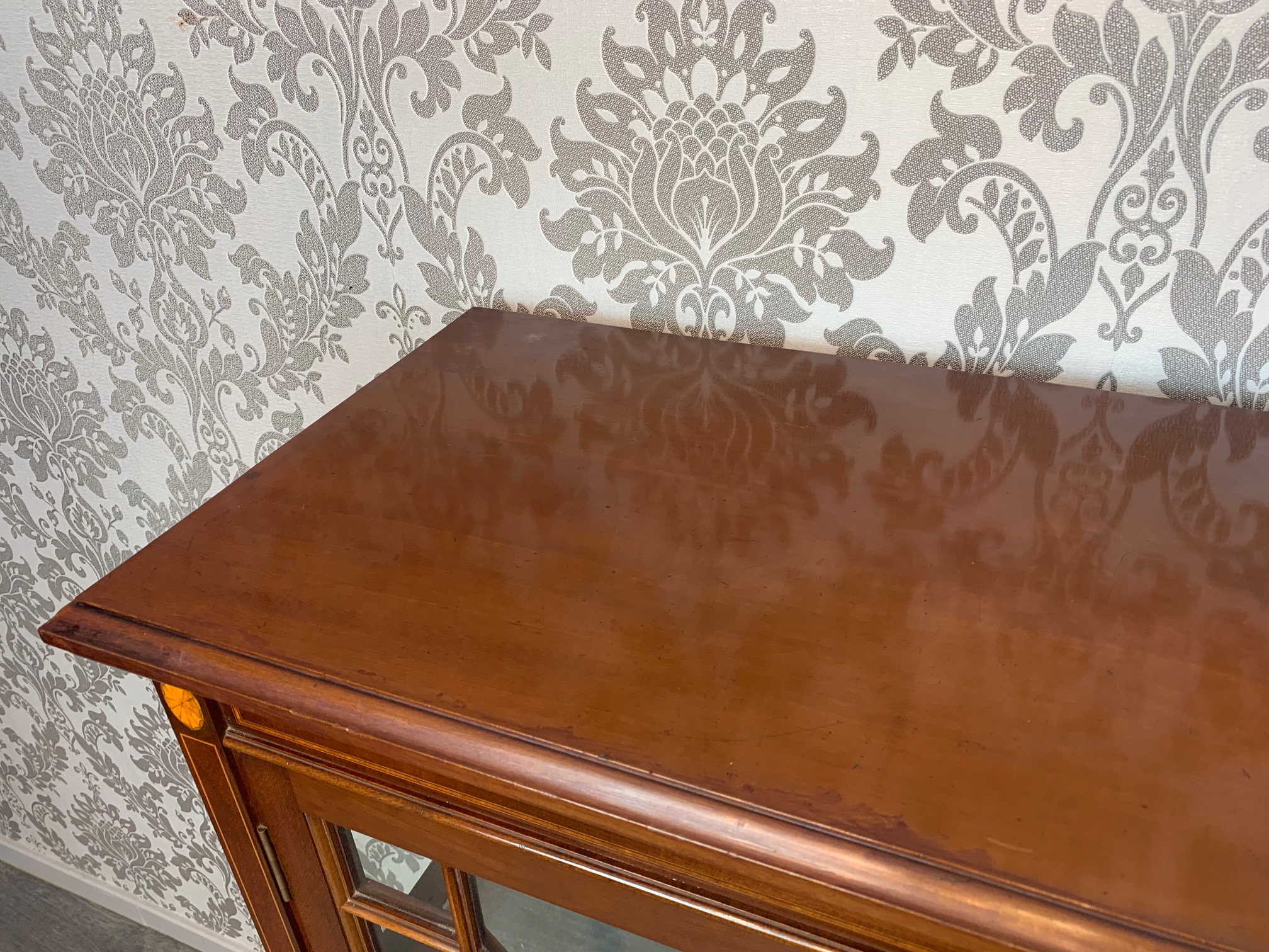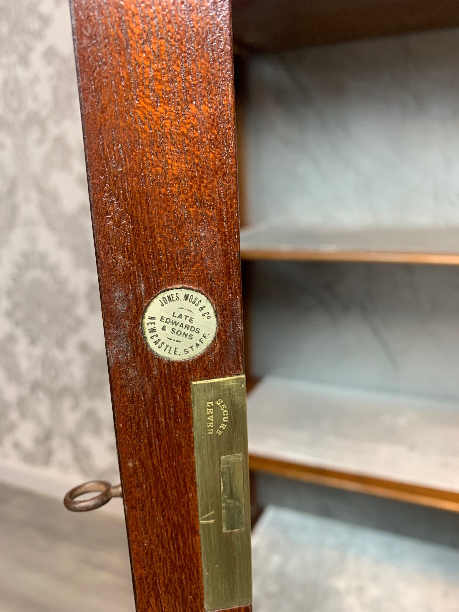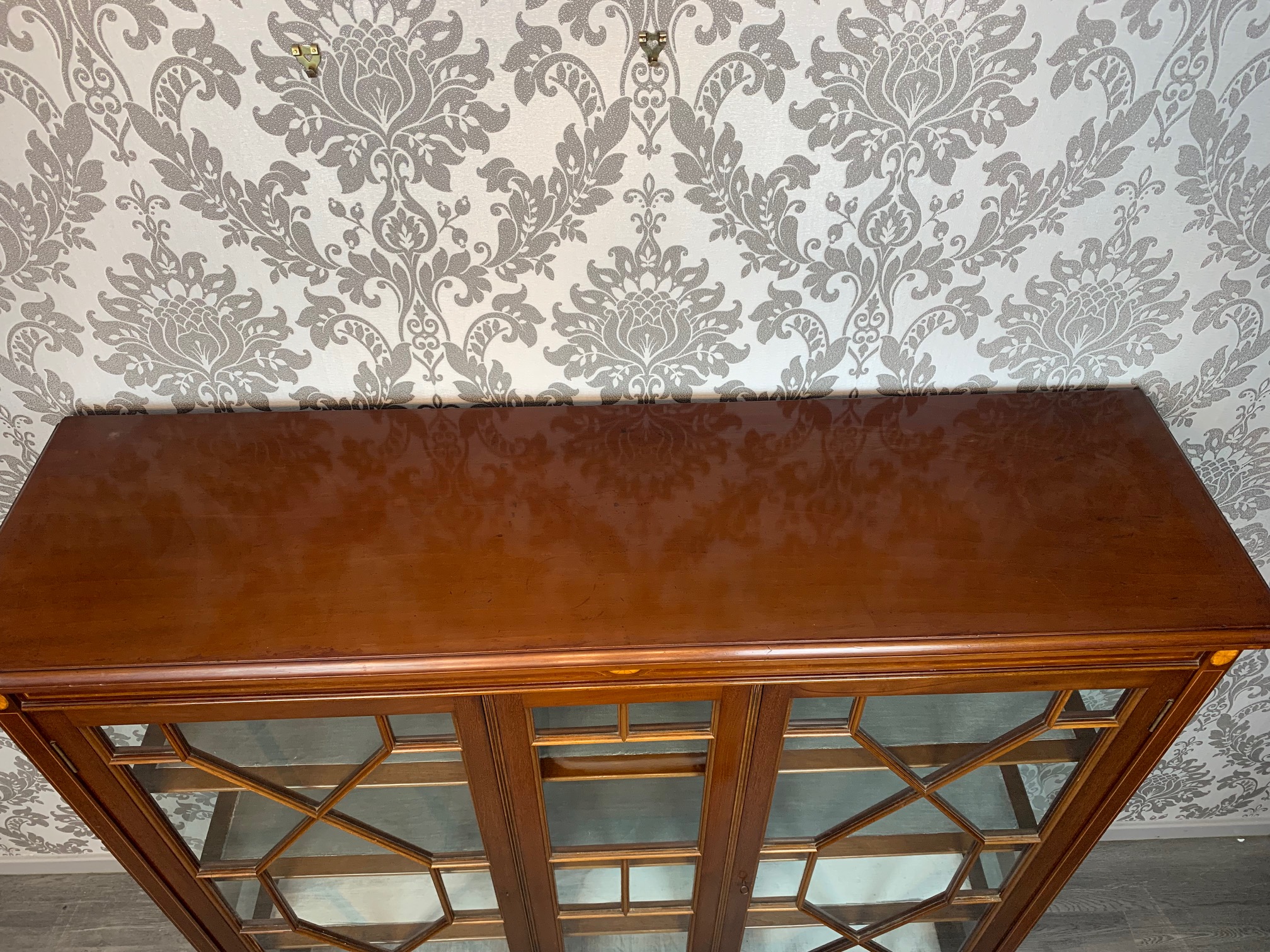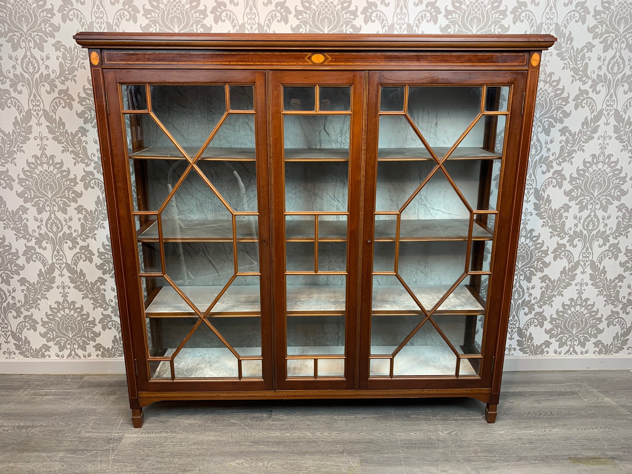 CompareAn Edwardian Period mahogany antique display cabinet, constructed in fine quality mahogany throughout with shell inlaid paterae, string inlay and astragal glazed doors. Having glazed sides and raised on spade feet. English circa 1900-1910, in superb condition, newly lined interior