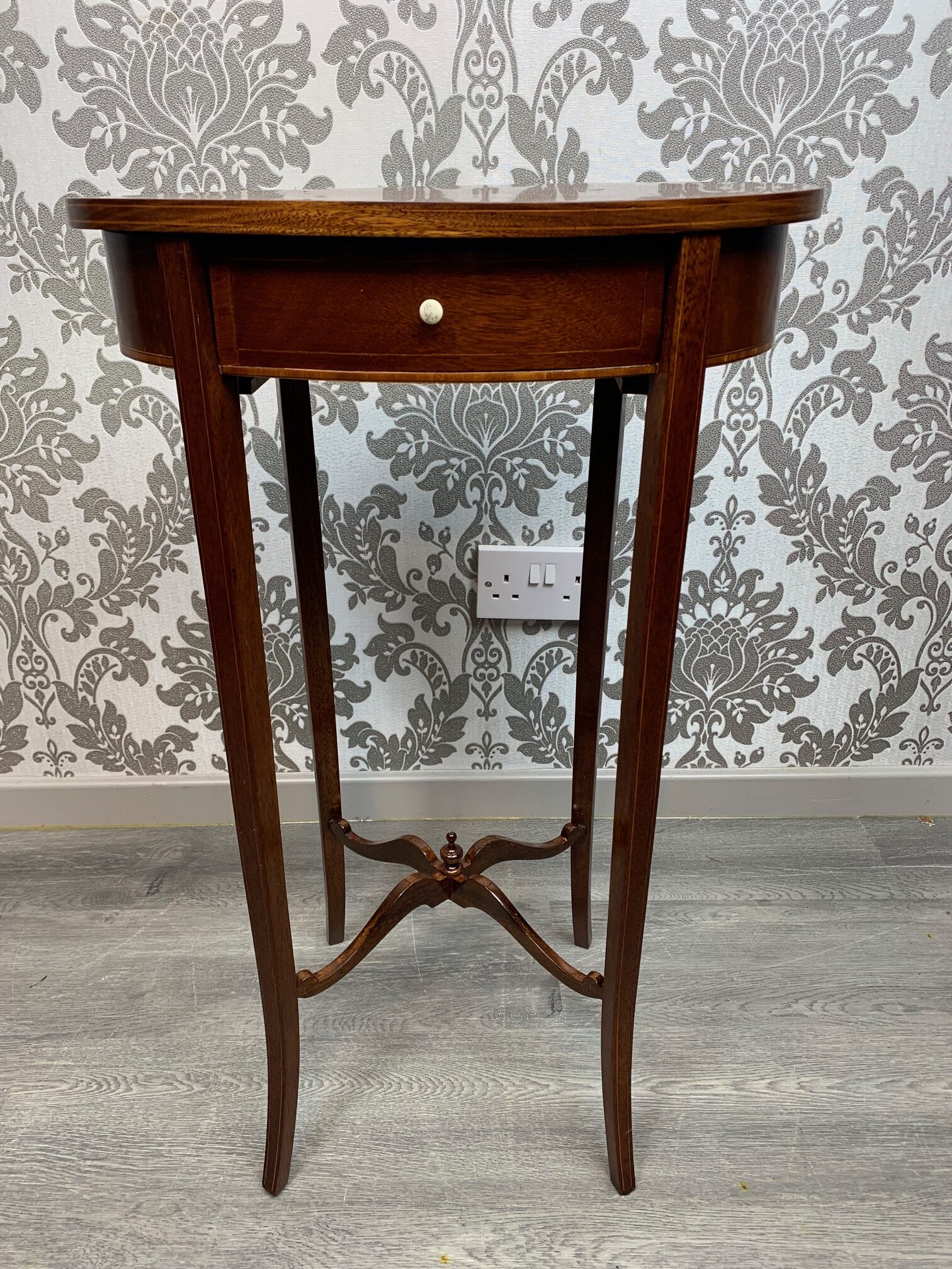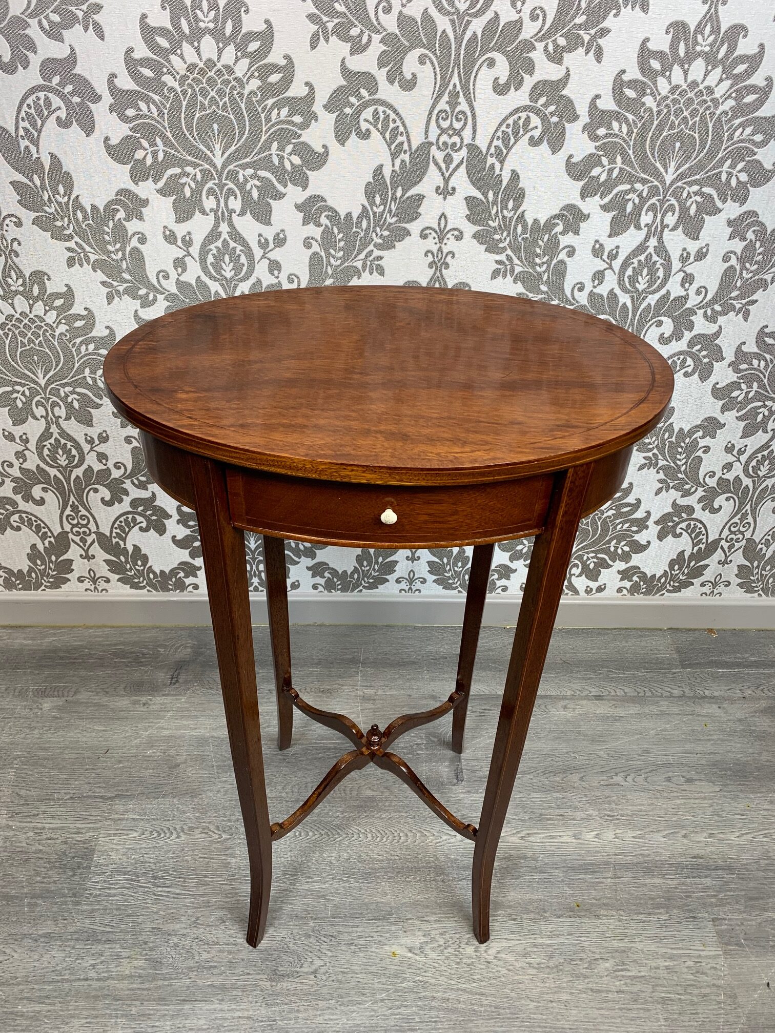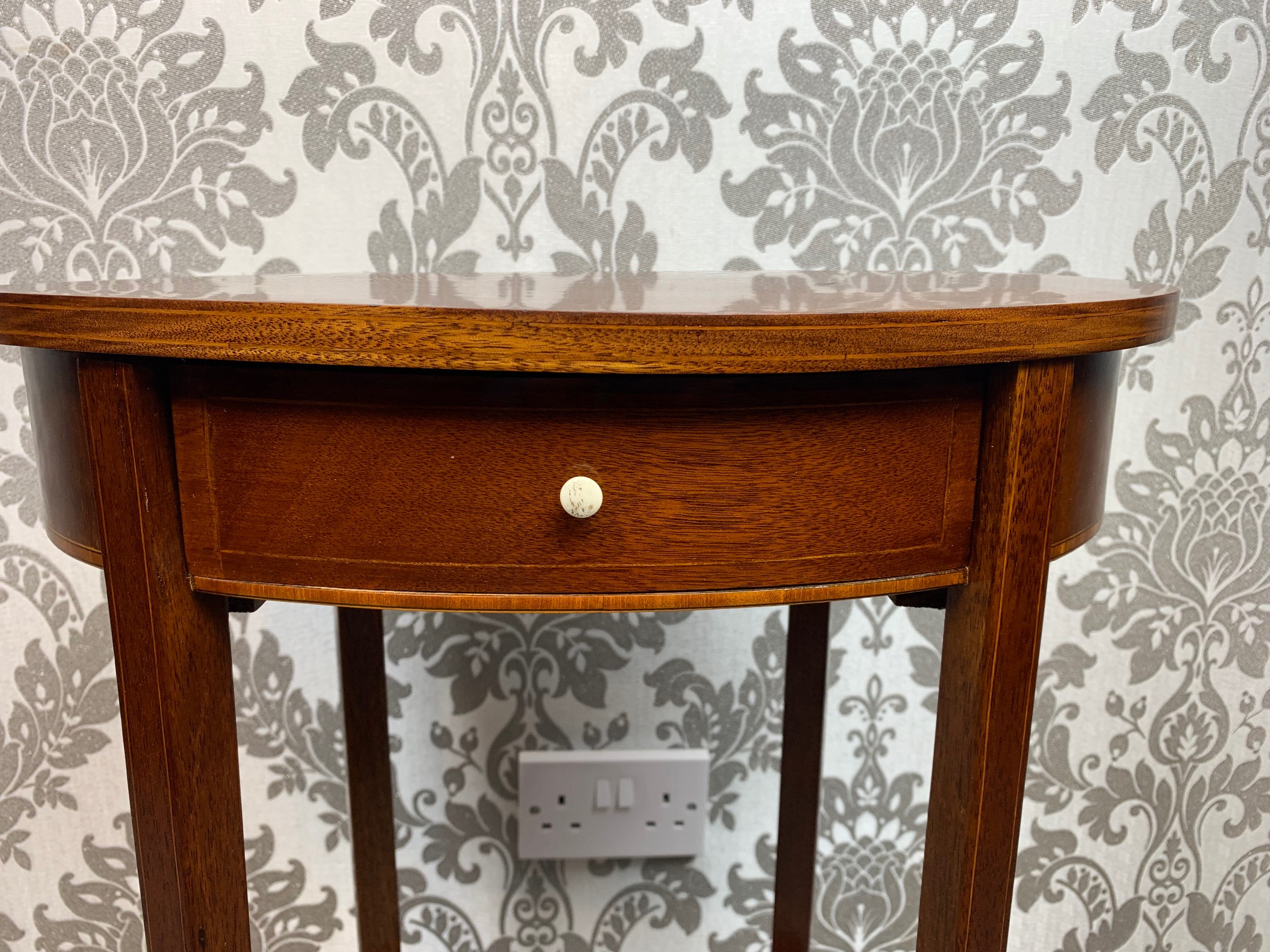 CompareAn Edwardian Period mahogany inlaid lamp table. Having an oval mahogany top above a bow front oak lined drawer with satinwood banding and raised on elegant splayed mahogany supports, united by a swept under tier with a turned finial. English circa 1900-1910 lovely condition