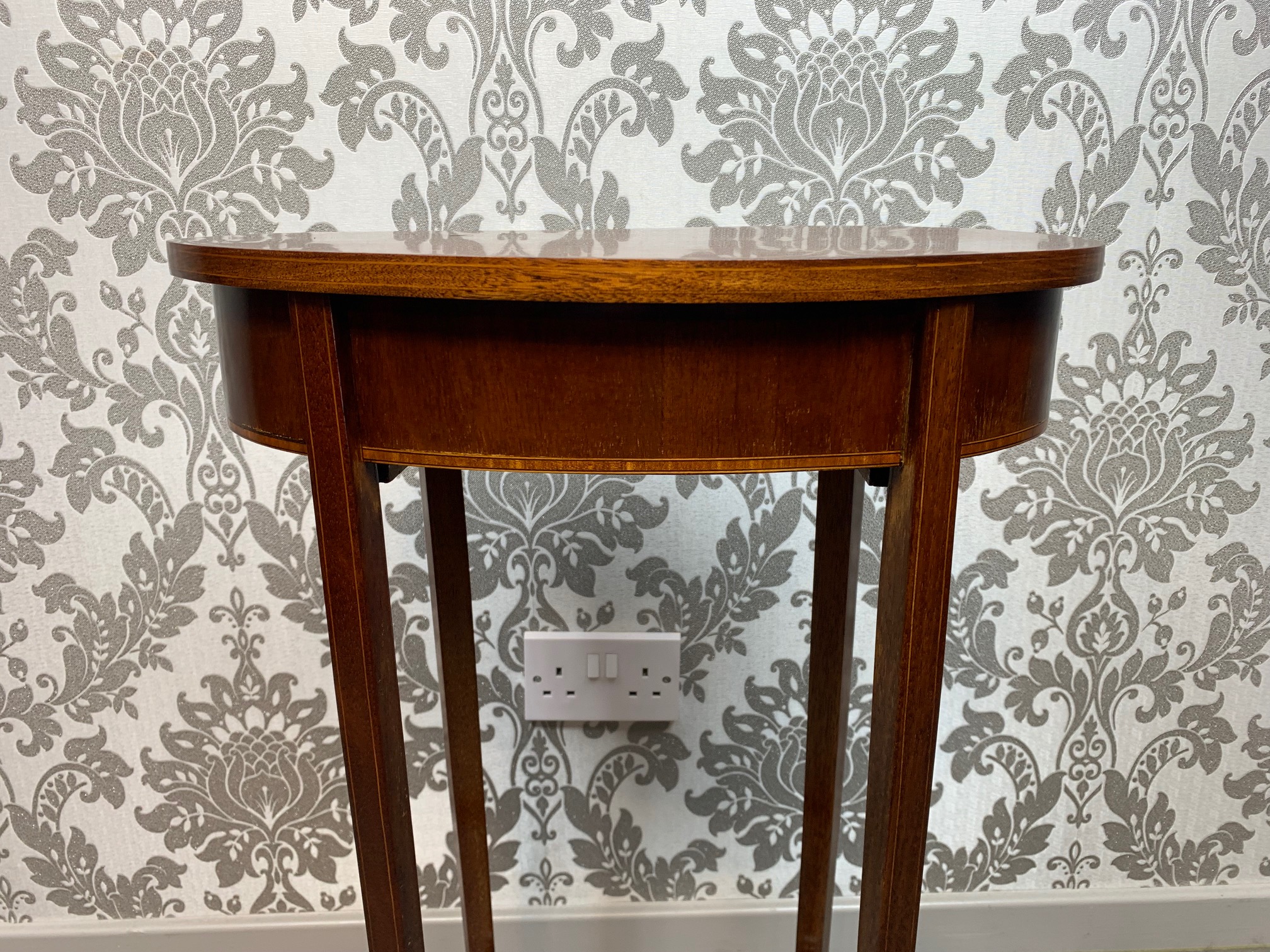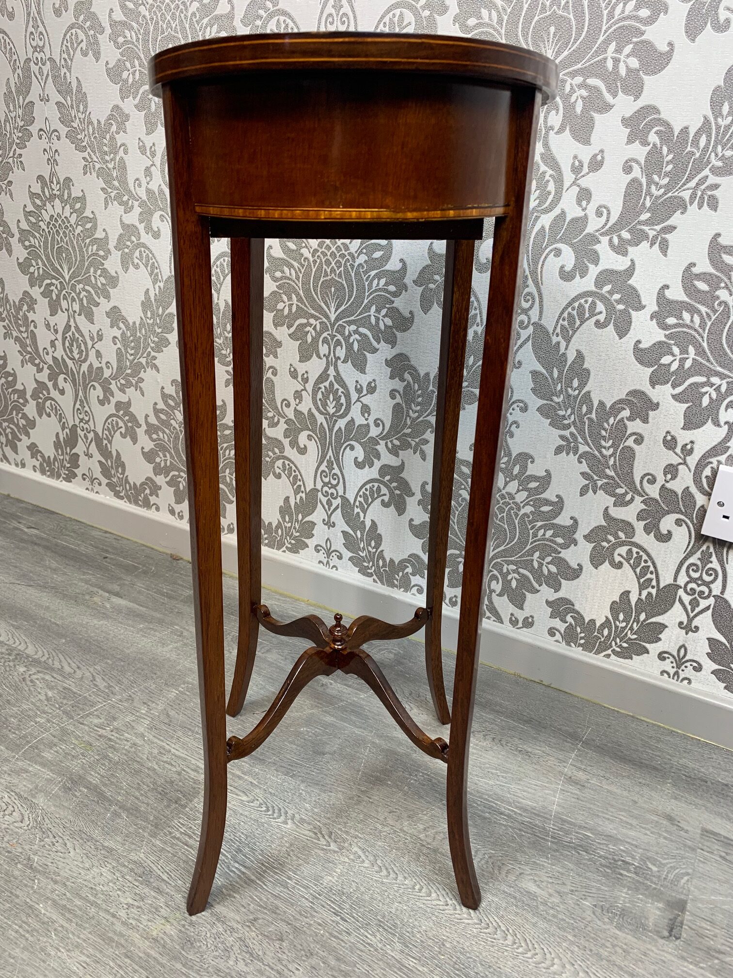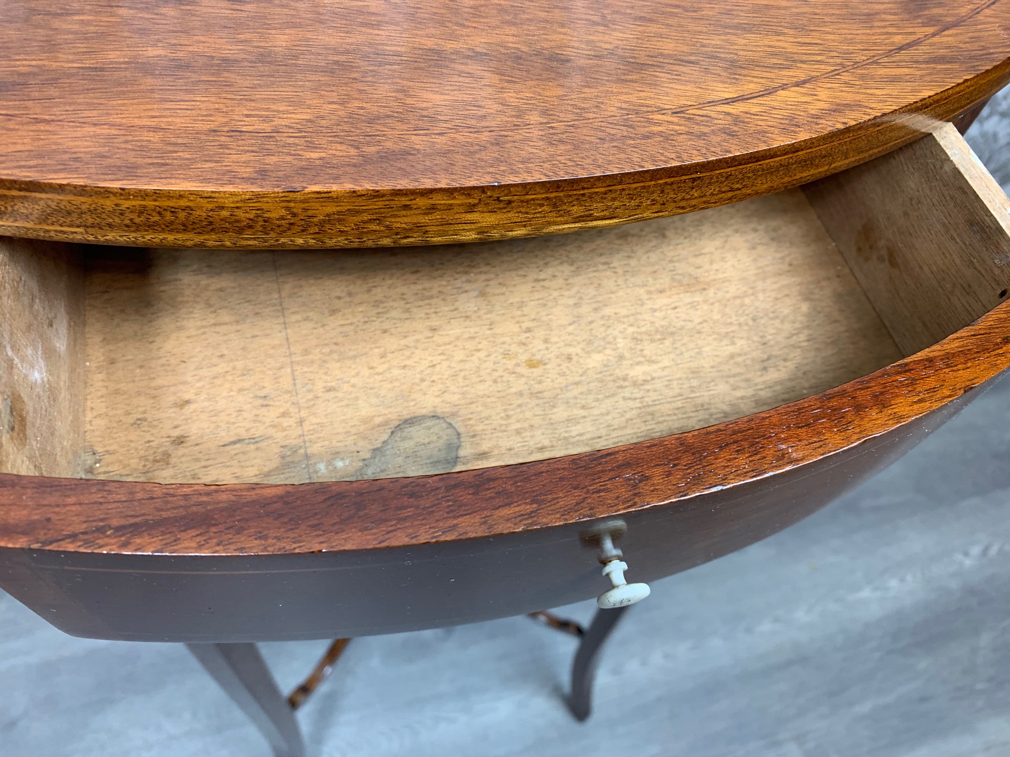 CompareAn Edwardian Period mahogany inlaid lamp table. Having an oval mahogany top above a bow front oak lined drawer with satinwood banding and raised on elegant splayed mahogany supports, united by a swept under tier with a turned finial. English circa 1900-1910 lovely condition