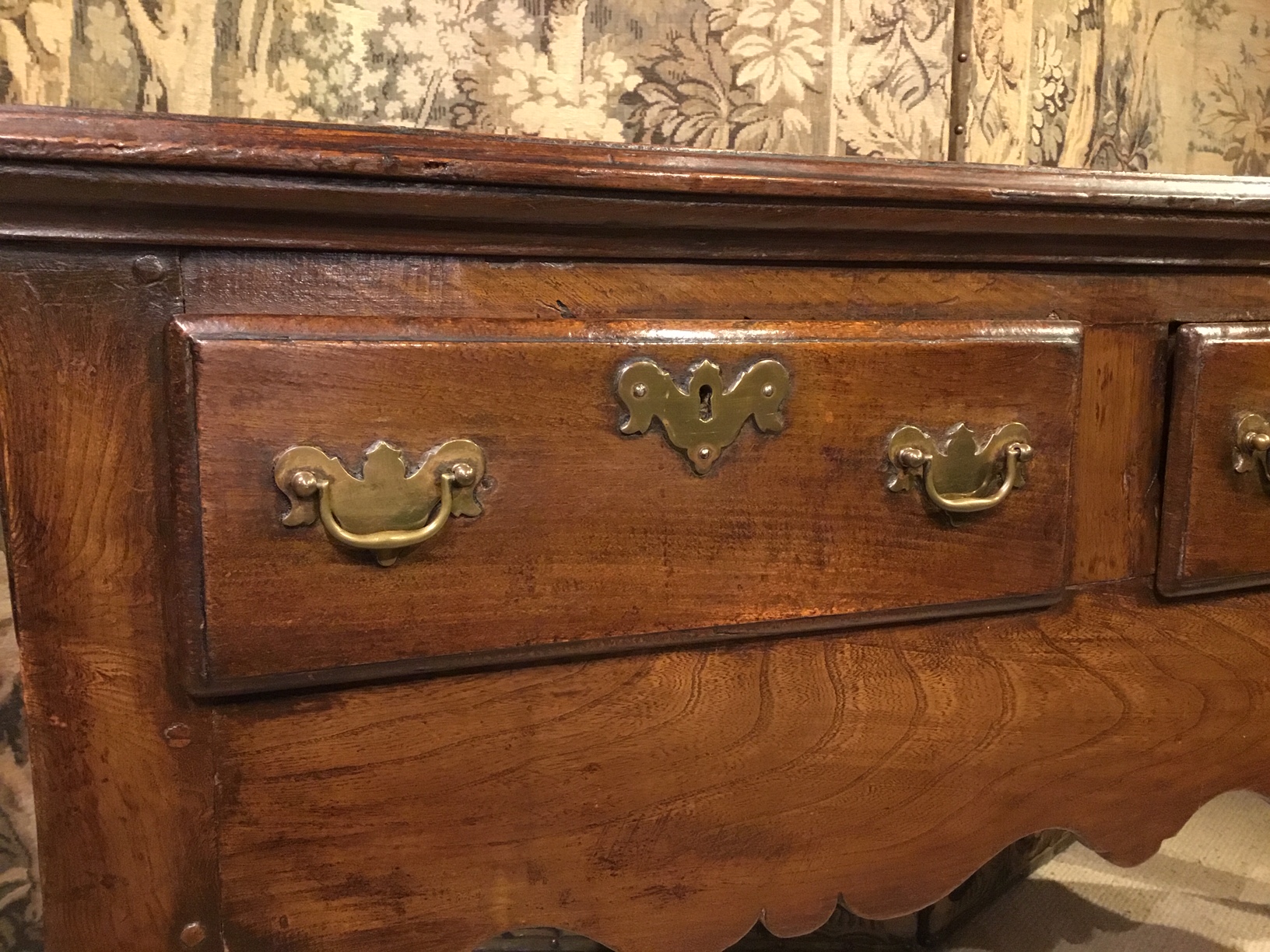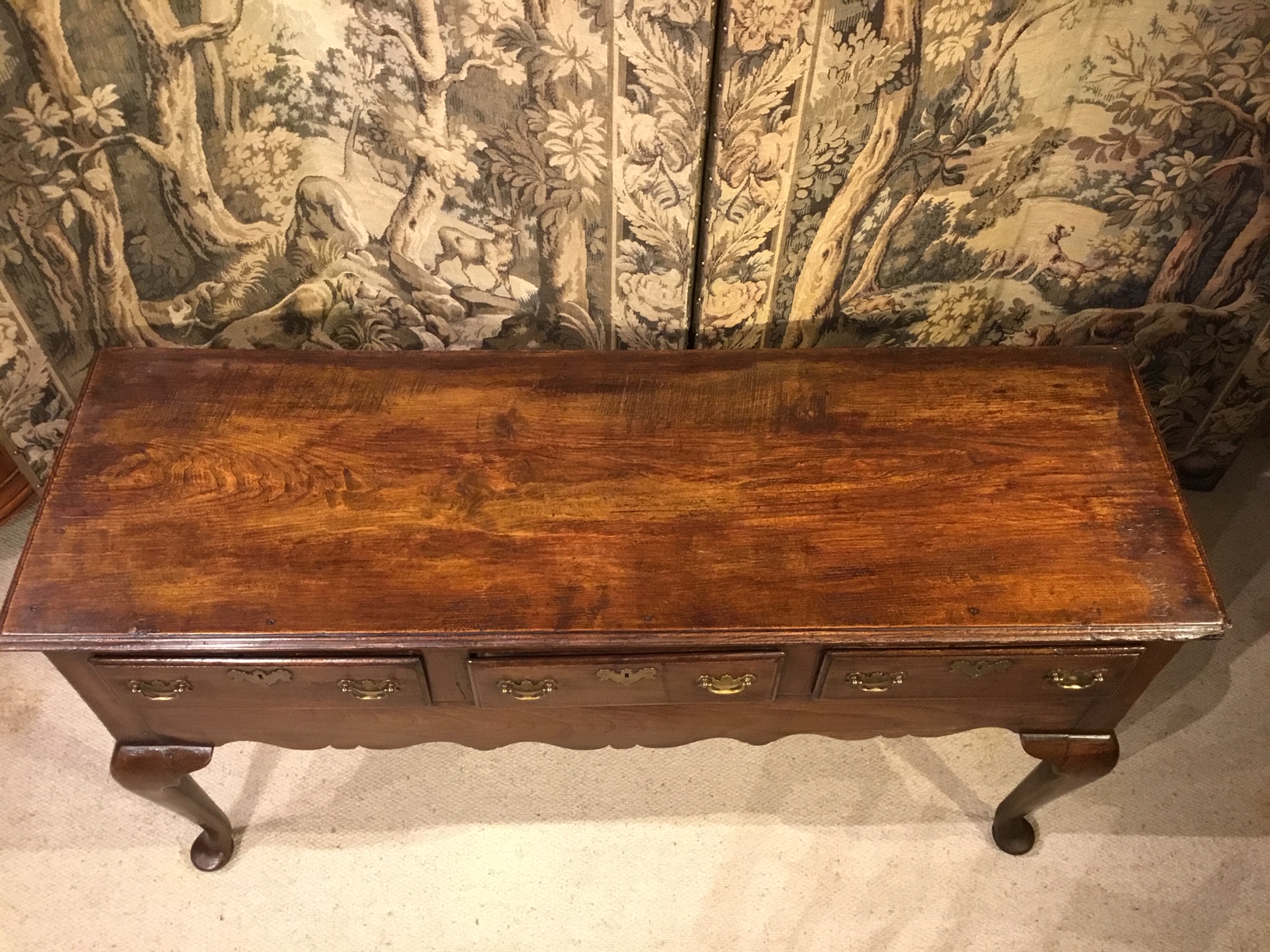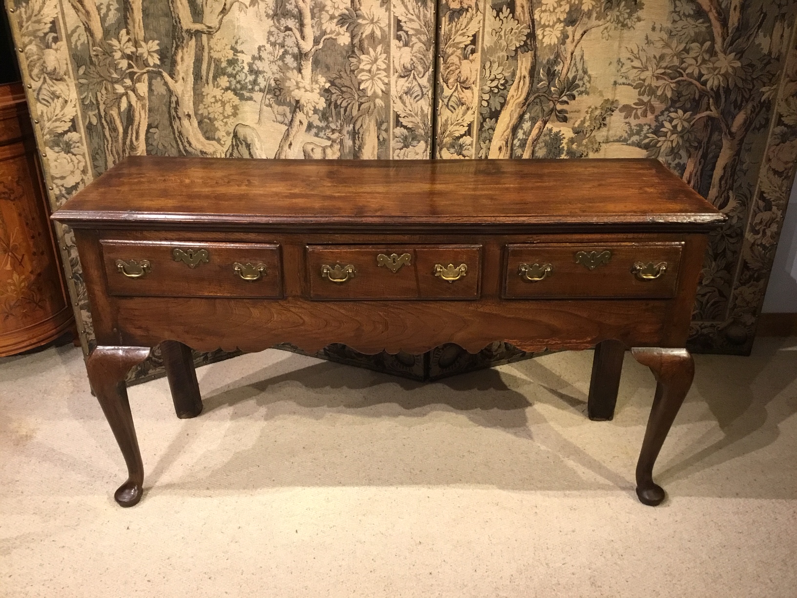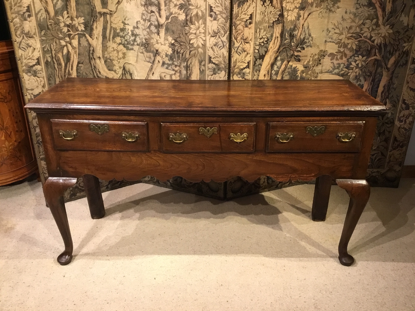 CompareAn elm George III Period cabriole leg dresser base. Having a rectangular single plank elm top above three rectangular frieze drawers with brass swan neck handles and escutcheons and having a wavy apron. Supported on front cabriole supports with pad feet and rear stile supports. English circa 1770-1780, in superb condition, a wonderful colour and patination. The handles are later replacements