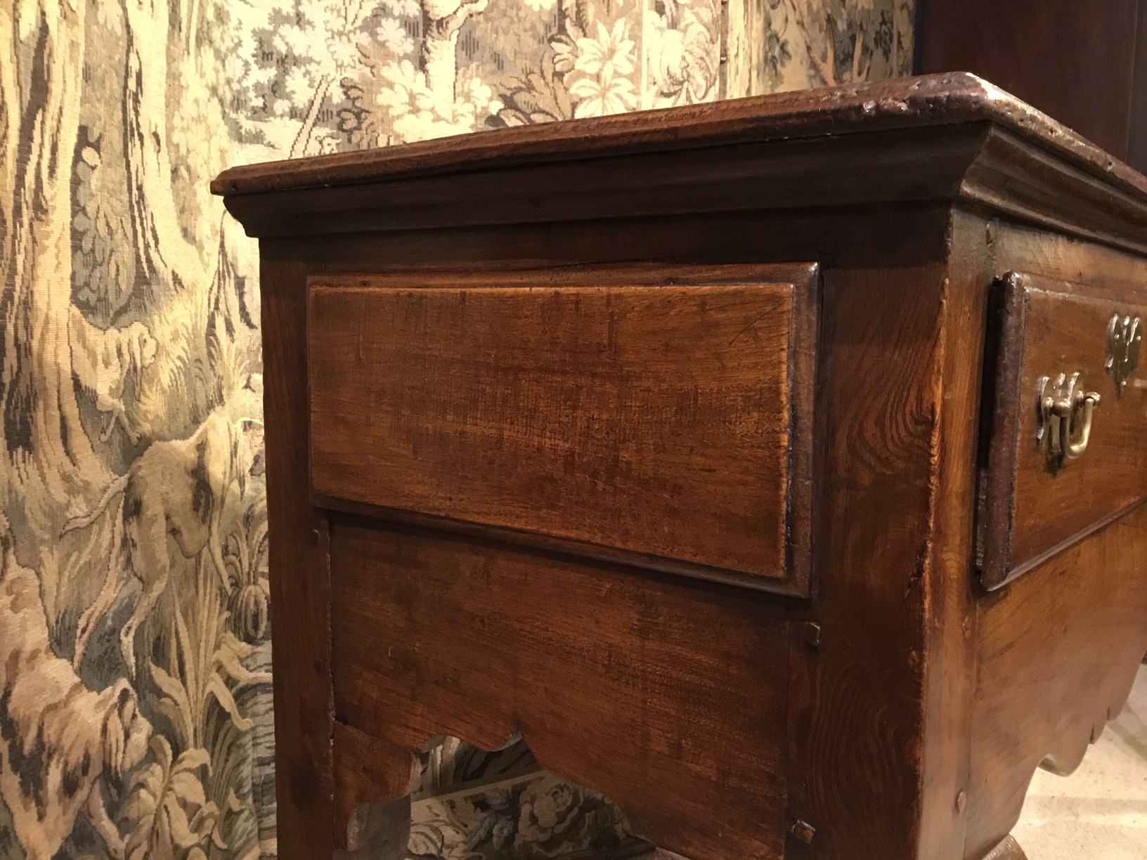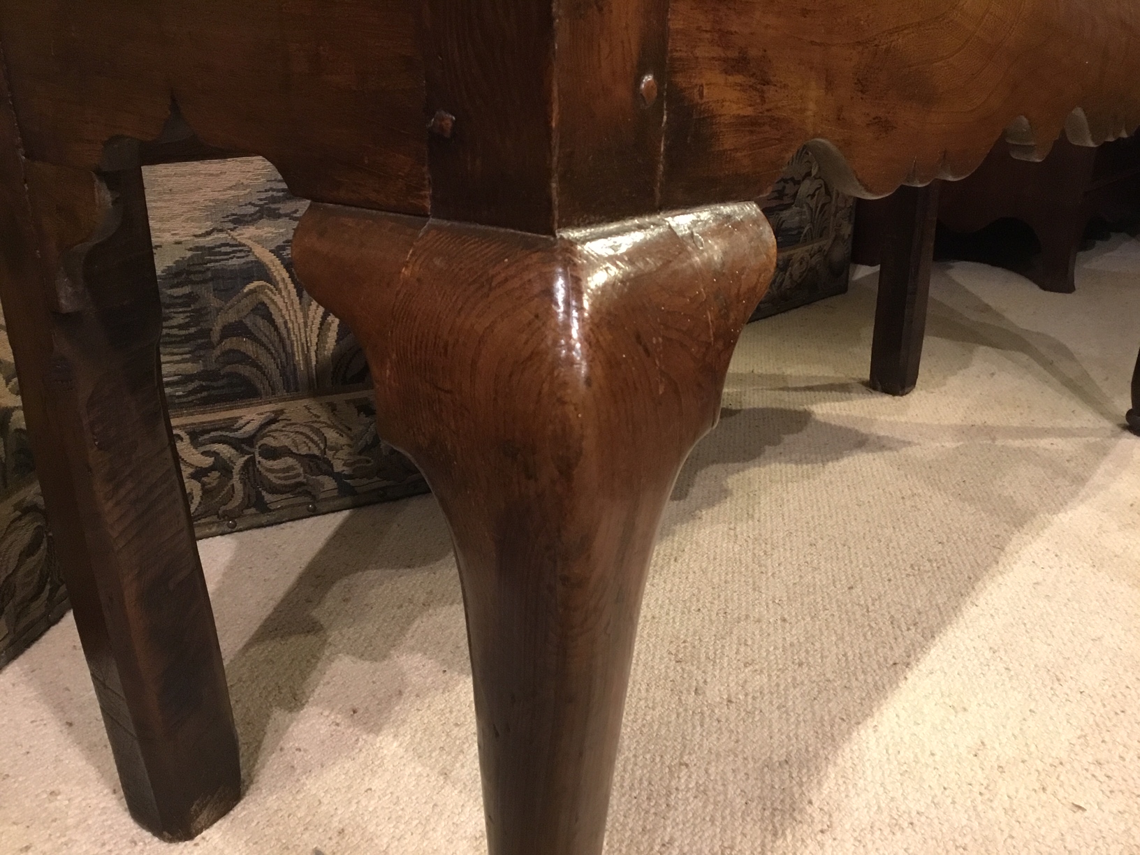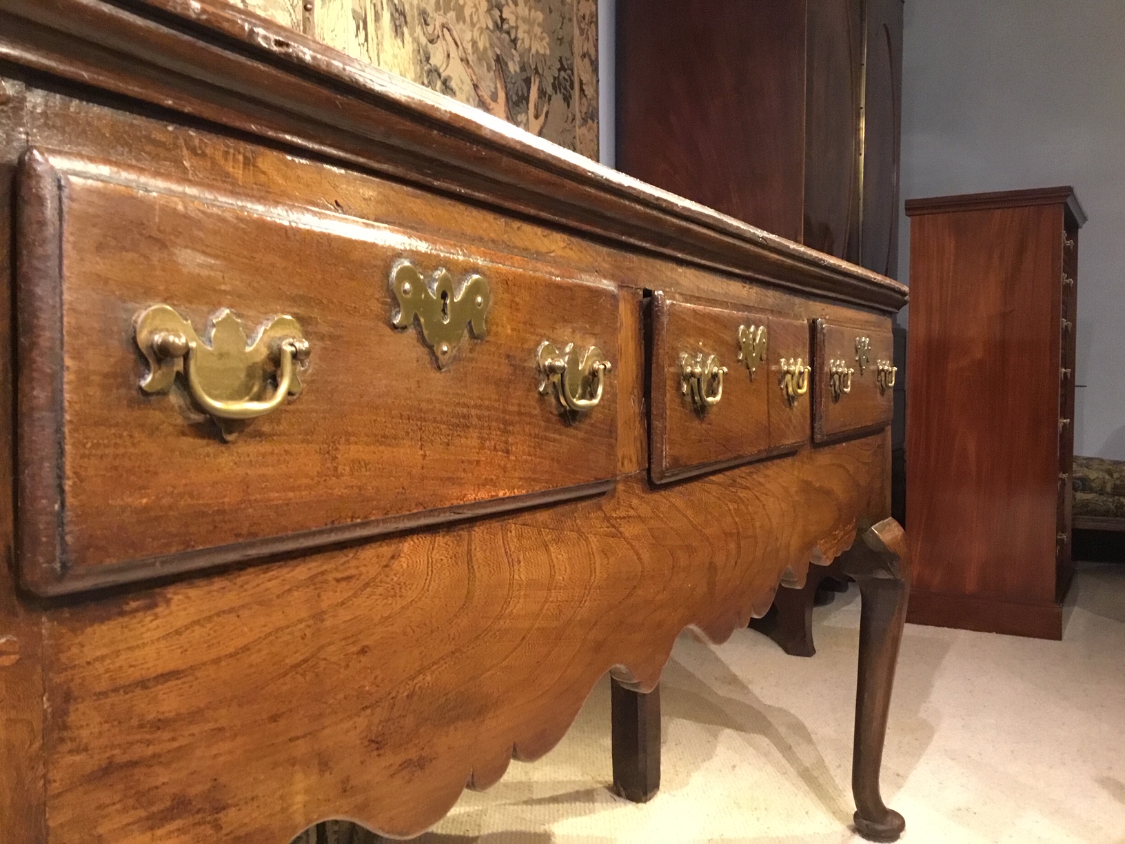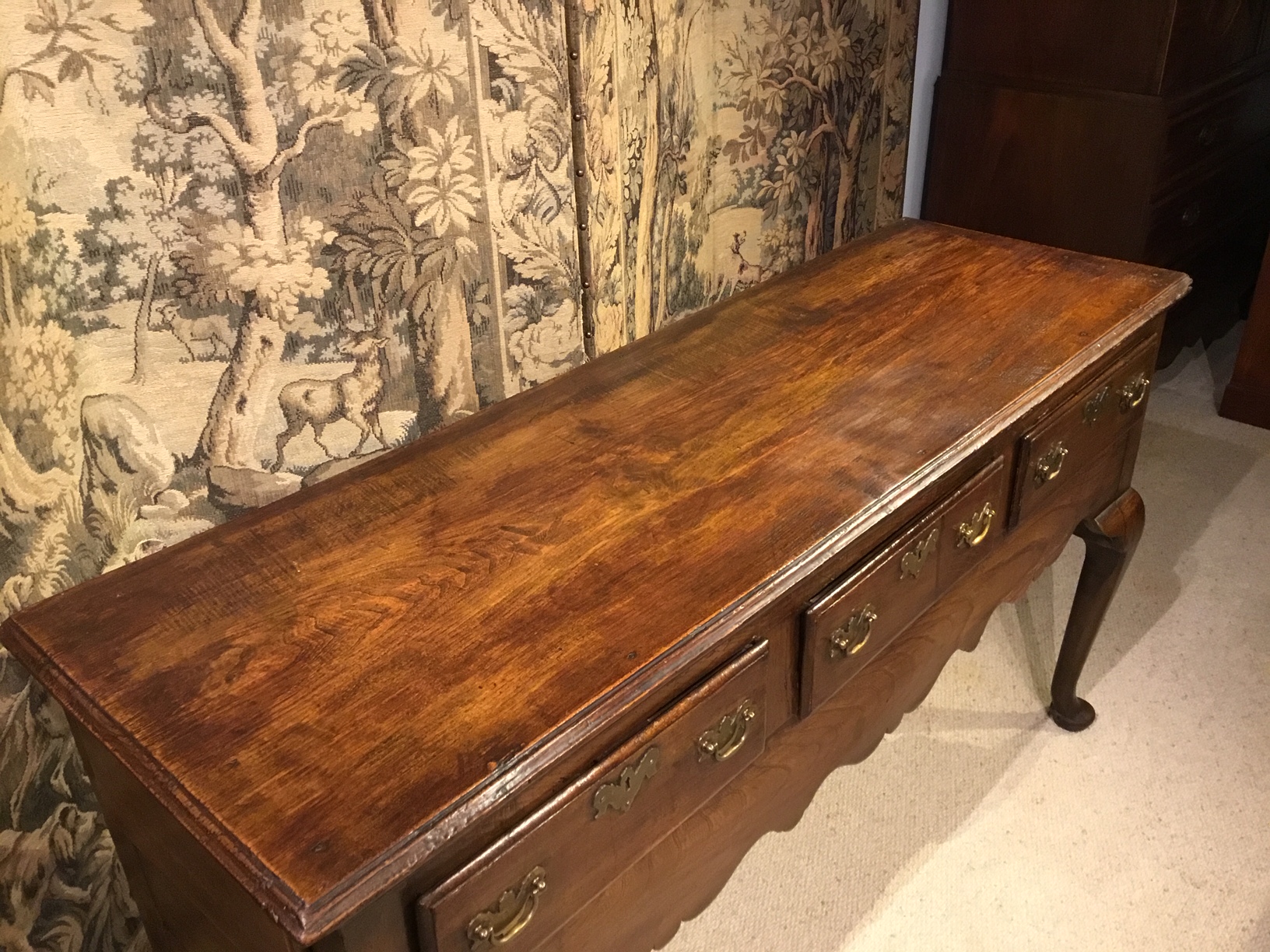 CompareAn elm George III Period cabriole leg dresser base. Having a rectangular single plank elm top above three rectangular frieze drawers with brass swan neck handles and escutcheons and having a wavy apron. Supported on front cabriole supports with pad feet and rear stile supports. English circa 1770-1780, in superb condition, a wonderful colour and patination. The handles are later replacements