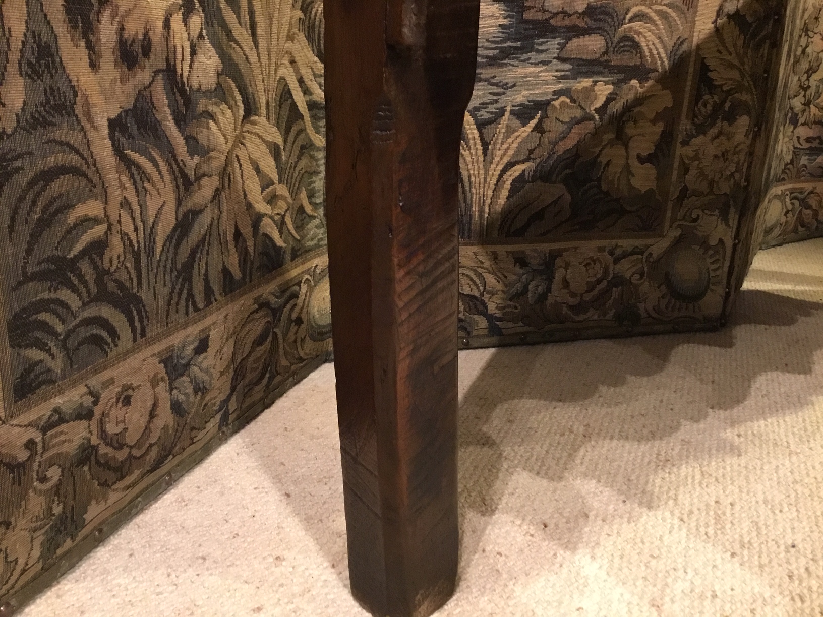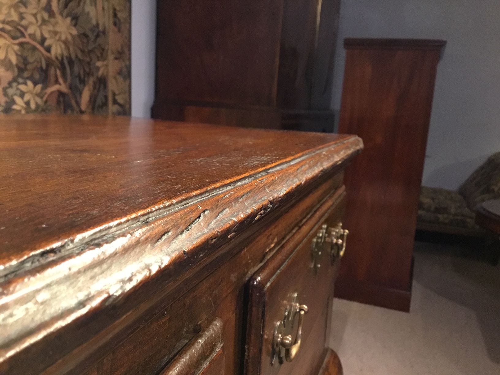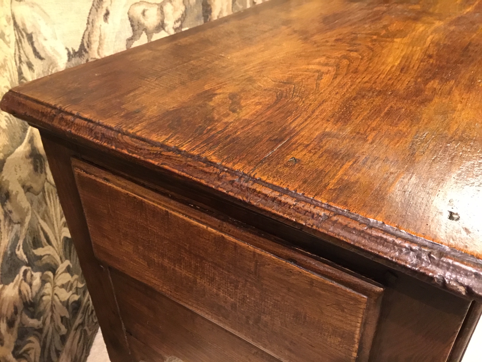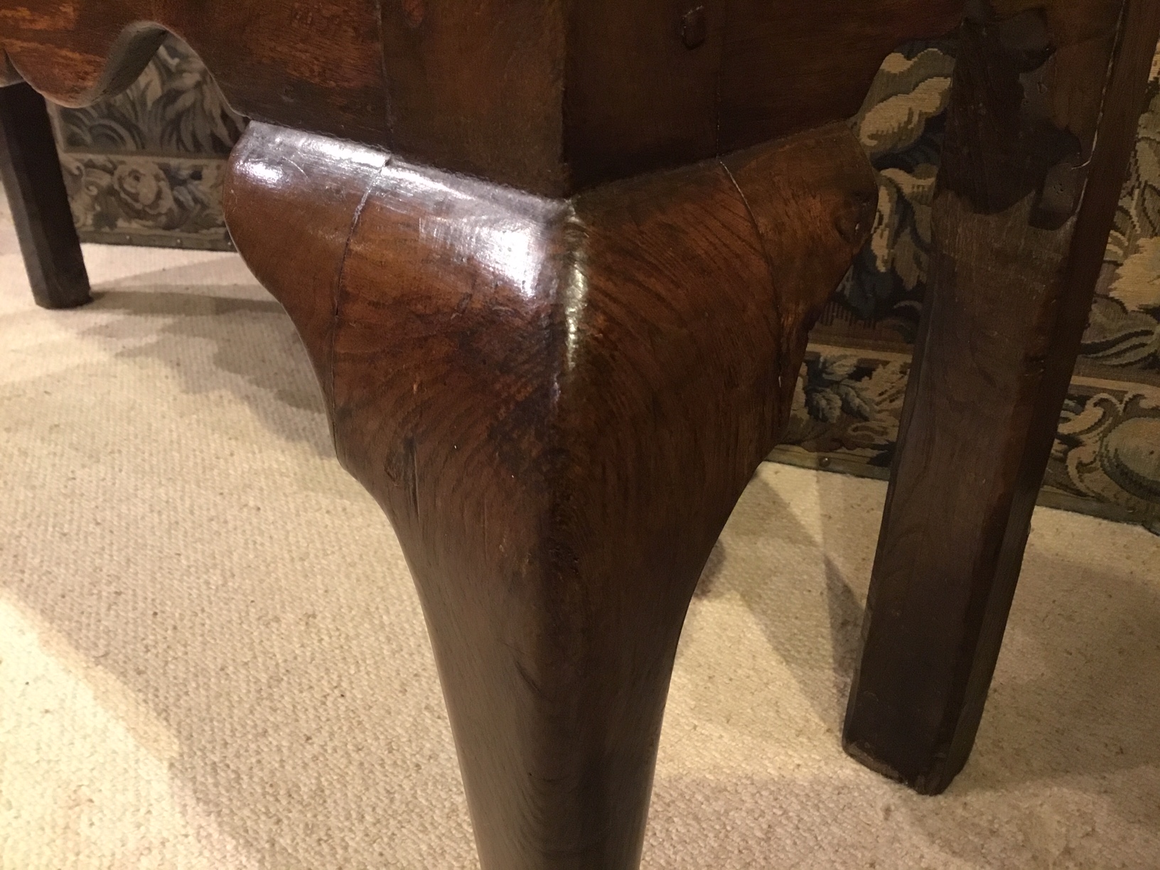 CompareAn elm George III Period cabriole leg dresser base. Having a rectangular single plank elm top above three rectangular frieze drawers with brass swan neck handles and escutcheons and having a wavy apron. Supported on front cabriole supports with pad feet and rear stile supports. English circa 1770-1780, in superb condition, a wonderful colour and patination. The handles are later replacements