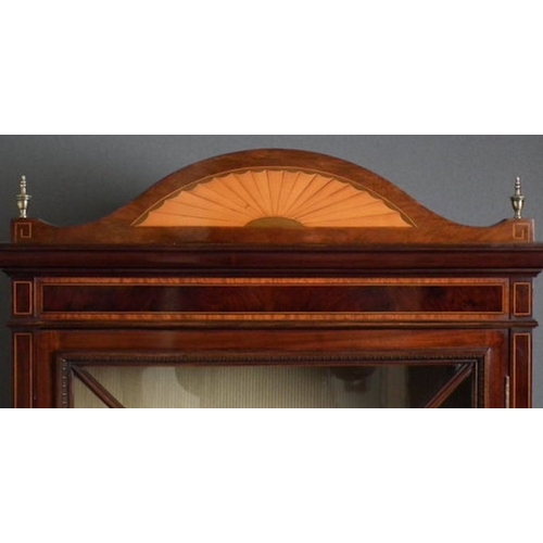 An excellent Edwardian Period Sheraton Revival mahogany antique display cabinet. The upper section having an arched pediment inlaid with a satinwood fan, flanked by brass finials above a flamed mahogany inlaid frieze. The astragal glazed door opening to reveal a lined shelved interior and flanked by cross banded, corner shelves. The lower section having a breakfront outline above a flamed mahogany cupboard door with satinwood spandrels and flanked by interlaced string inlay. Raised upon tapering legs united by serpentine shelf. This outstanding display cabinet is in fantastic original condition. English Circa 1900