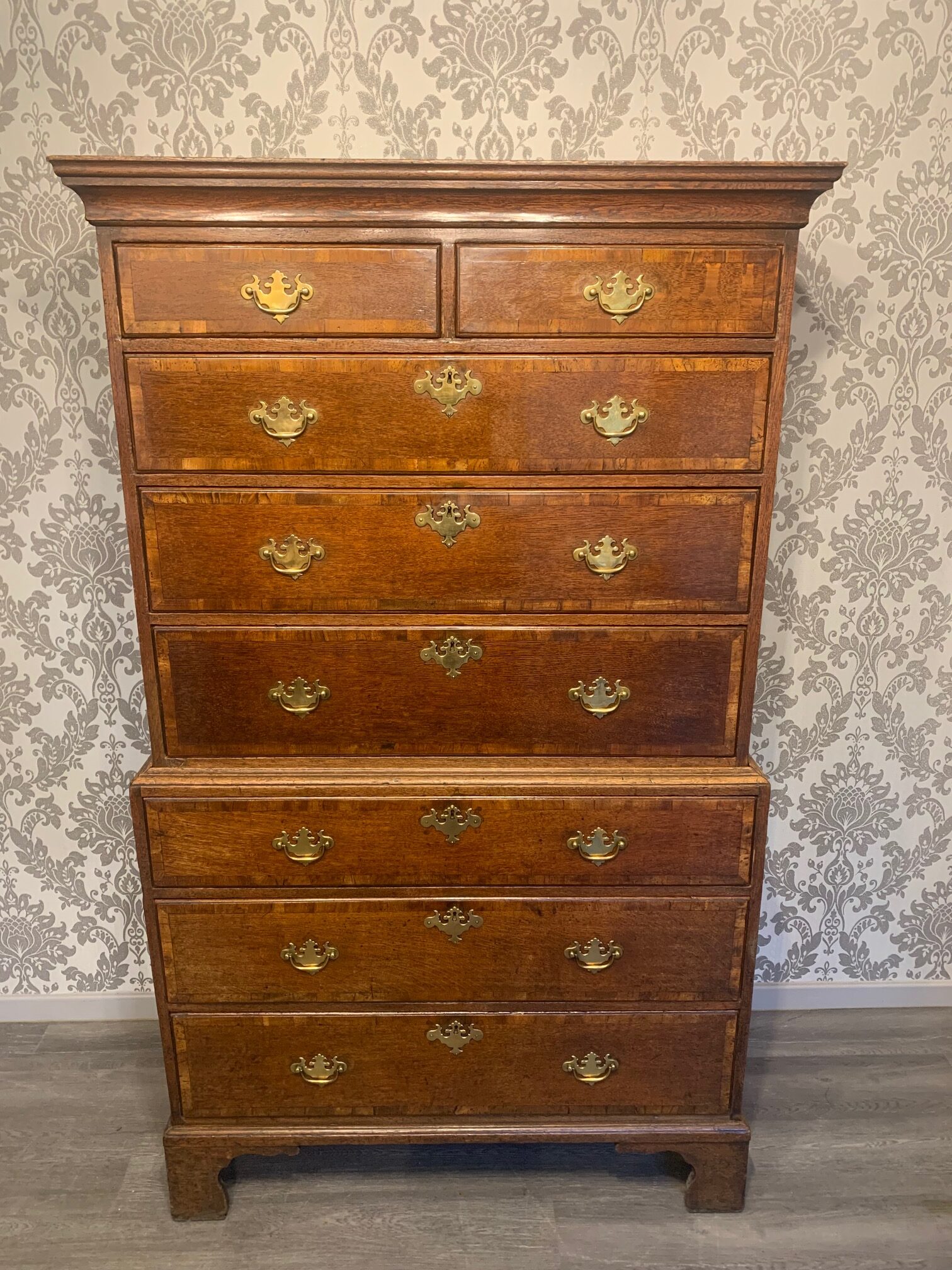 CompareAn oak and walnut banded George III Period antique chest on chest. The upper section having a cavetto moulded cornice above an arrangement of two short and three long rectangular oak lined drawers, each with Period brass swan neck handles and escutcheons. The lower section again with three rectangular walnut banded drawers, the whole raised on the original shaped bracket feet with solid oak sides. English circa 1780-1800, in superb original condition, a fine colour and patination