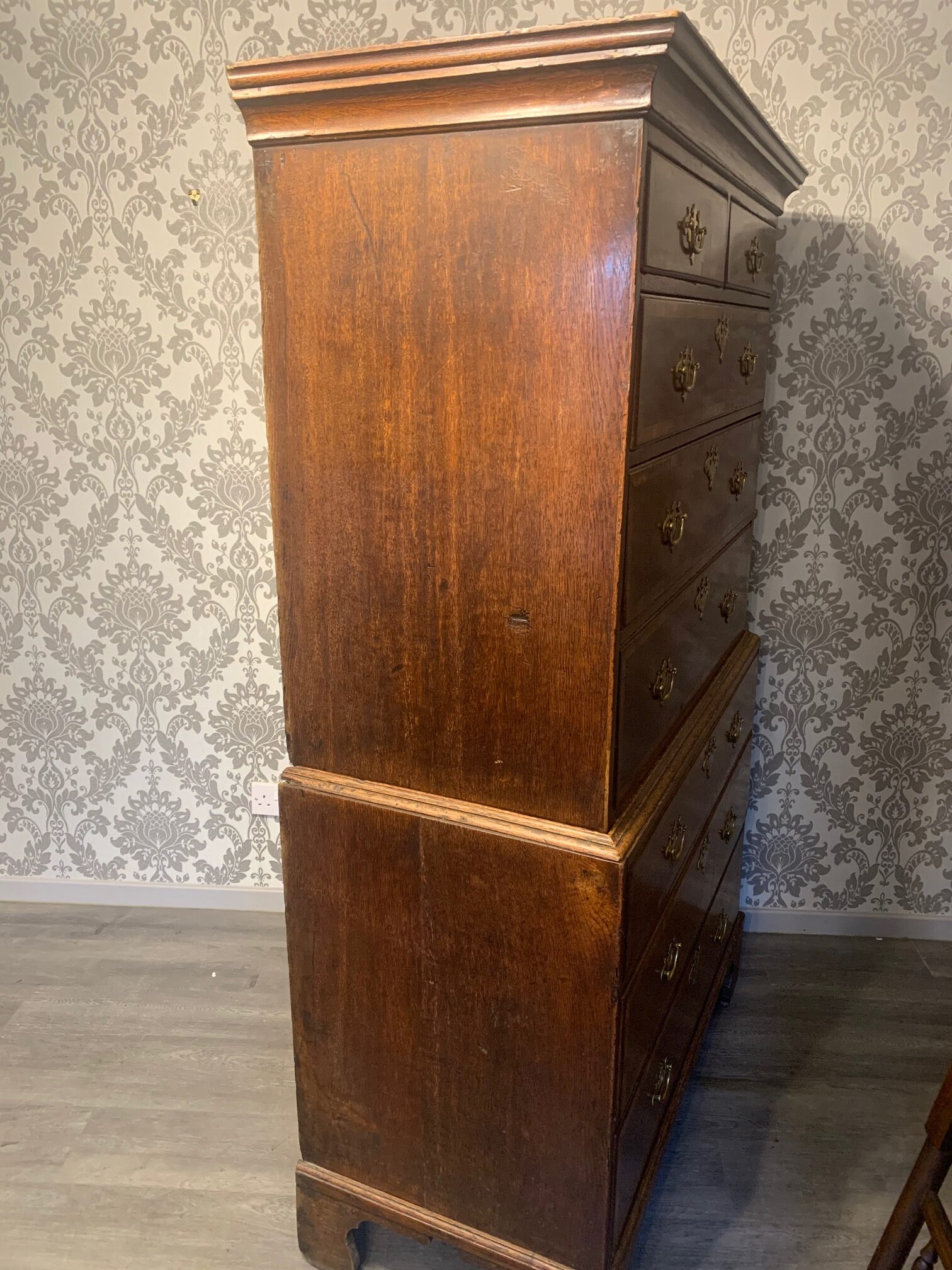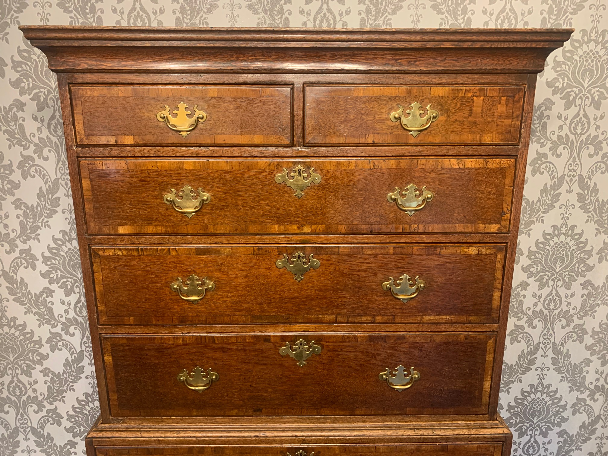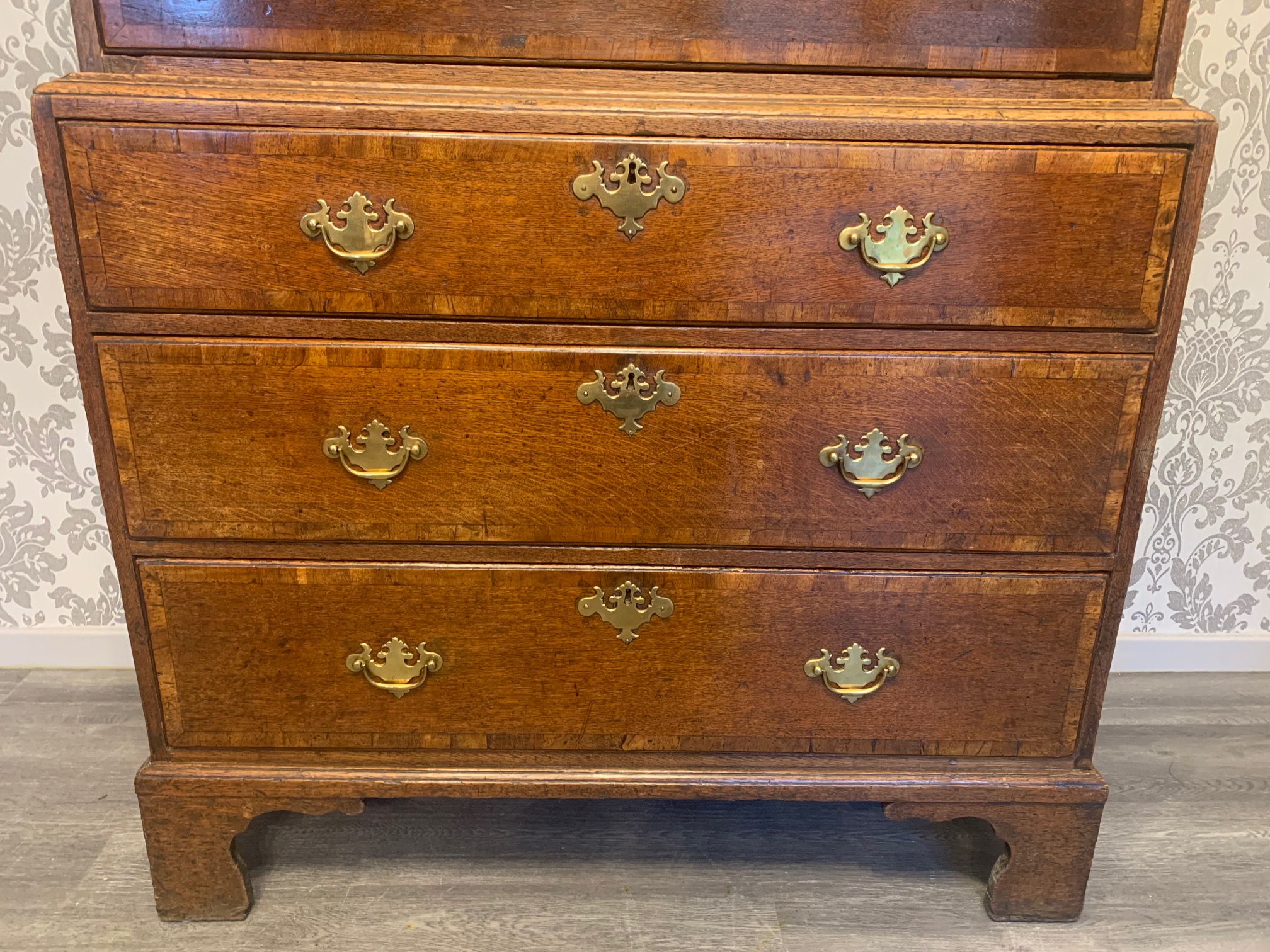 An oak and walnut banded George III Period antique chest on chest.
