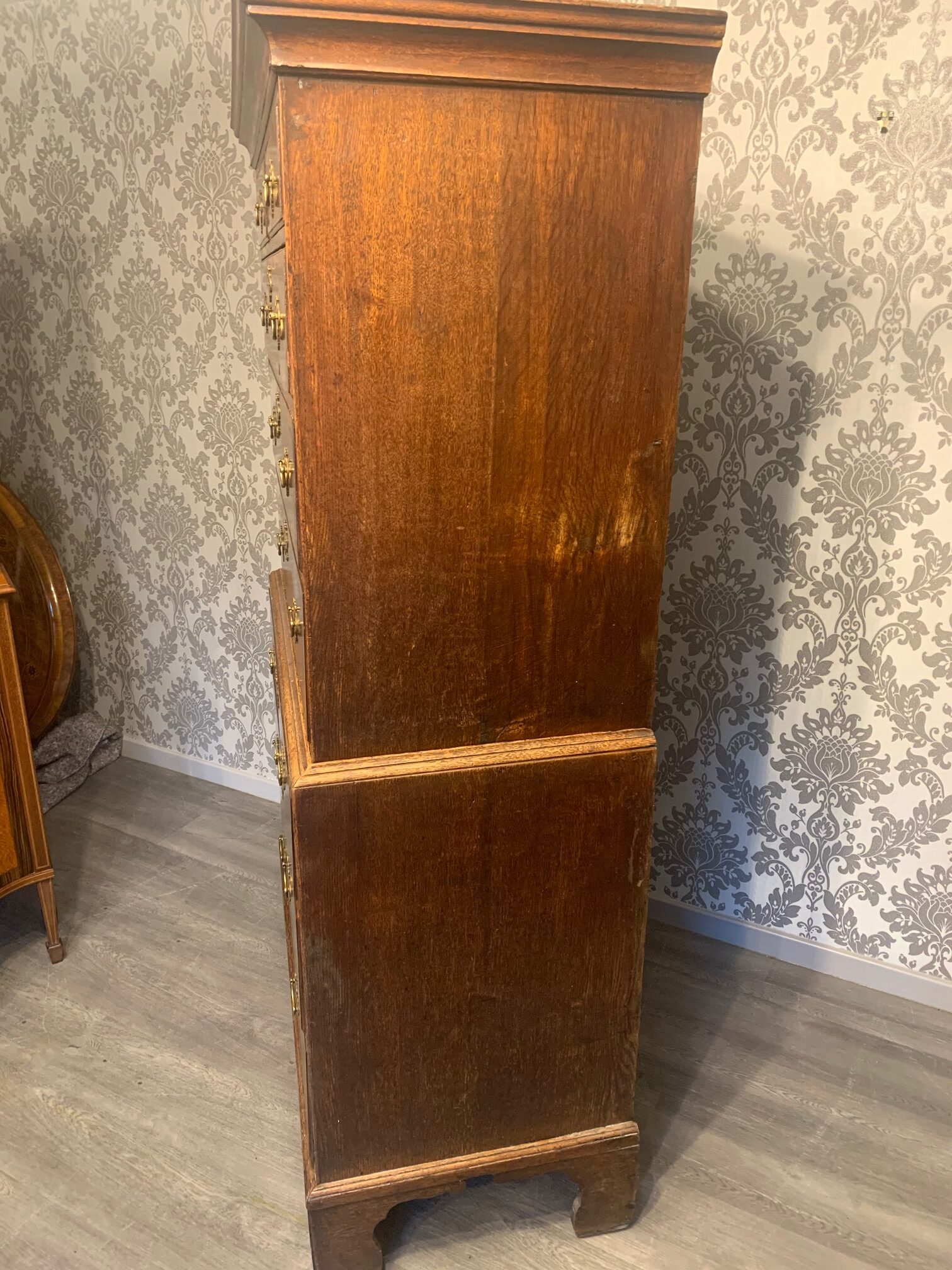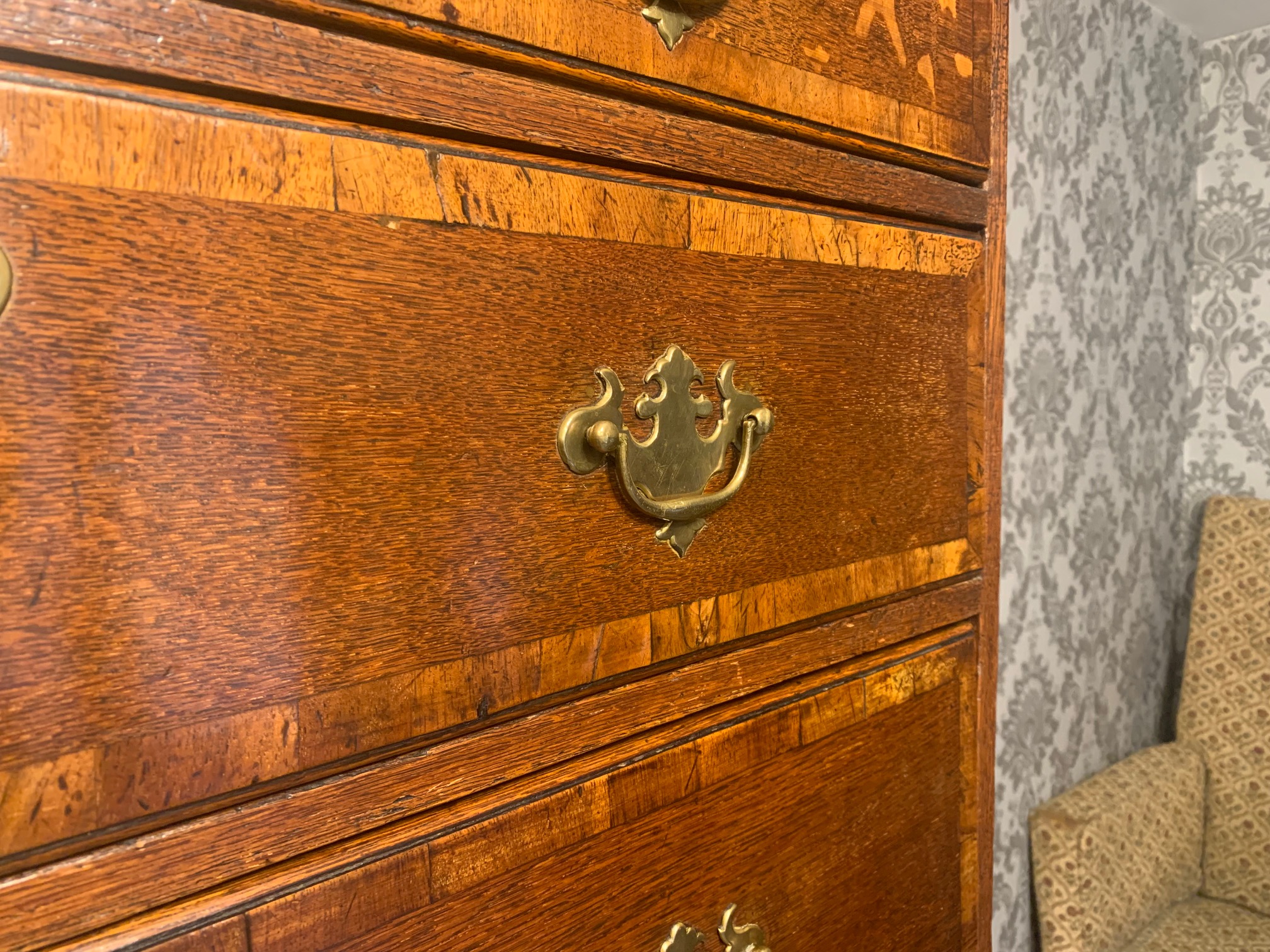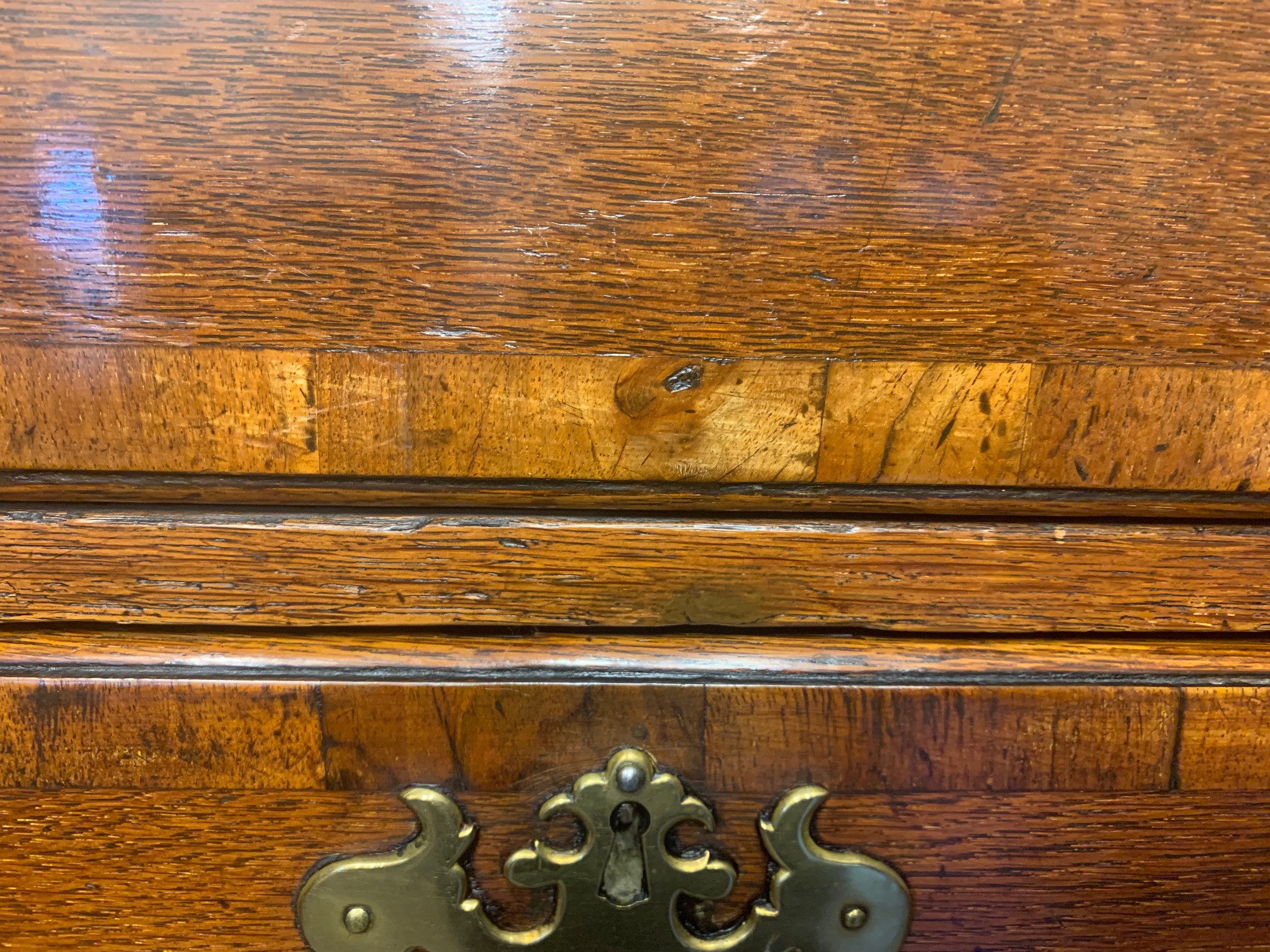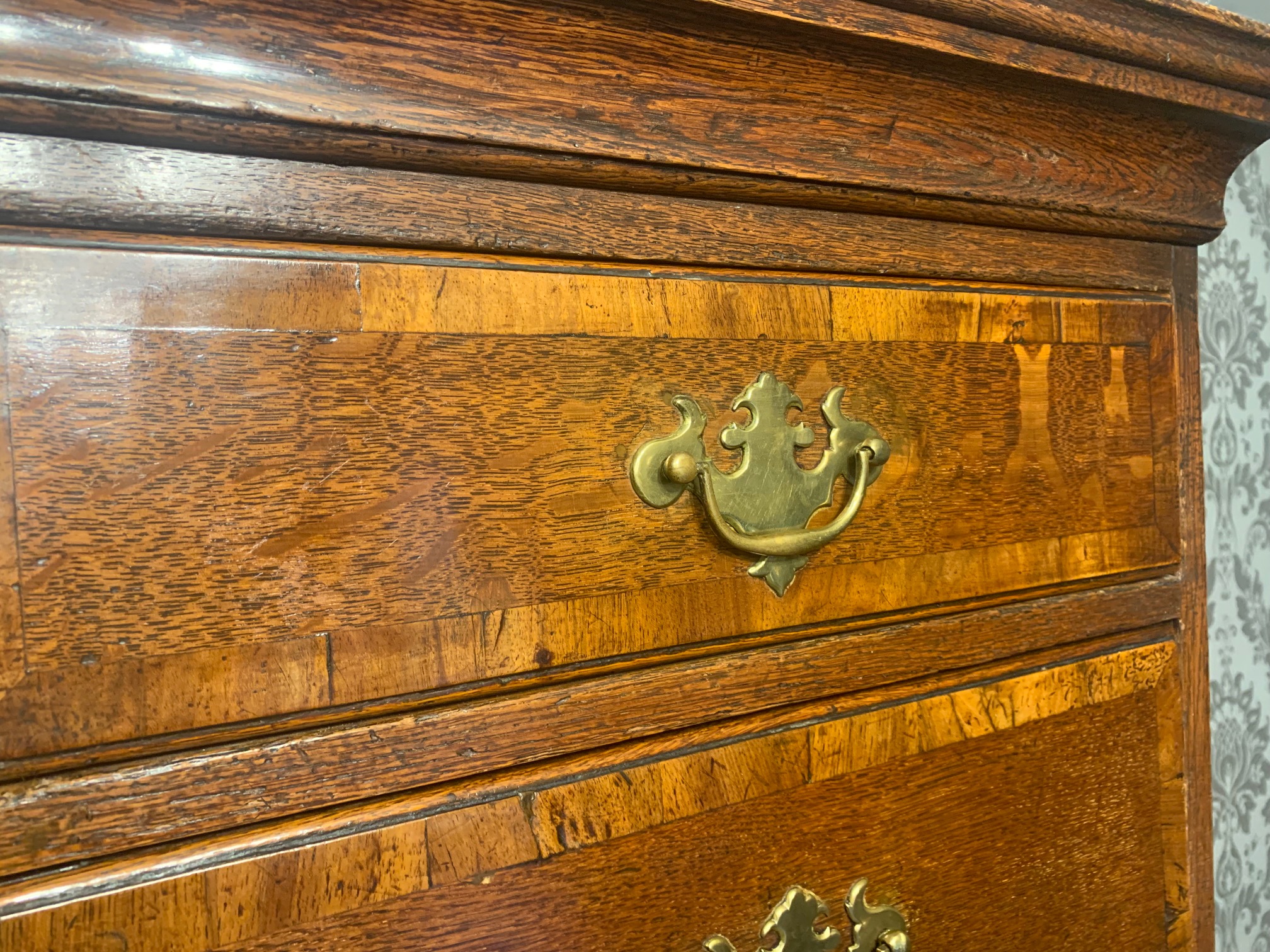 An oak and walnut banded George III Period antique chest on chest