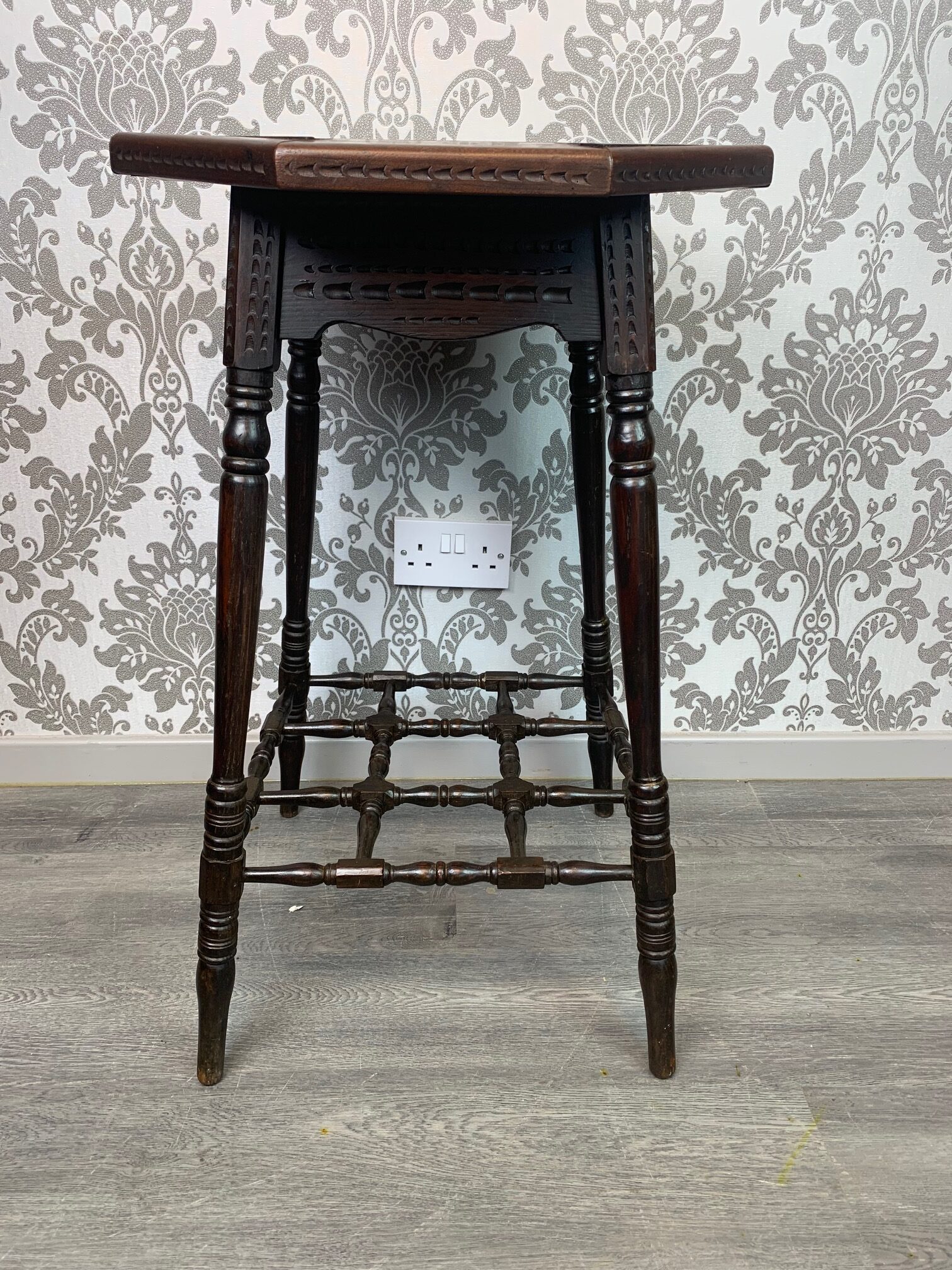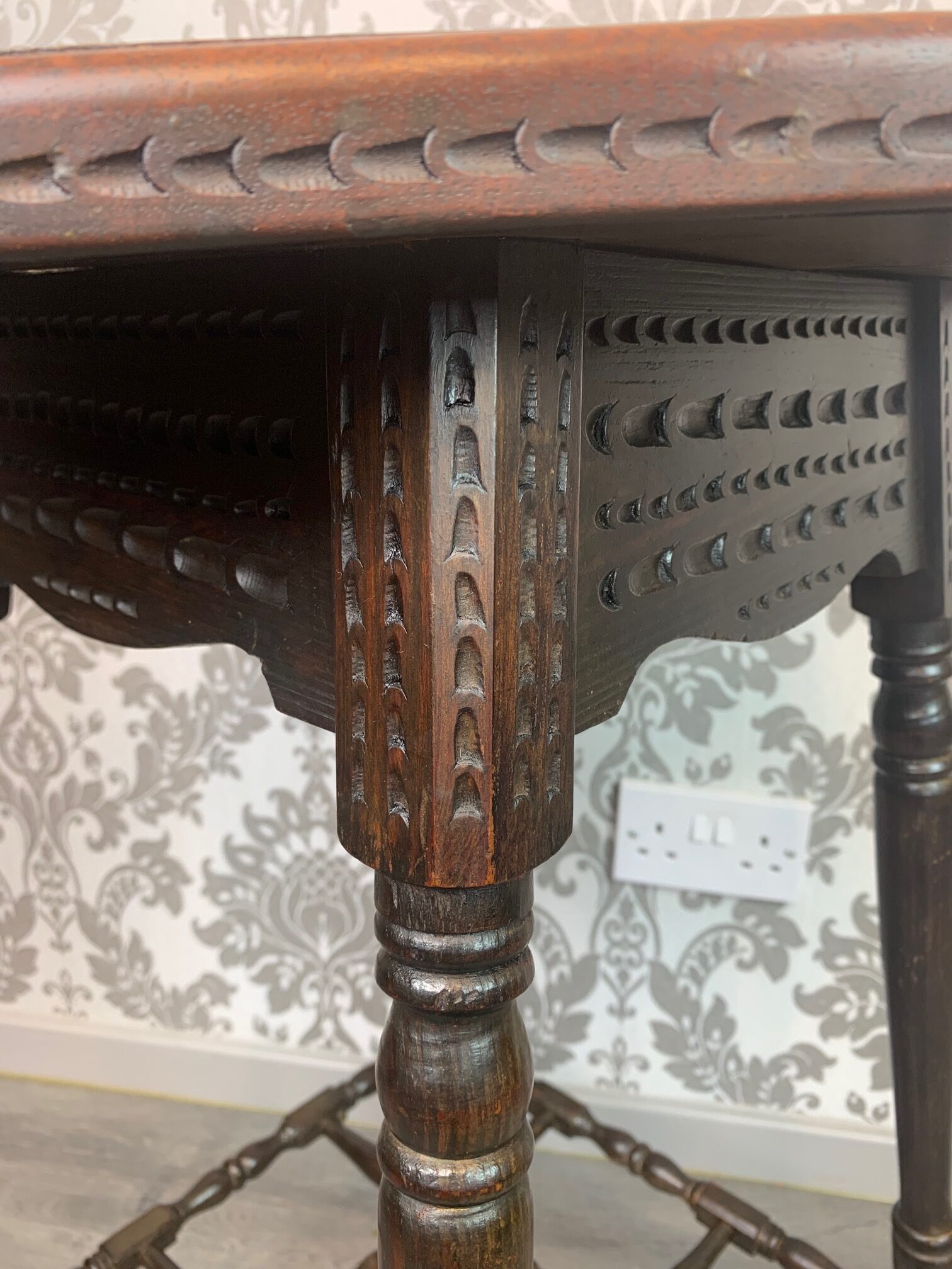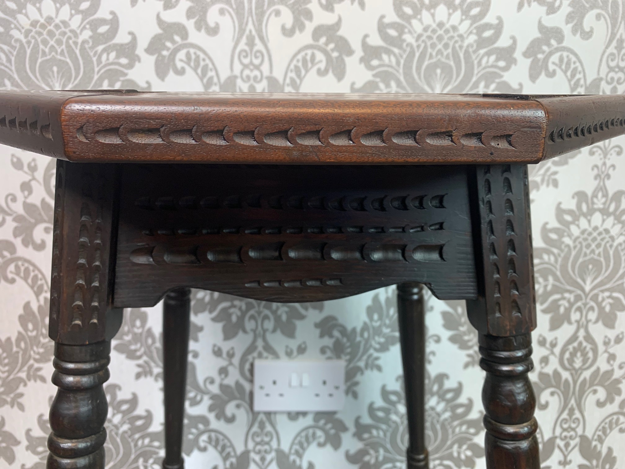 CompareAn unusual Aesthetic Period octagonal parquetry inlaid table. The octagonal top with parquetry inlaid detail in a variety of woods including mahogany, elm, oak and satinwood. The top with chip carved detail to the edge which is repeated on the underside on the top of the turned legs, united by a complicated spindled under tier reminiscent of Liberty and Sons or Howard and Sons, London. English circa 1880-1900