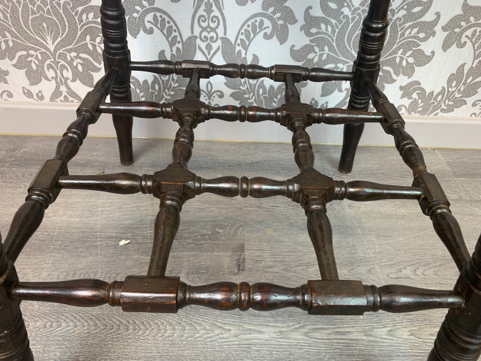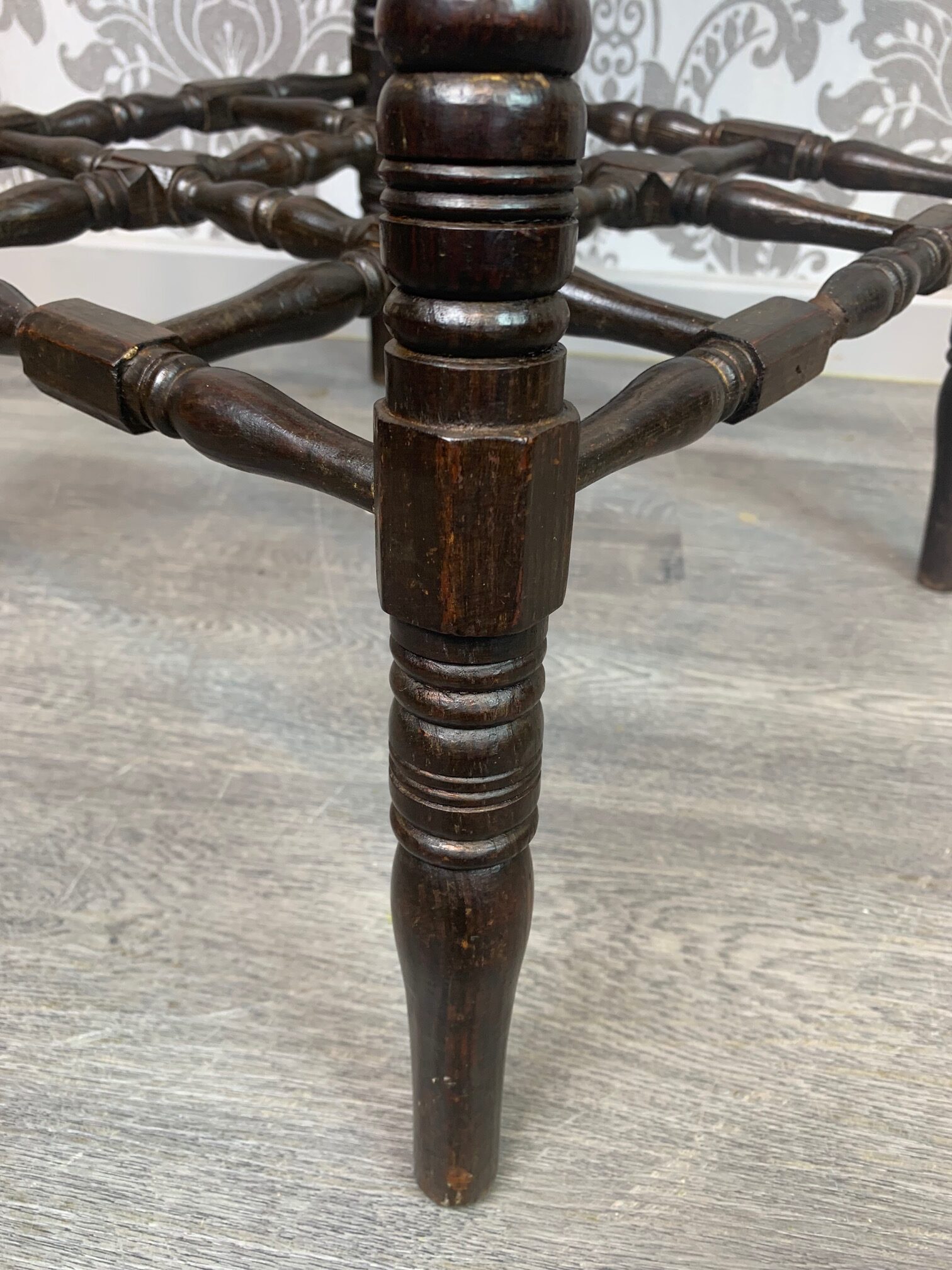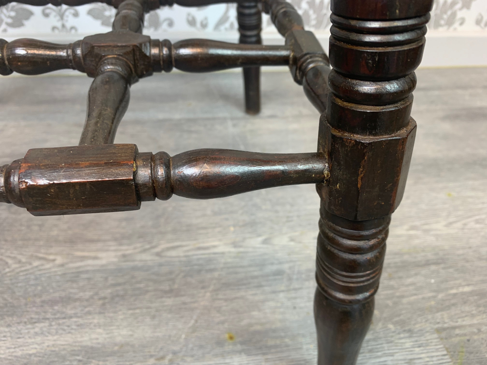 CompareAn unusual Aesthetic Period octagonal parquetry inlaid table. The octagonal top with parquetry inlaid detail in a variety of woods including mahogany, elm, oak and satinwood. The top with chip carved detail to the edge which is repeated on the underside on the top of the turned legs, united by a complicated spindled under tier reminiscent of Liberty and Sons or Howard and Sons, London. English circa 1880-1900